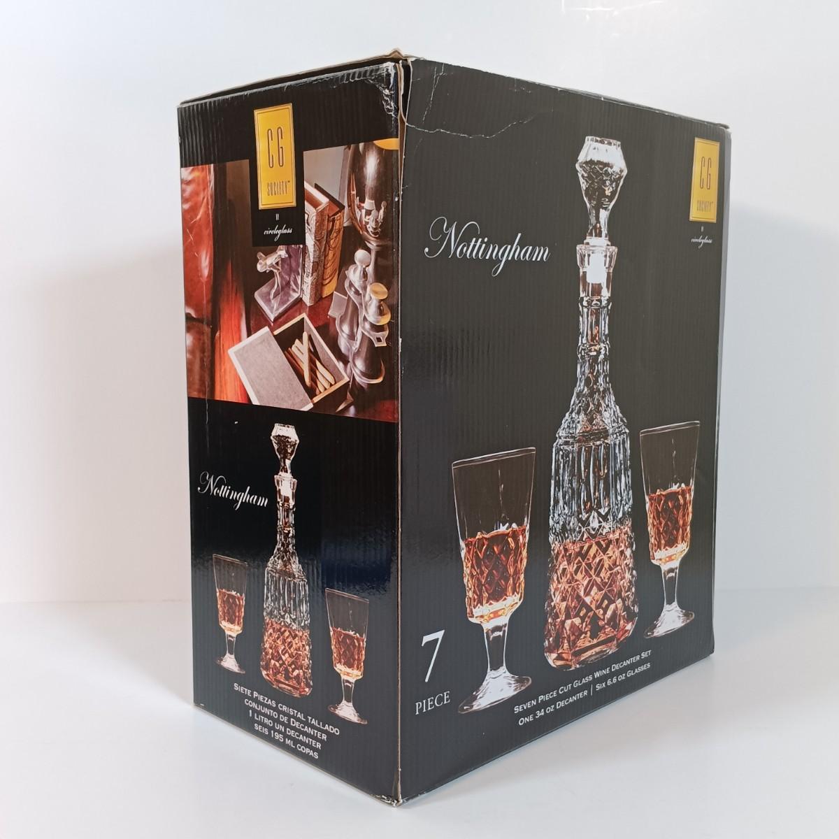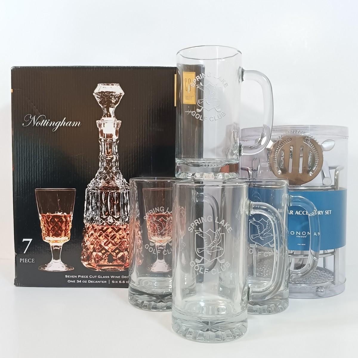 LOT 5: Sonoma 6pc Bar Accessory Set, Nottingham 7pc Cut Glass Decanter Set & (4) Springlake Golf Club Tankards
