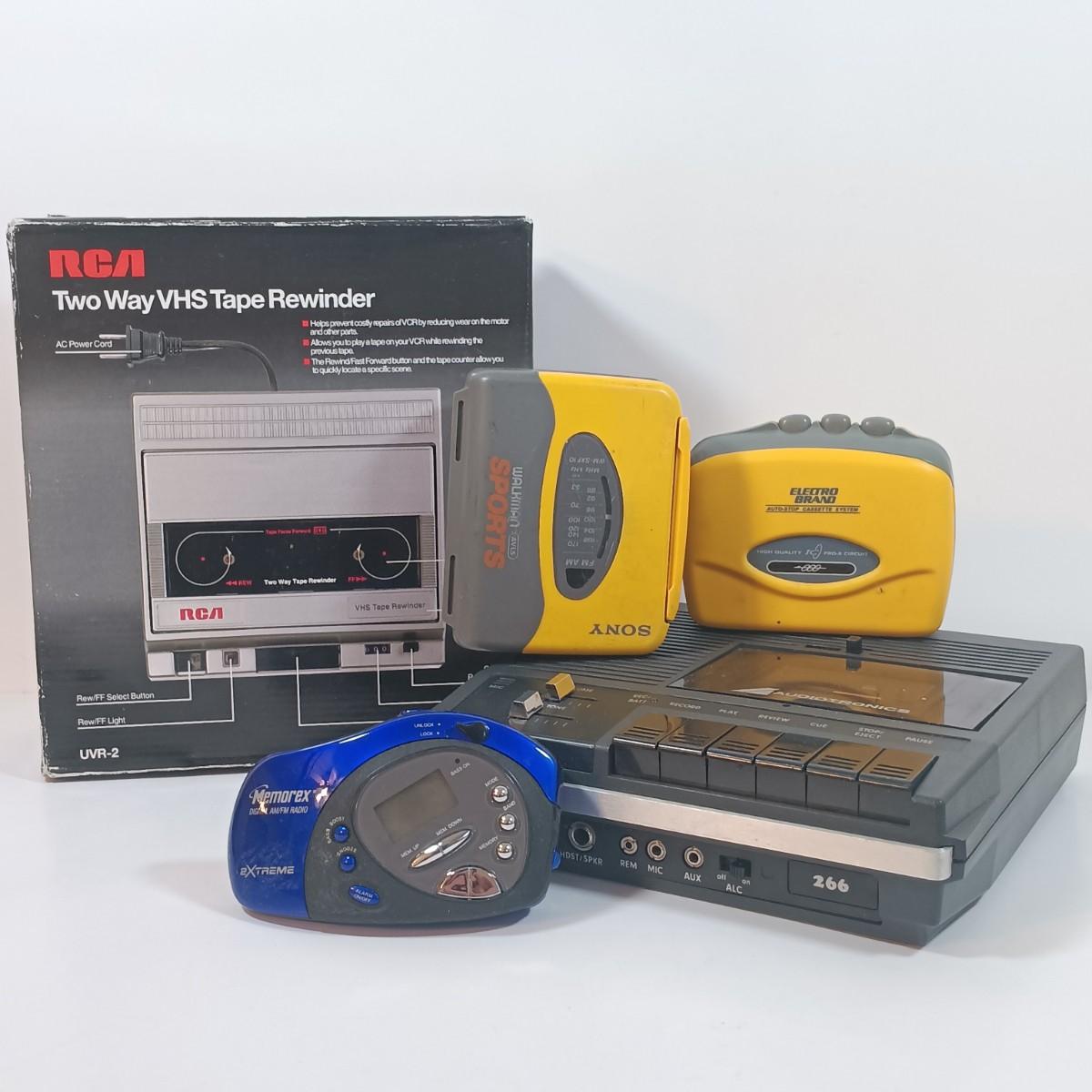 LOT 16: New/Old Stock RCA Two Way VHS Tape Rewinder with Vintage Sony Walkman Sports, Audiotronics 268 Cassette Player & More