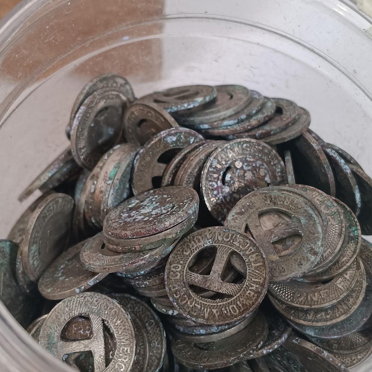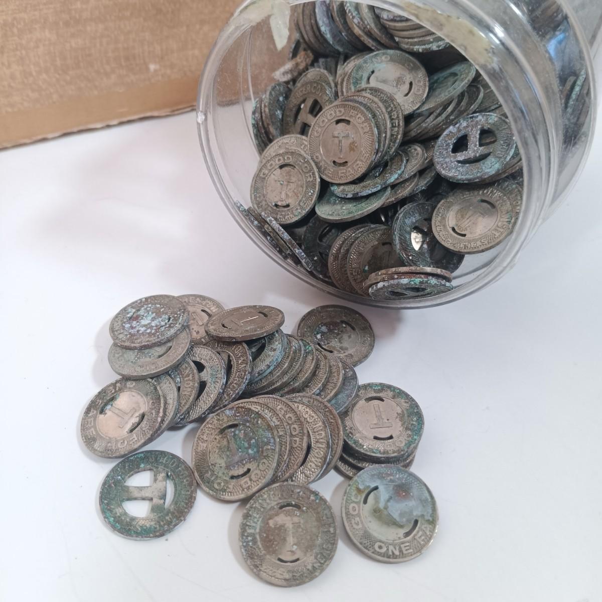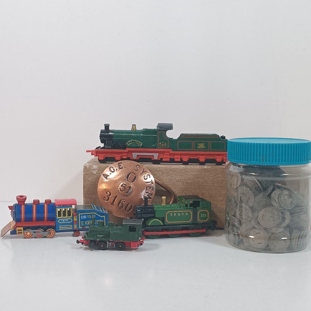 LOT 18: ERTL Metal Thomas & Friends Green Train and Bluebell with Large Collection of Train Tokens & More