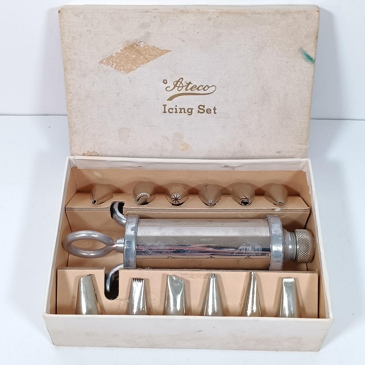 LOT 44: Sears 1978 Merry Mushroom Jars, Ateco Icing Set, Wear Ever Cookie Gun & Moulinex Julienne