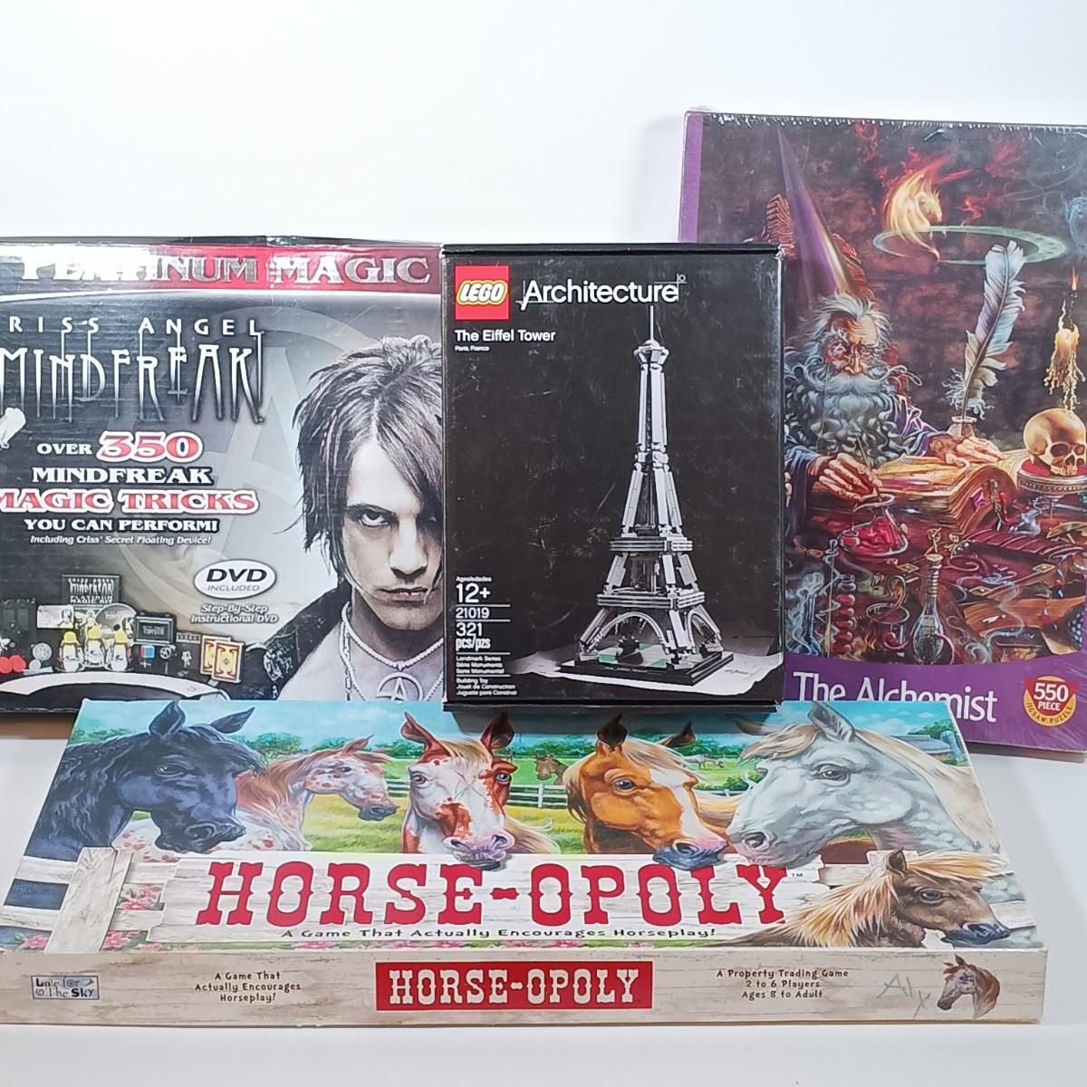 LOT 46: Lego Architecture Eiffel Tower, Criss Angel Mind Freak Platinum Magic Kit, Horse-Opoly & 550 Pc The Alchemist Puzzle