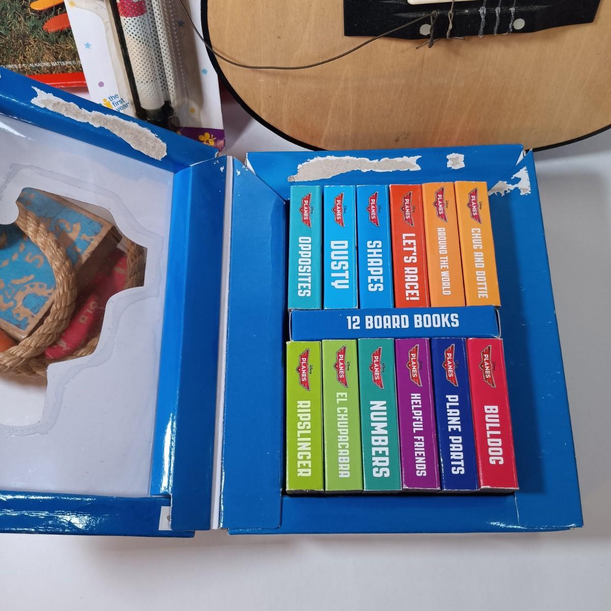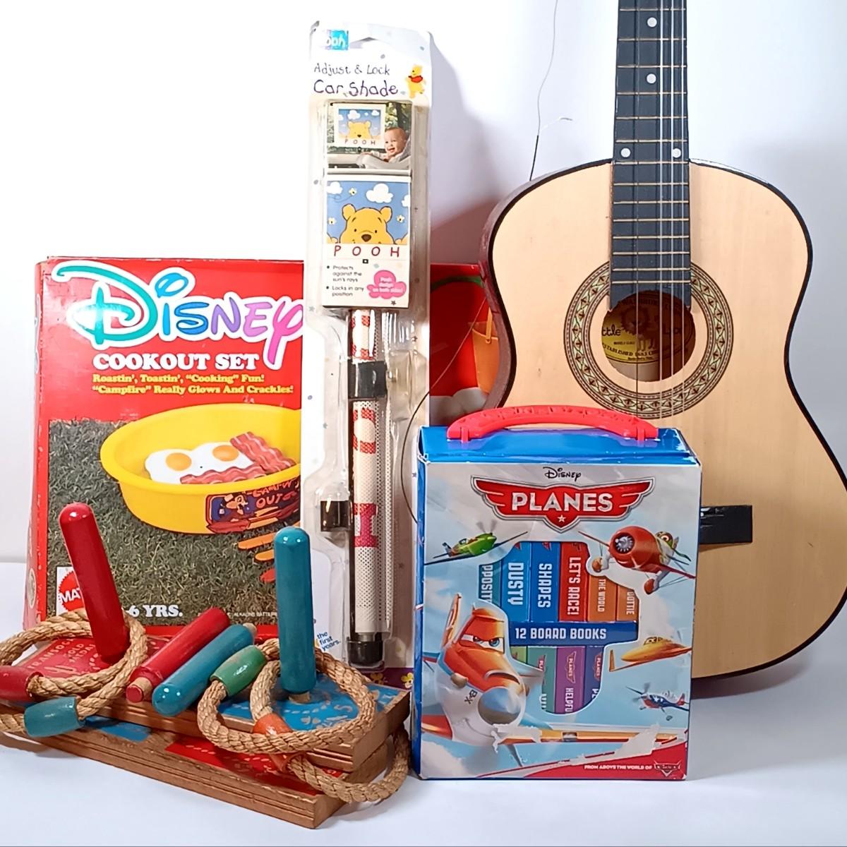 LOT 51: George Washburn Lyon LLAG1 Little Lion Children's Guitar, Camp Mickey Cookout Set, Planes Board Books & More