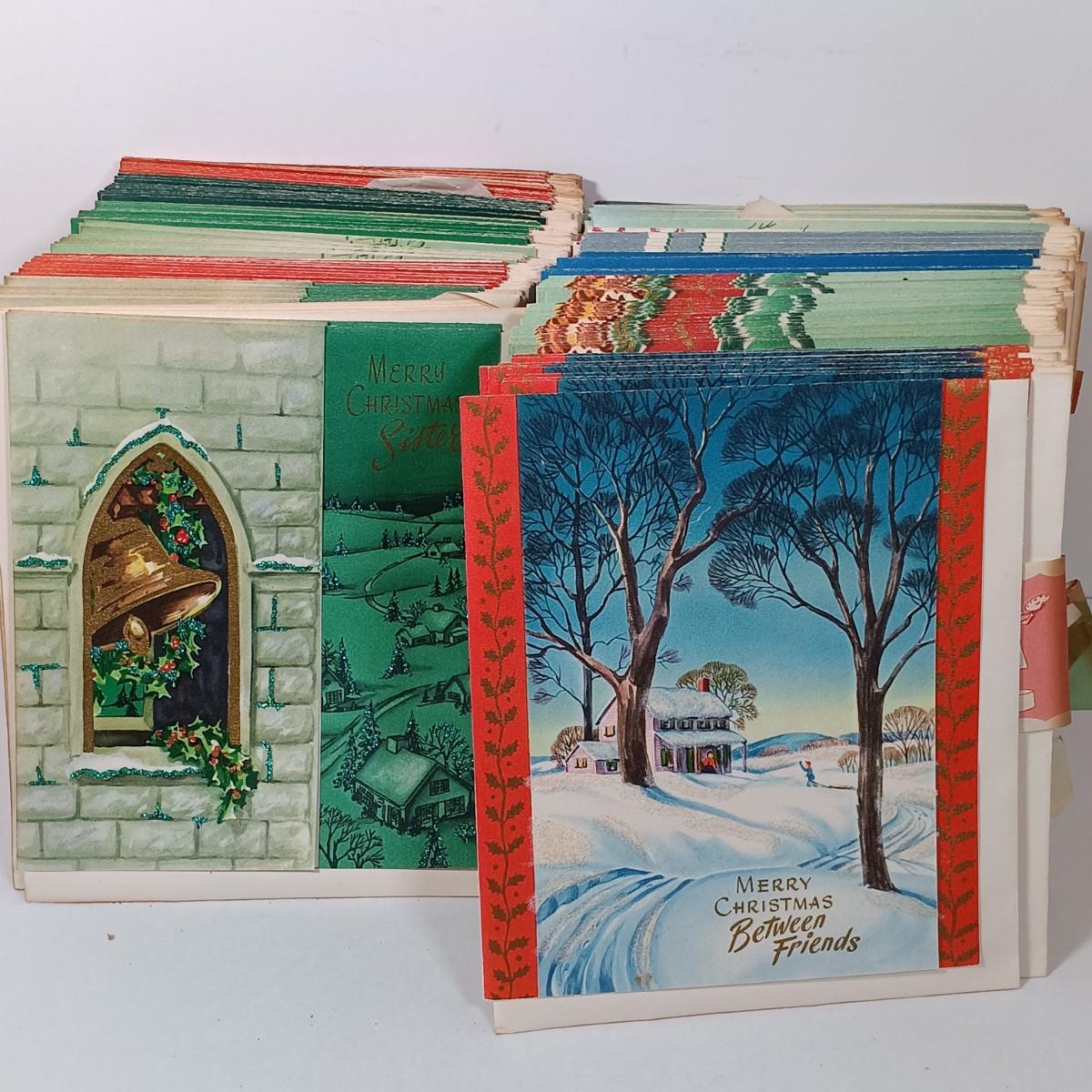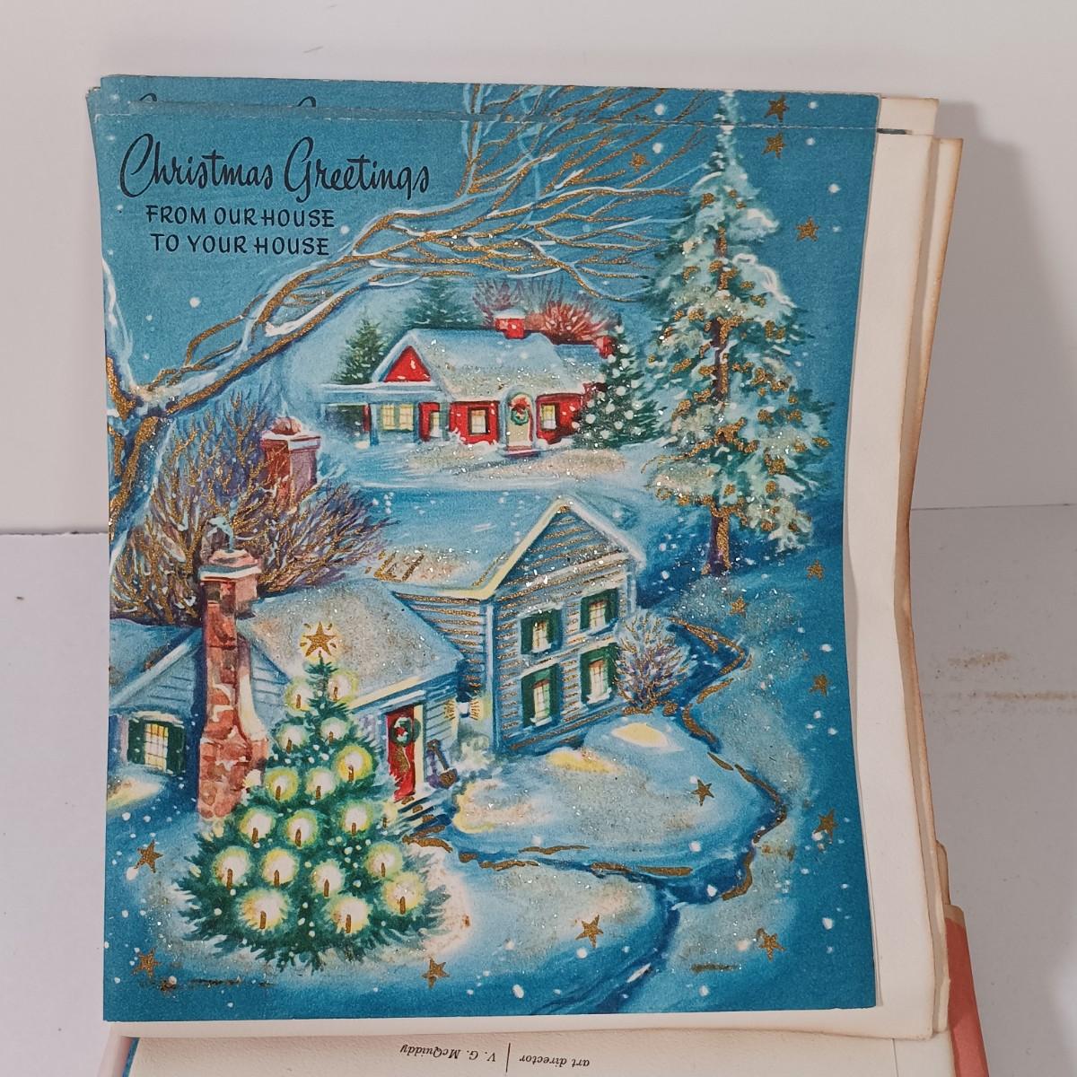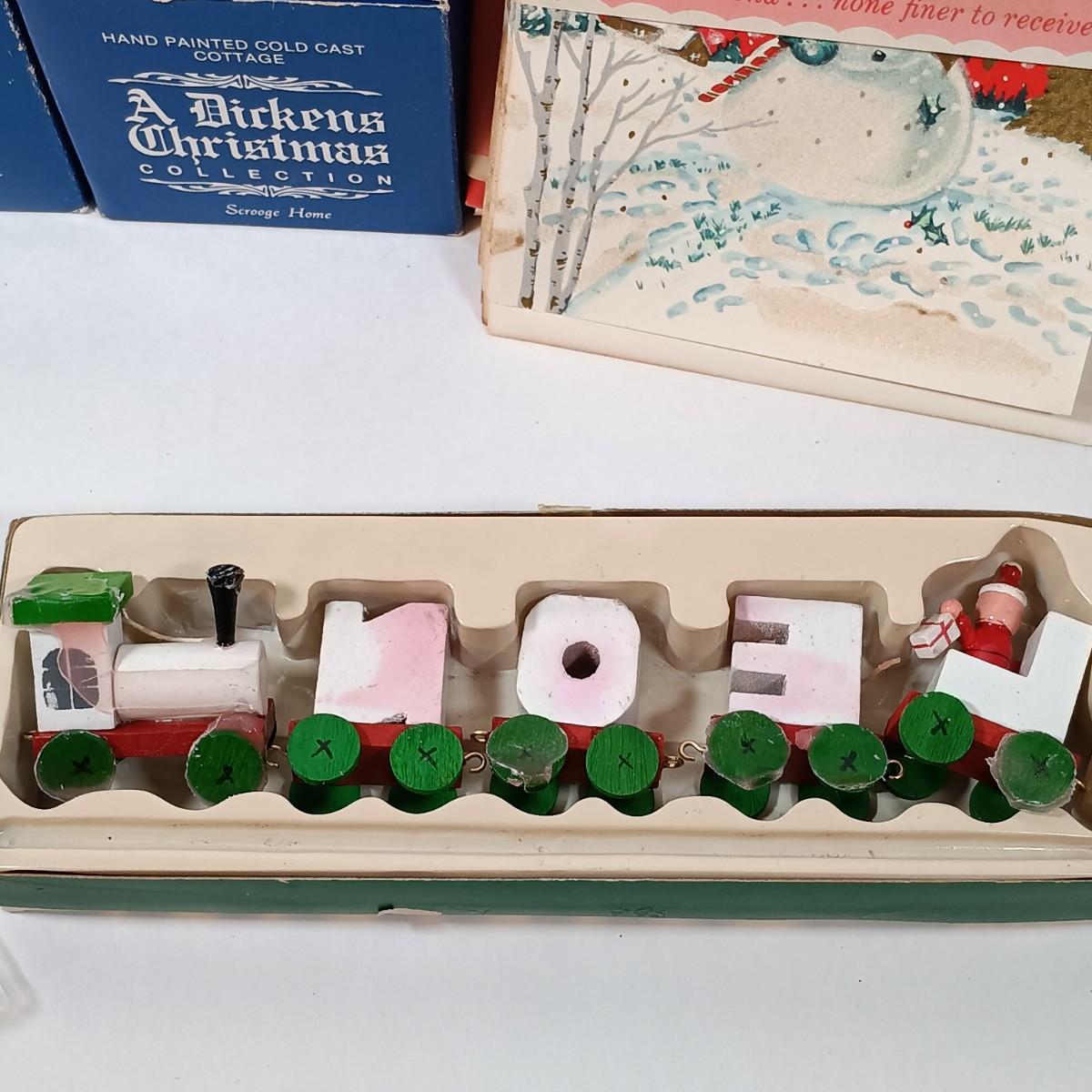 LOT 52: Vintage Munson Masterpiece Christmas Greeting Cards, Hallmark Mickey's Merry Carousel Ornament, A Dickens Christmas Cottages & More