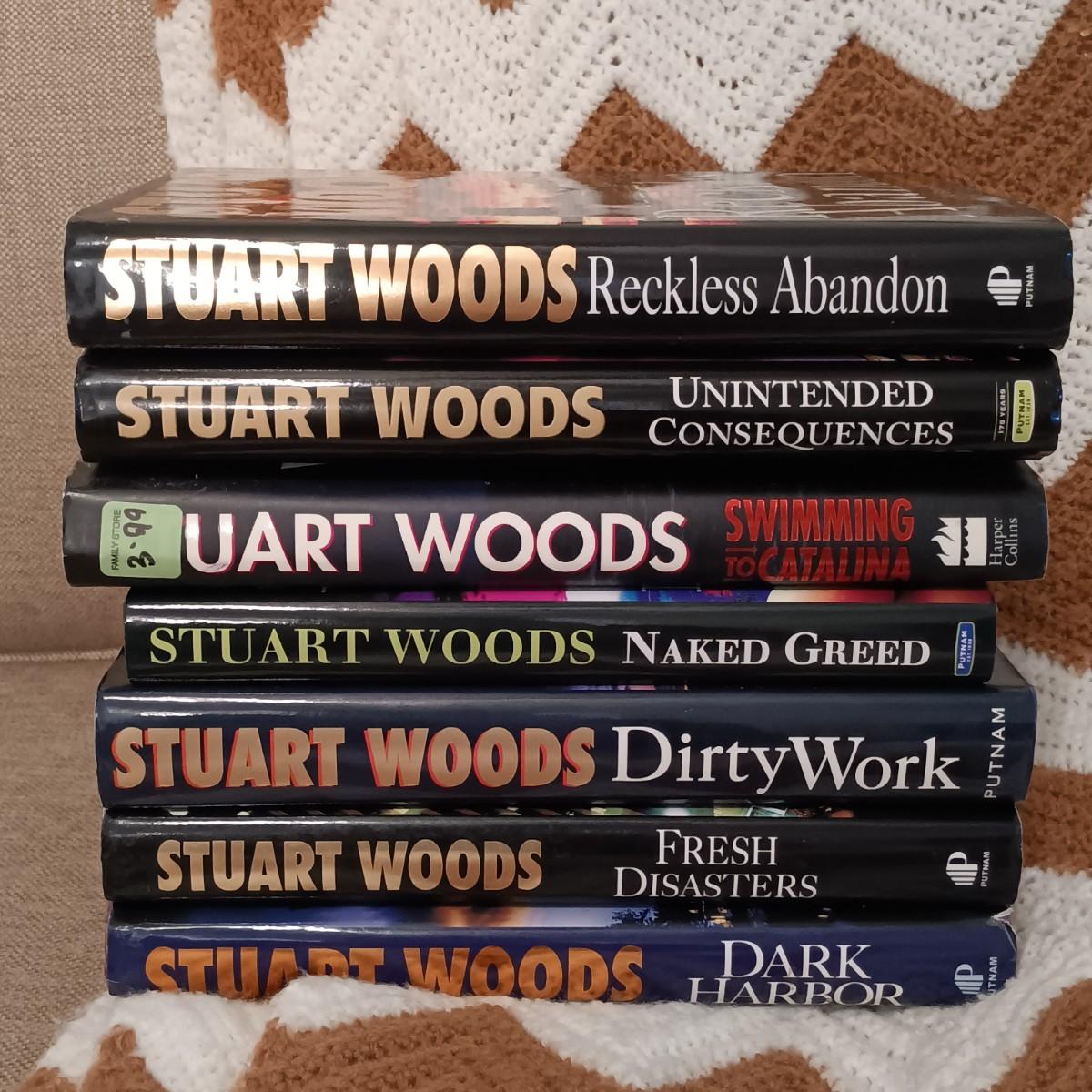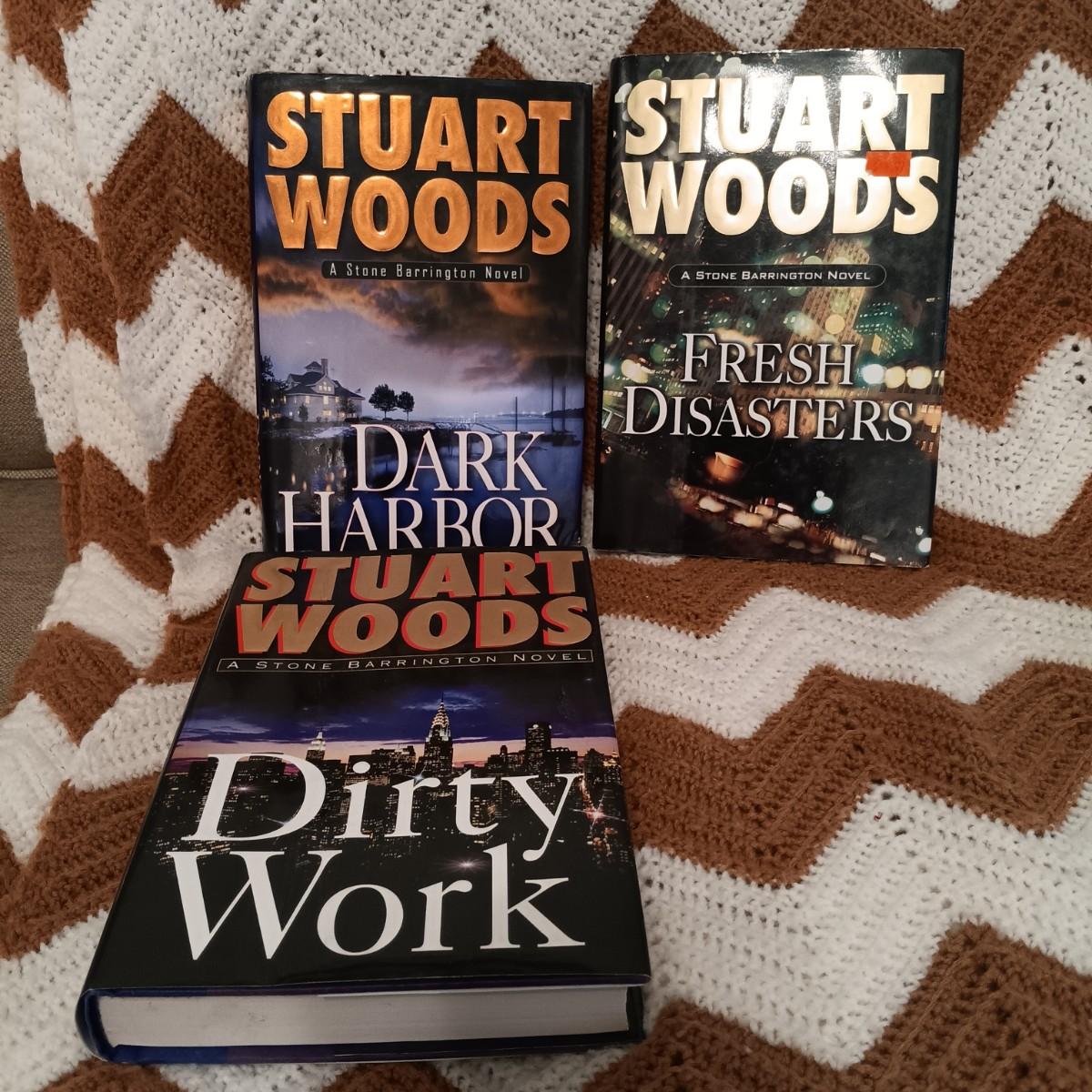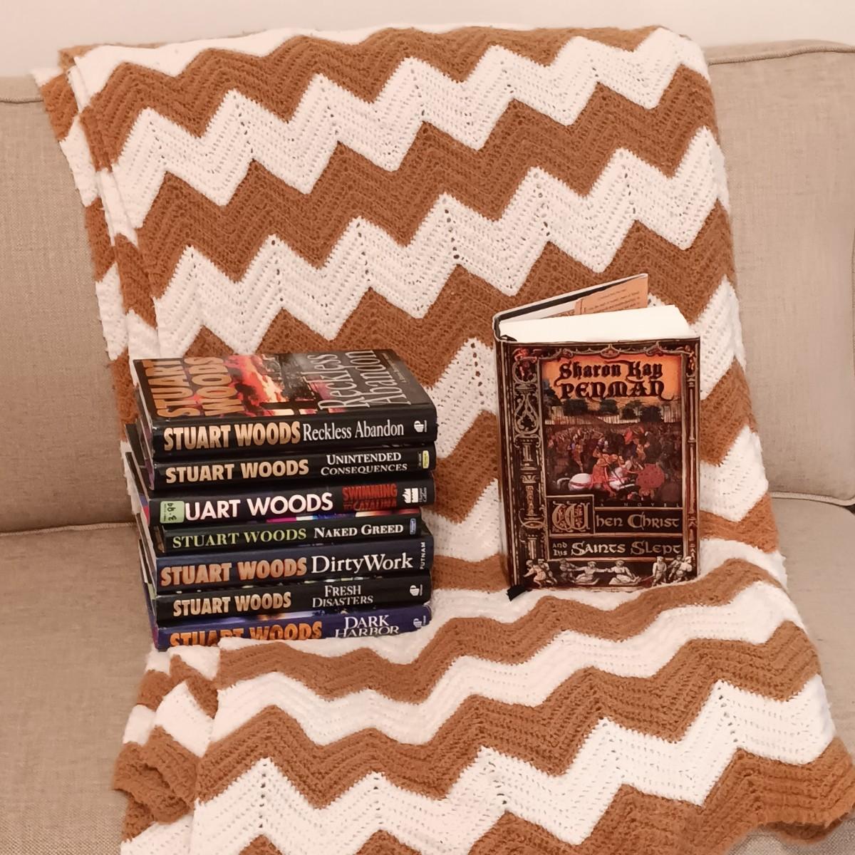 LOT 54: Collection of Stuart Wood and Sharon Kay Penman Hardback Novels with a Large Crocheted Throw Blanket