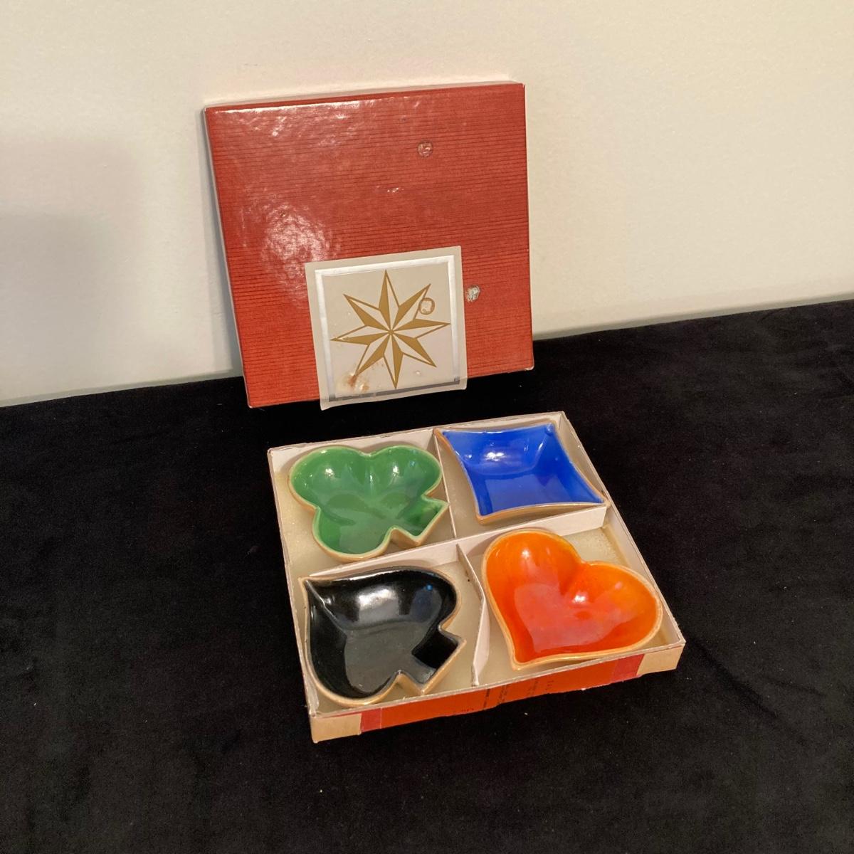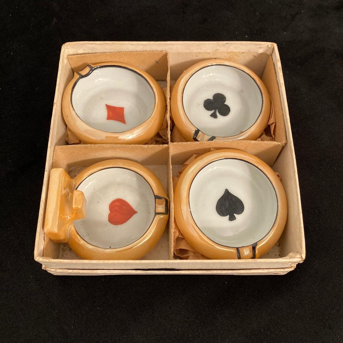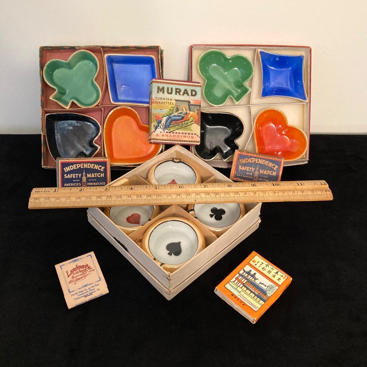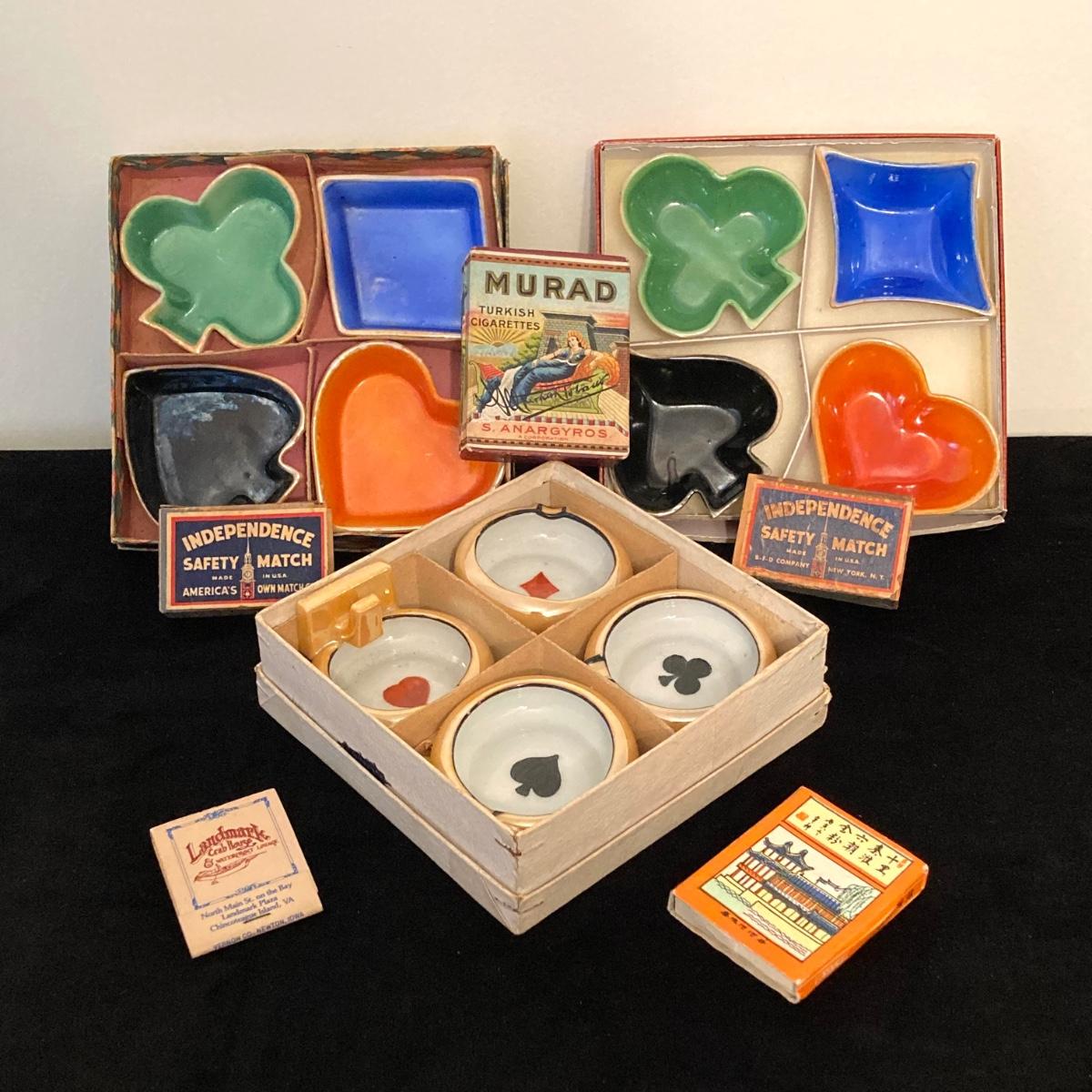 LOT 67: Vintage Japan Lustreware Ashtrays / Four Suit China Trinket Dishes, S. Anargyros Murad Turkish Cigarettes Box and Matches