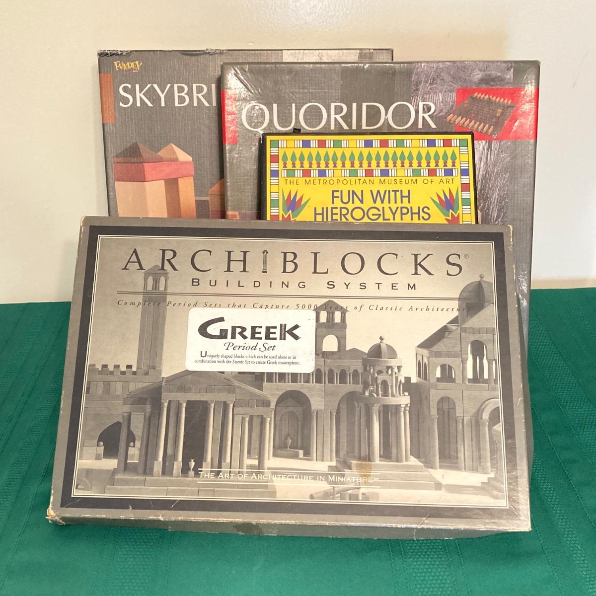 LOT 74: Toys, Games, Building Sets - Archiblocks Building Systems Greek Period, Fun with Kieroglyphs, Gigamic Quoridor and Guildcraft Skybridge