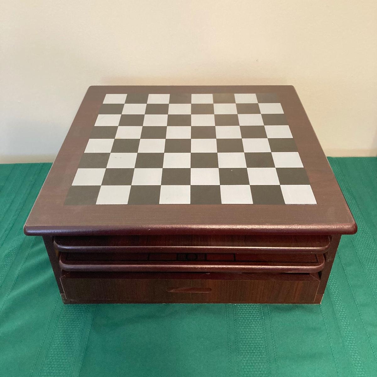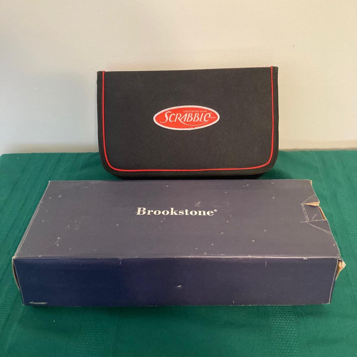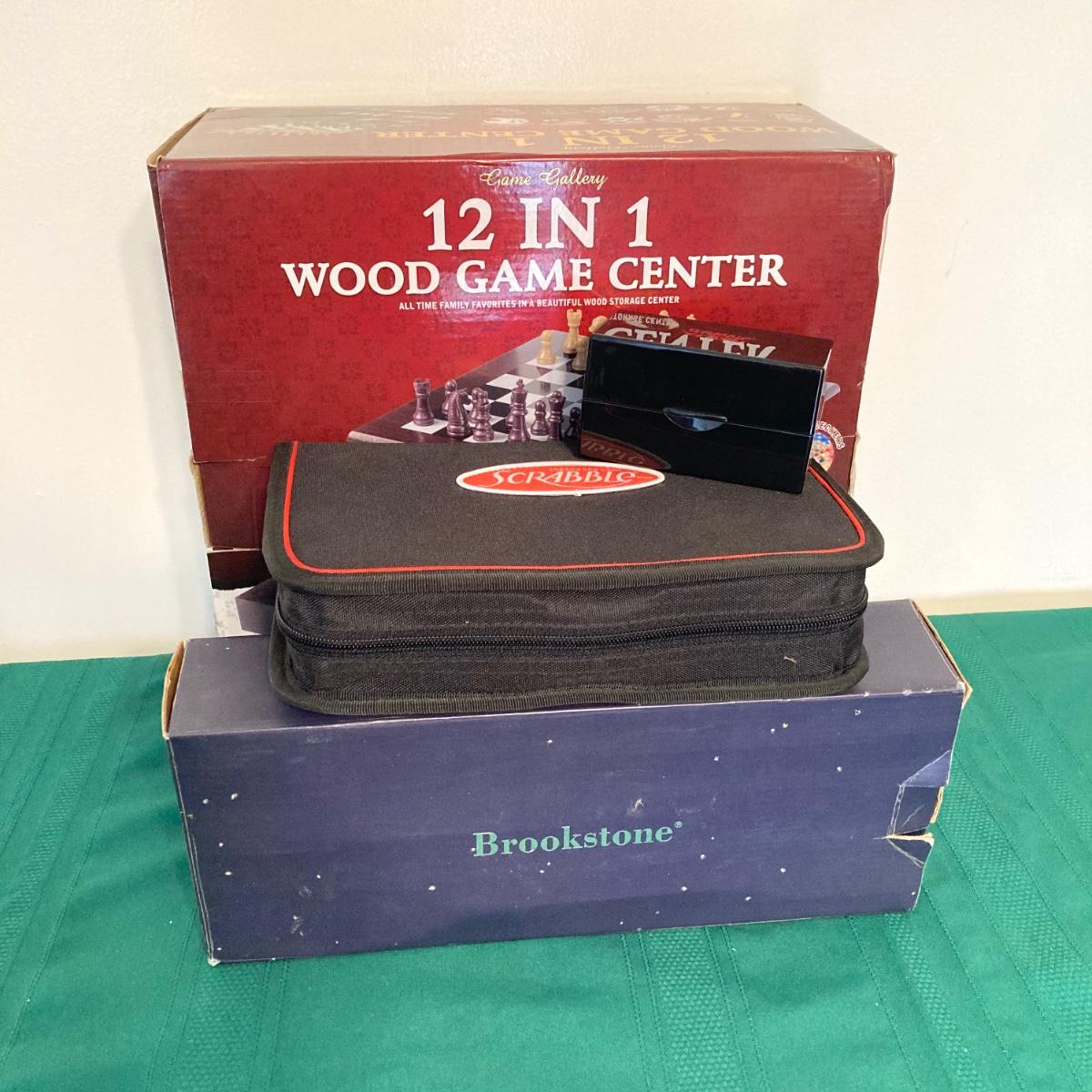 LOT 75: Vintage Games - 12 in 1 Wood Game Center, Scabble, Brookstone Bowling and Scrabble Flash