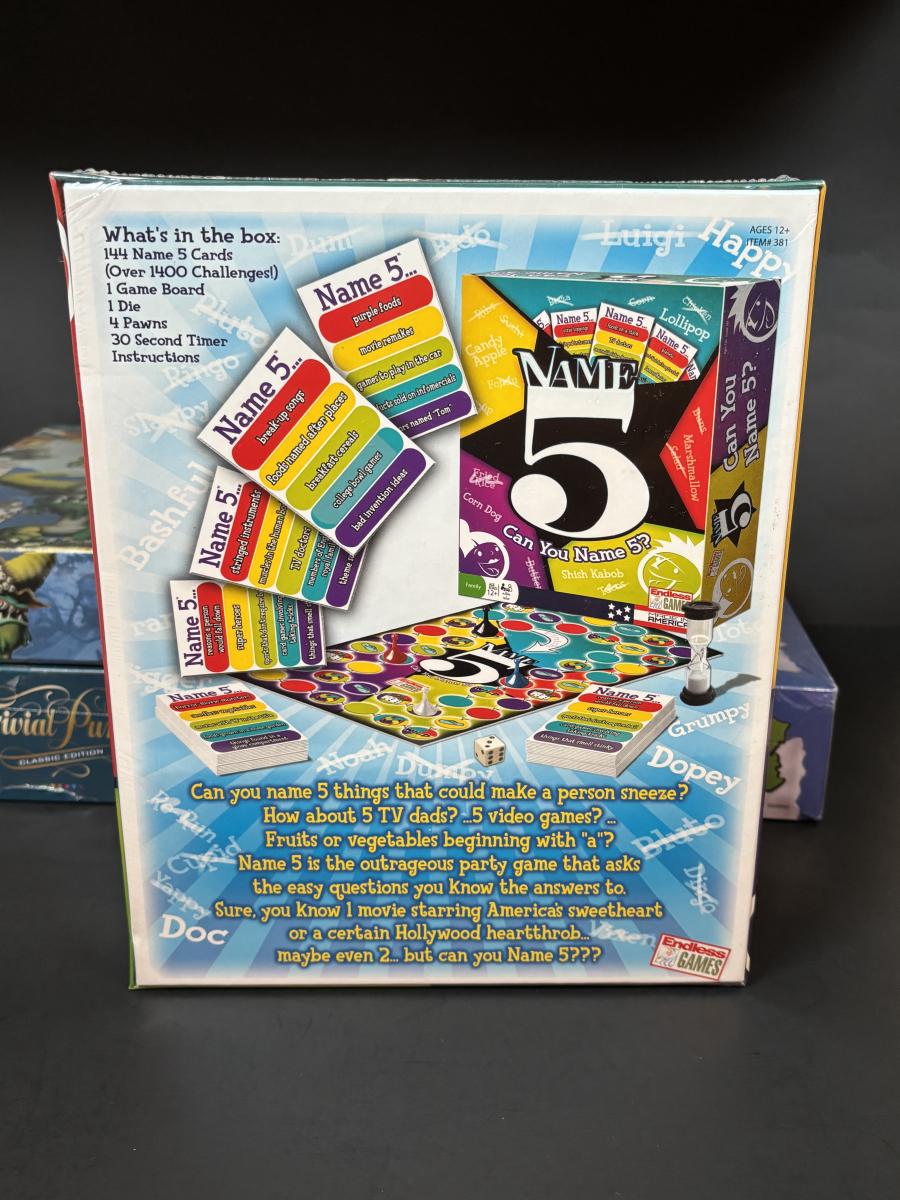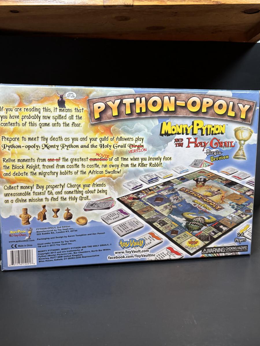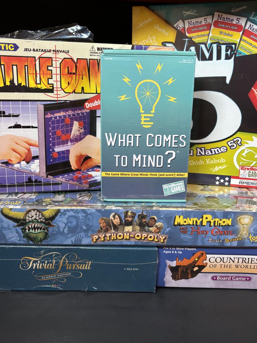 LOT 109: NIP Boad Games: Monty Python & the Holy Grail Python-Opoly, Name 5, Magnetic Battle Game, Trivia Pursuit & More