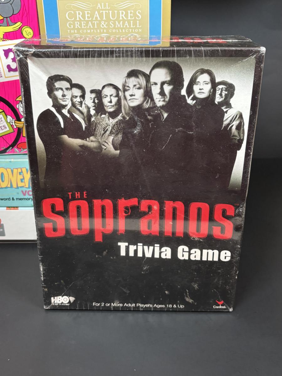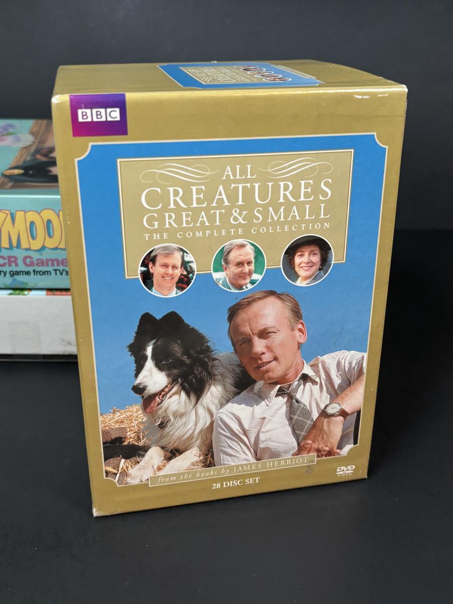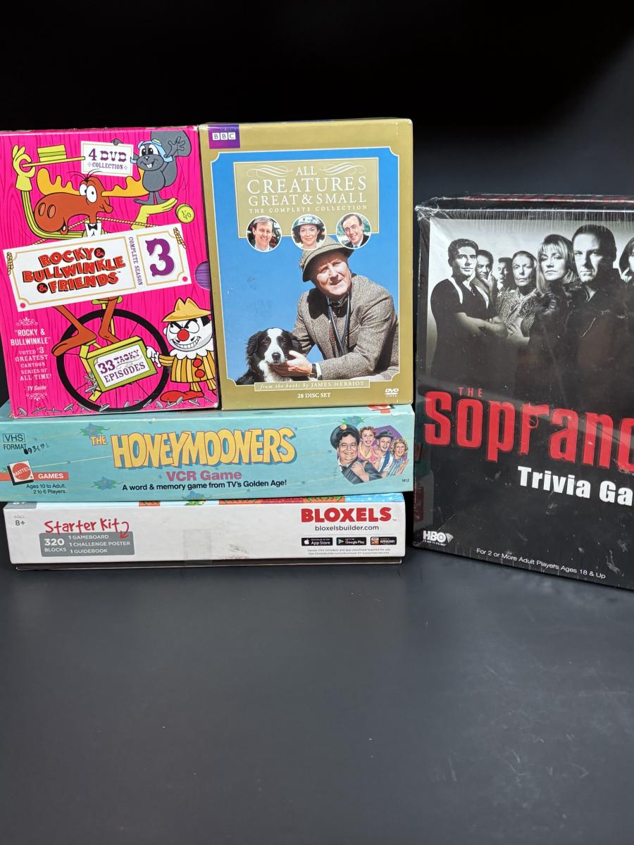 LOT 110: DVDs' & Games: Bloxels Build Your Own Video Game, All Creatures Great & Small Complete Collection, Rocky & Bullwinkle, The Sopranos Trivia Game Honey Mooners VCR Game