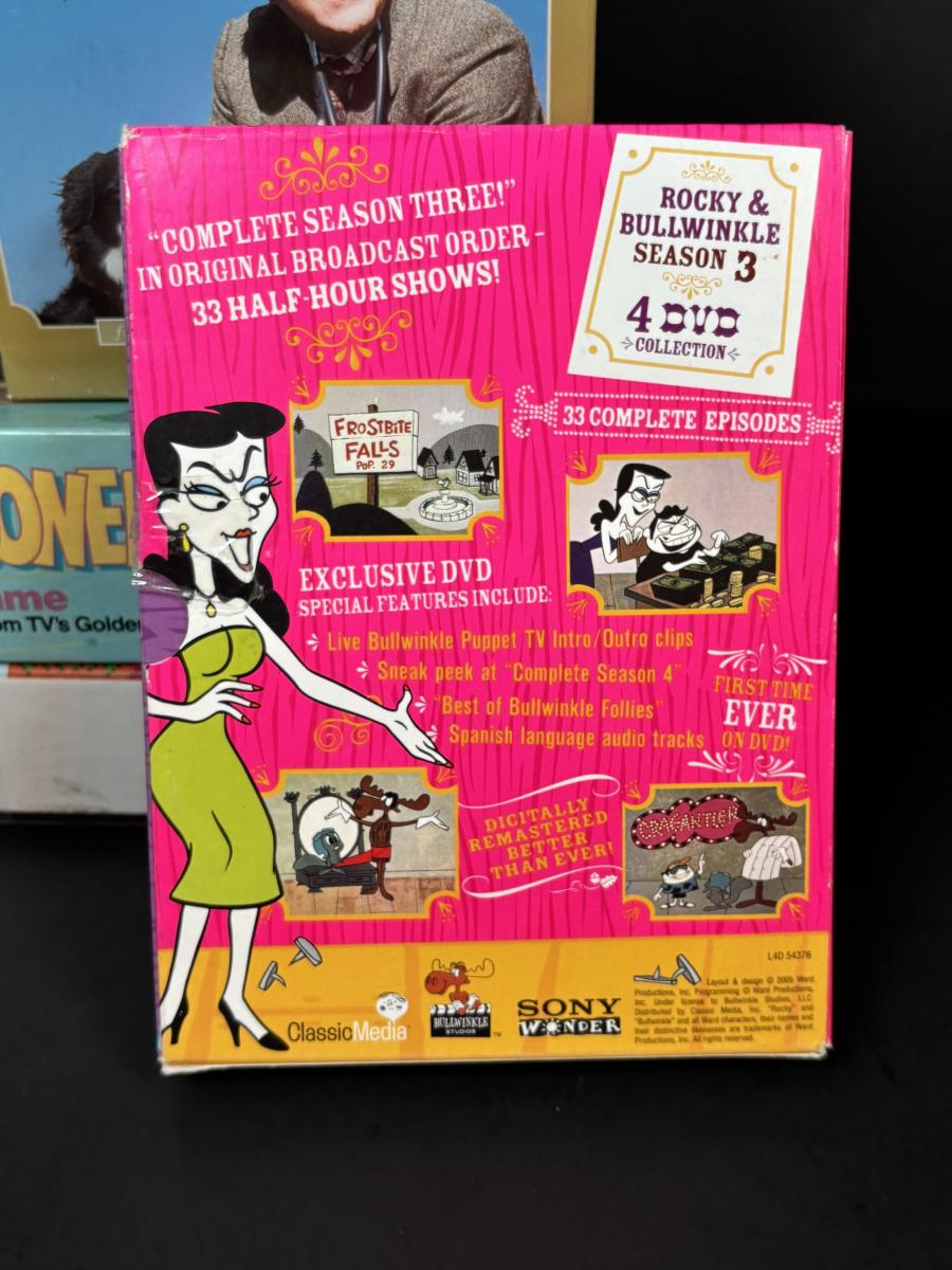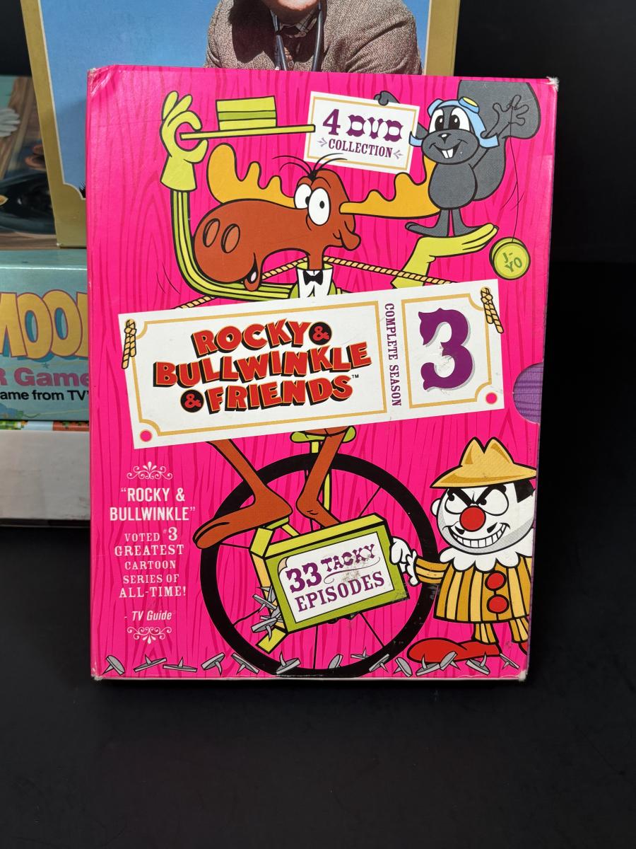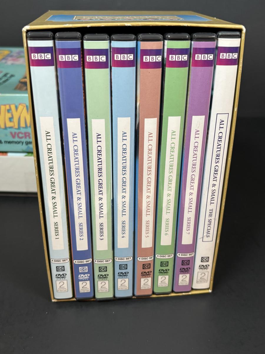 LOT 110: DVDs' & Games: Bloxels Build Your Own Video Game, All Creatures Great & Small Complete Collection, Rocky & Bullwinkle, The Sopranos Trivia Game Honey Mooners VCR Game