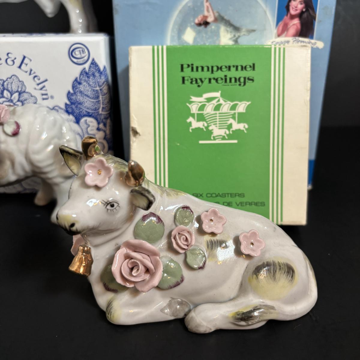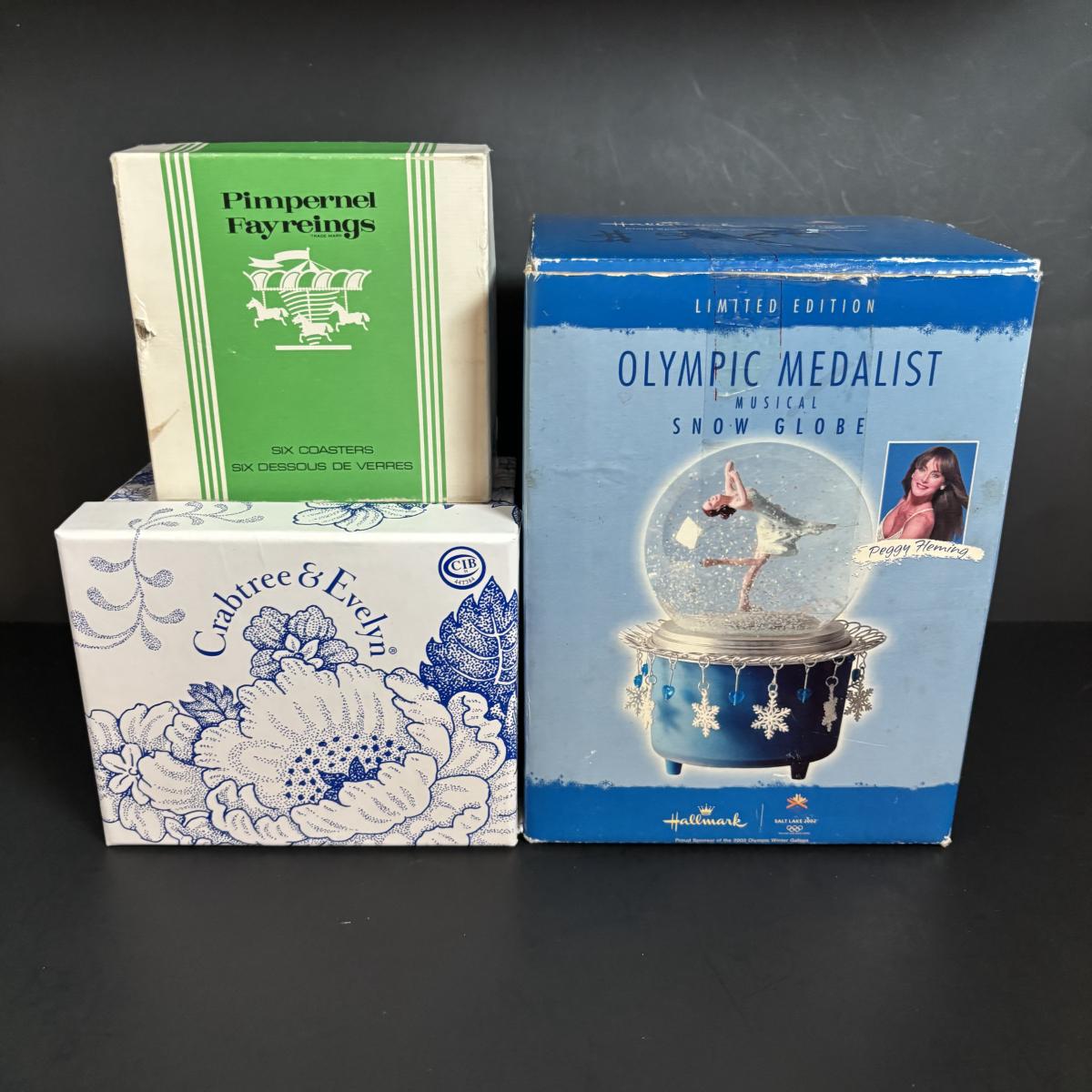 LOT 112: Limited Edition Hallmark Olympic Medalist Musical Snow Globe, Crabtree & Evelyn Mug, Porcelain Farm Animals & Pimpernel Coasters