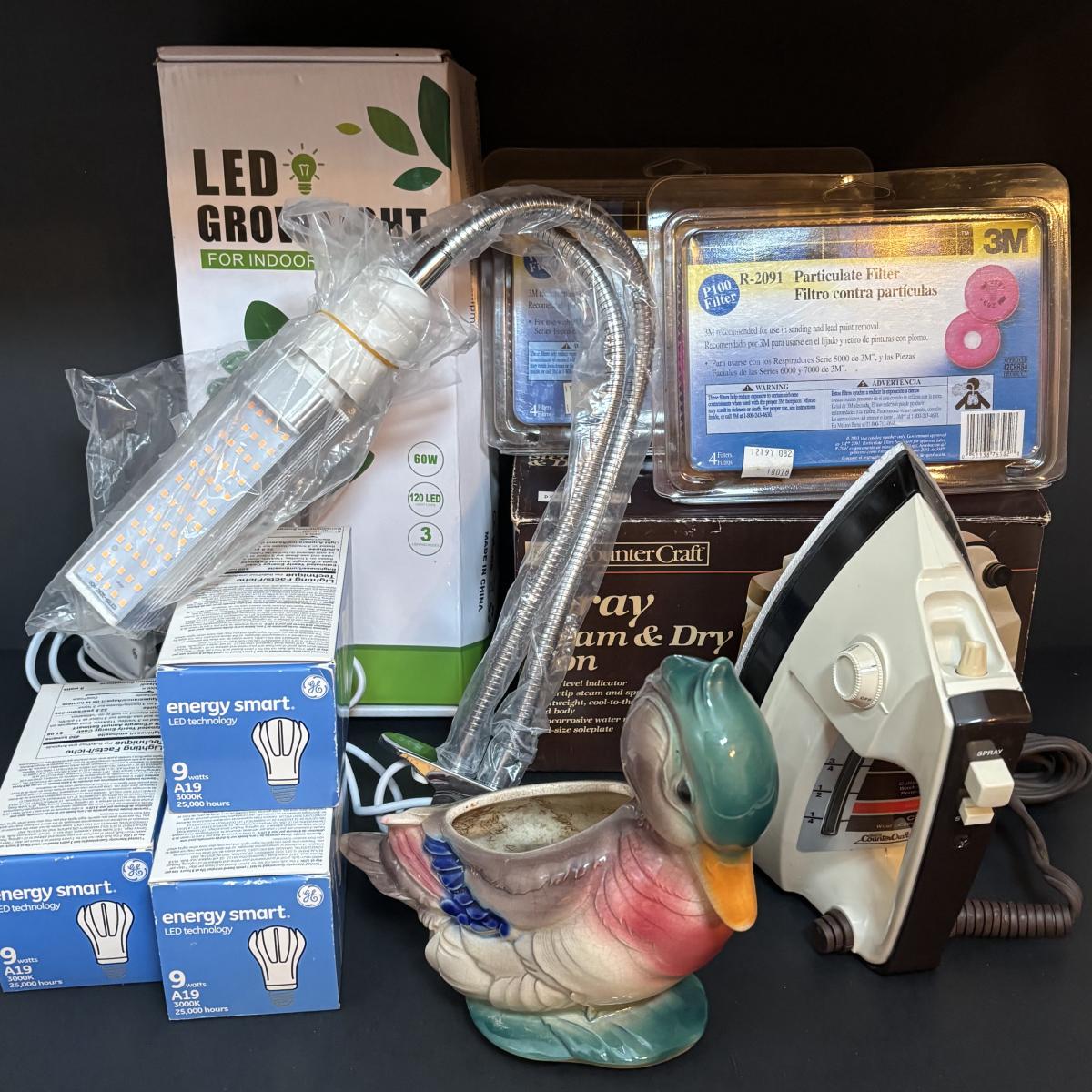 LOT 115: Vintage Mallard Duck Planter, Sears Iron, Indoor Led Grow Light & More