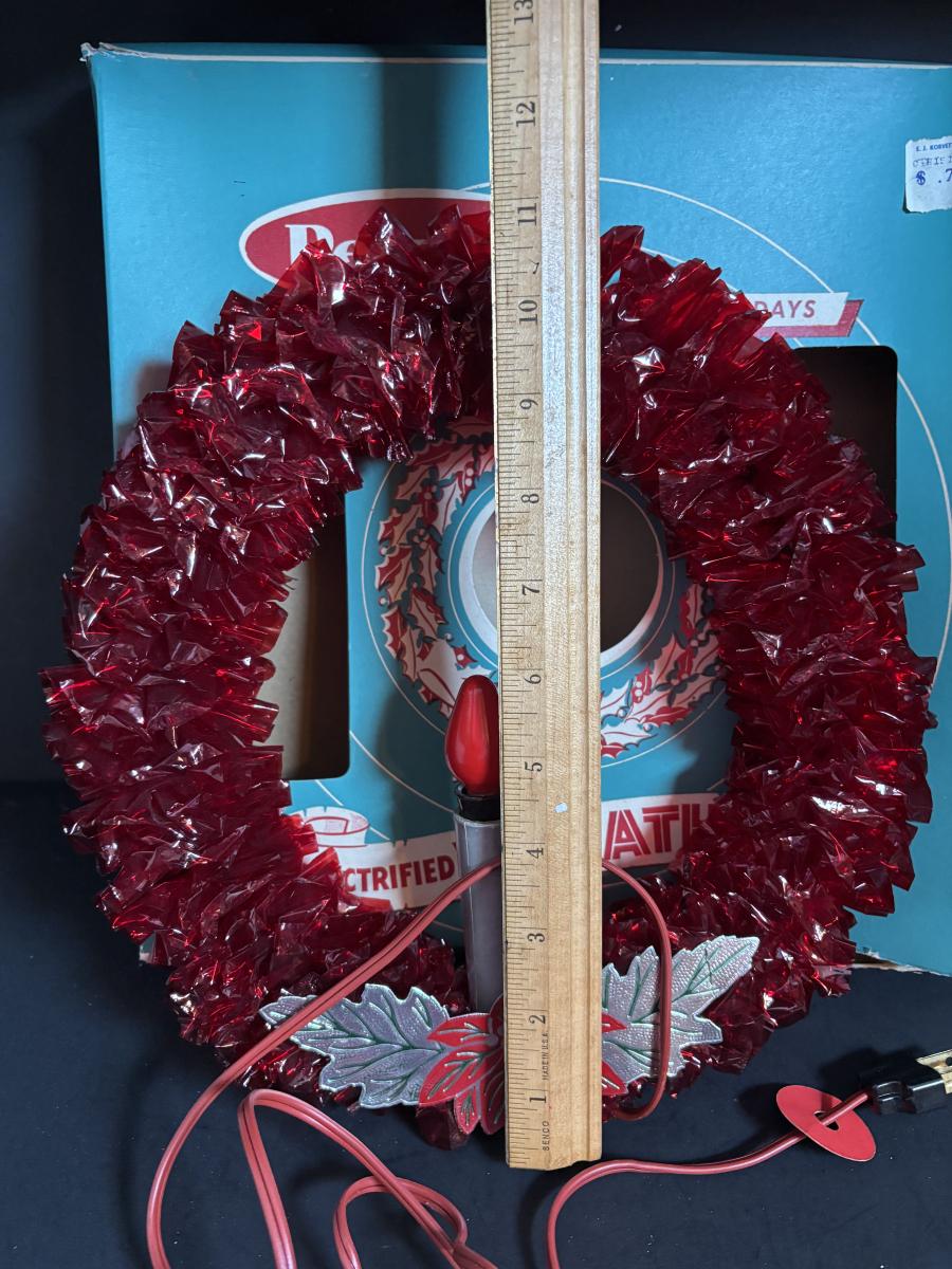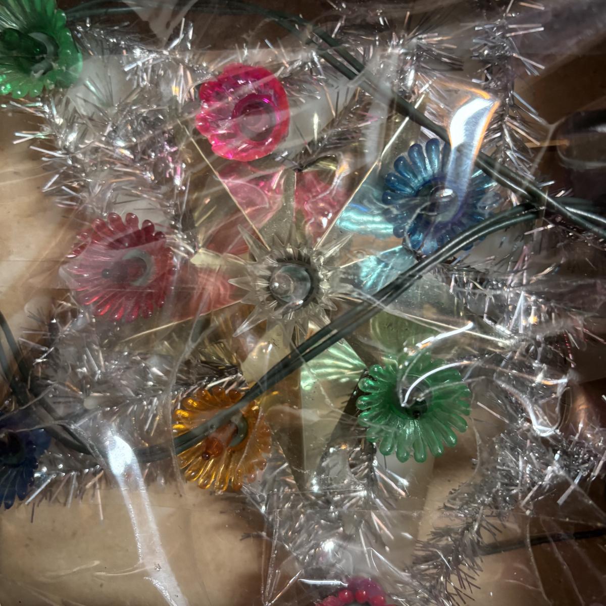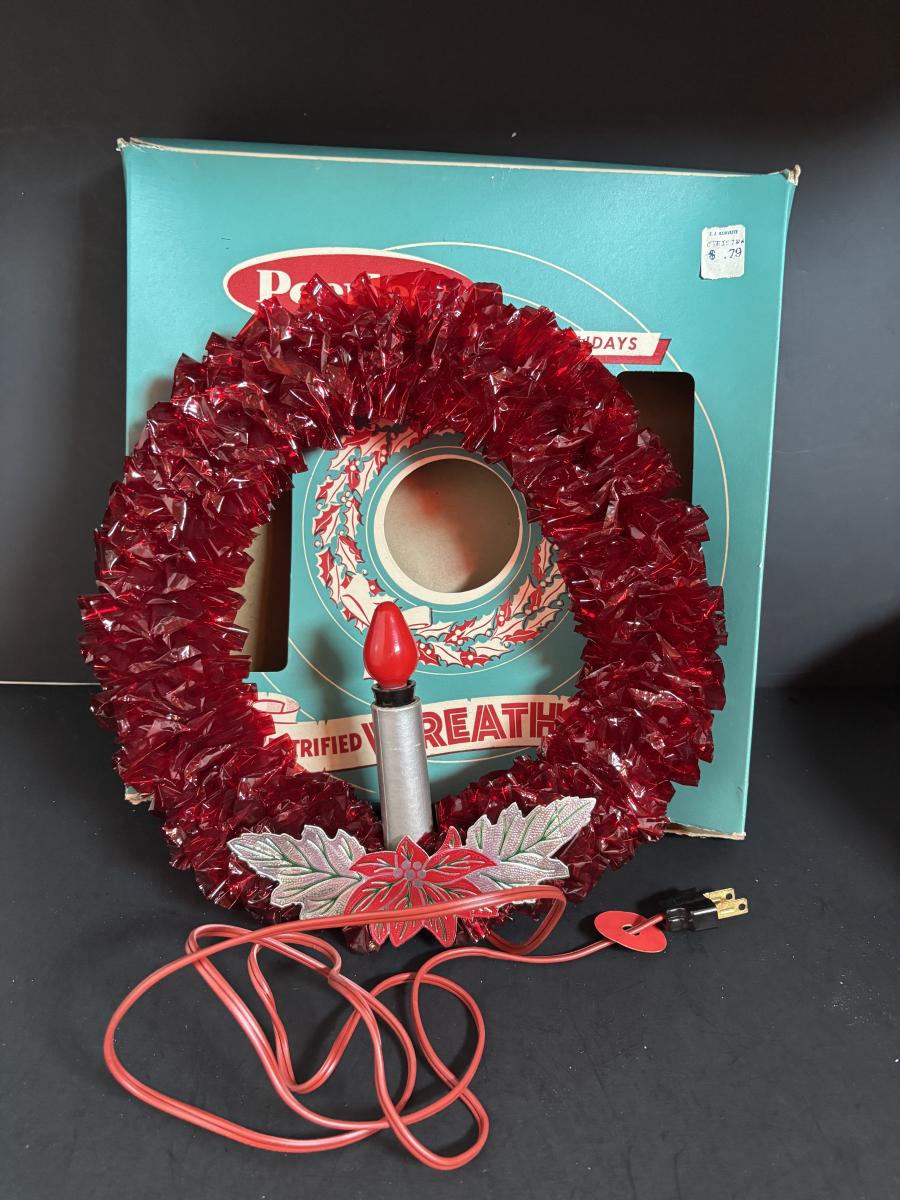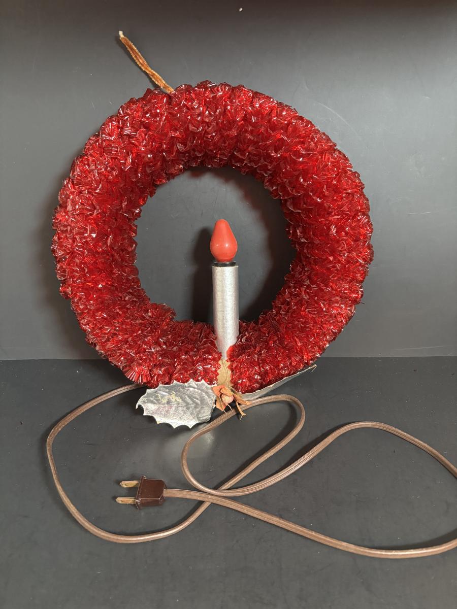 LOT 117: Vintage Christmas: Clamp-on Metal Ice Skates, REAL Tinsel, Red Cellophane Christmas Wreaths w/Electric Candles, Foil/Tinsel Multi Color Light Tree Toppers