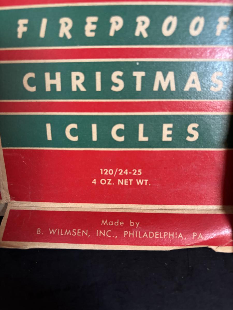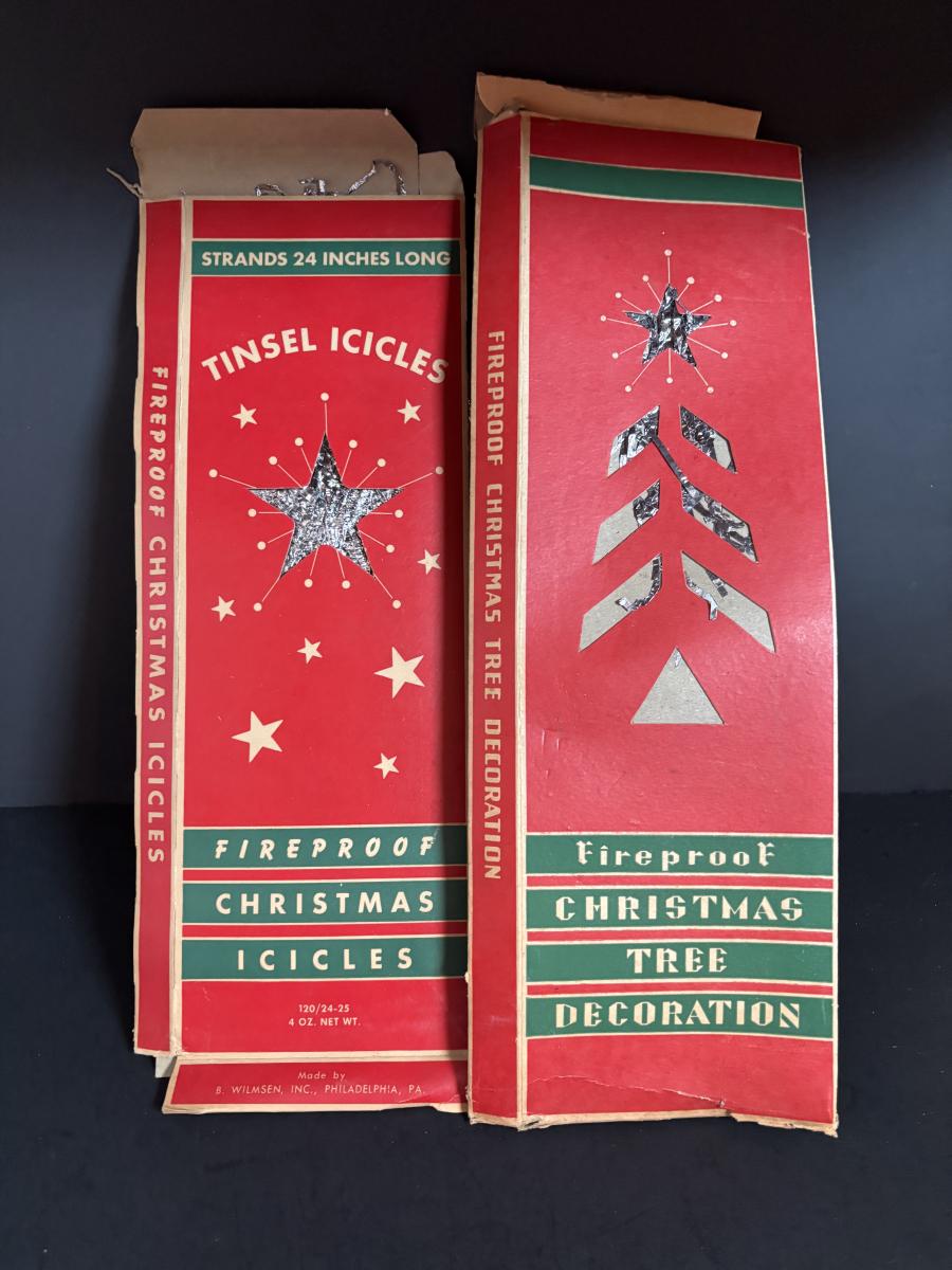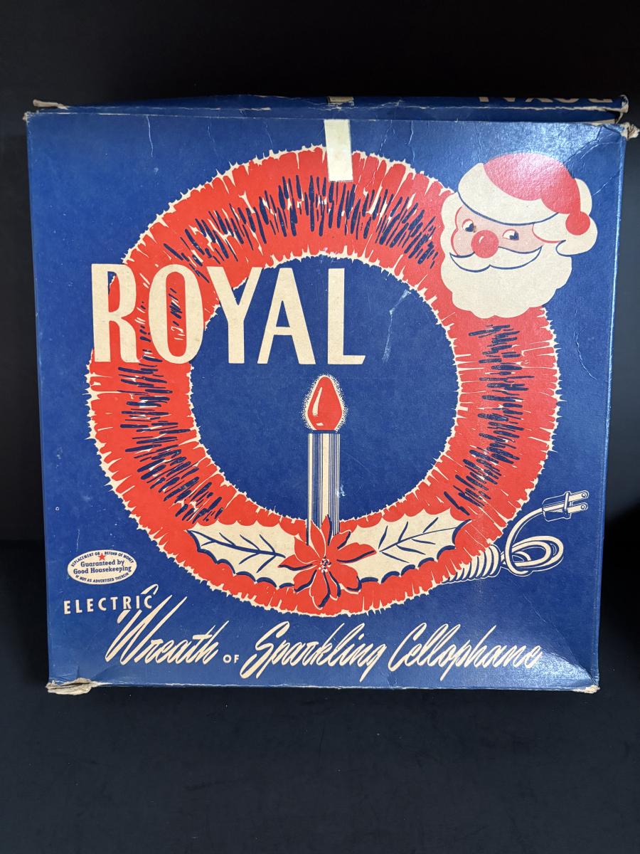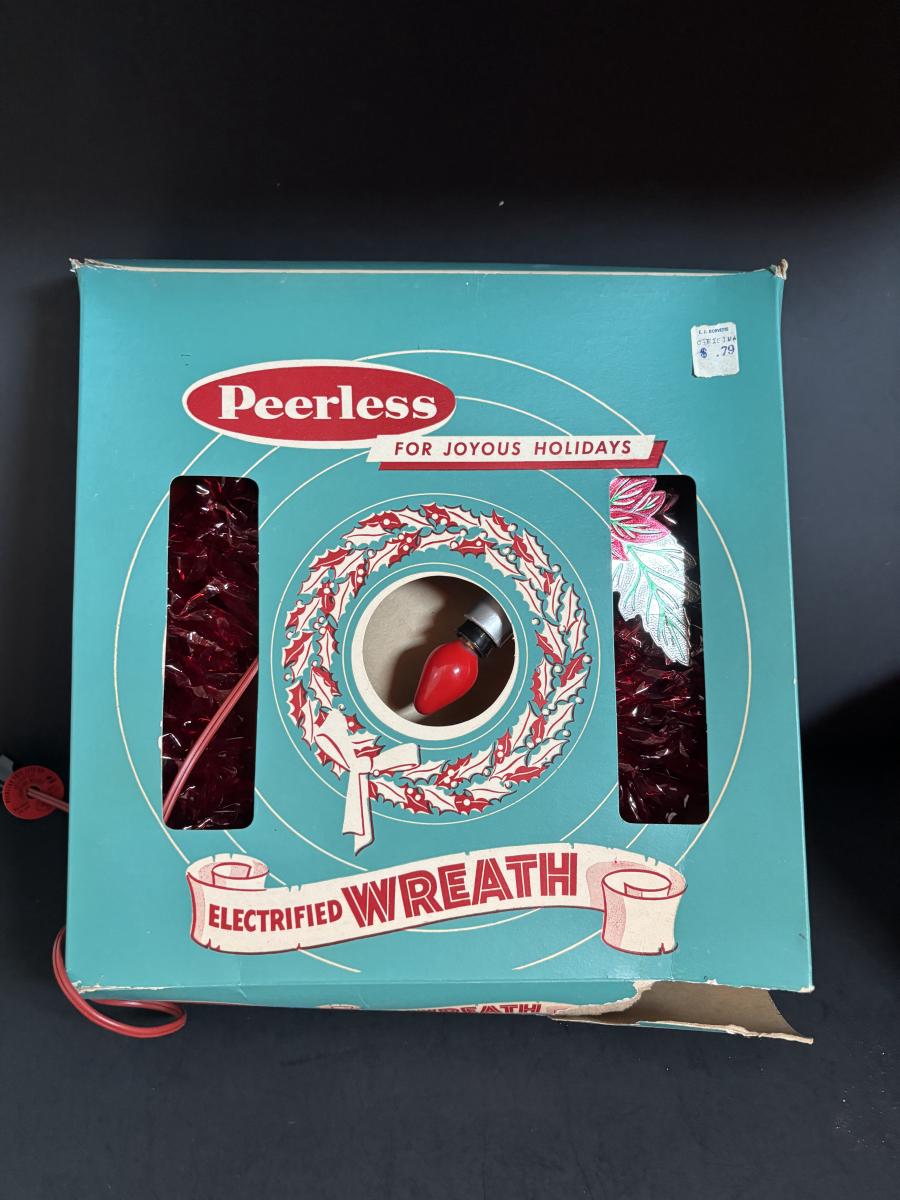 LOT 117: Vintage Christmas: Clamp-on Metal Ice Skates, REAL Tinsel, Red Cellophane Christmas Wreaths w/Electric Candles, Foil/Tinsel Multi Color Light Tree Toppers