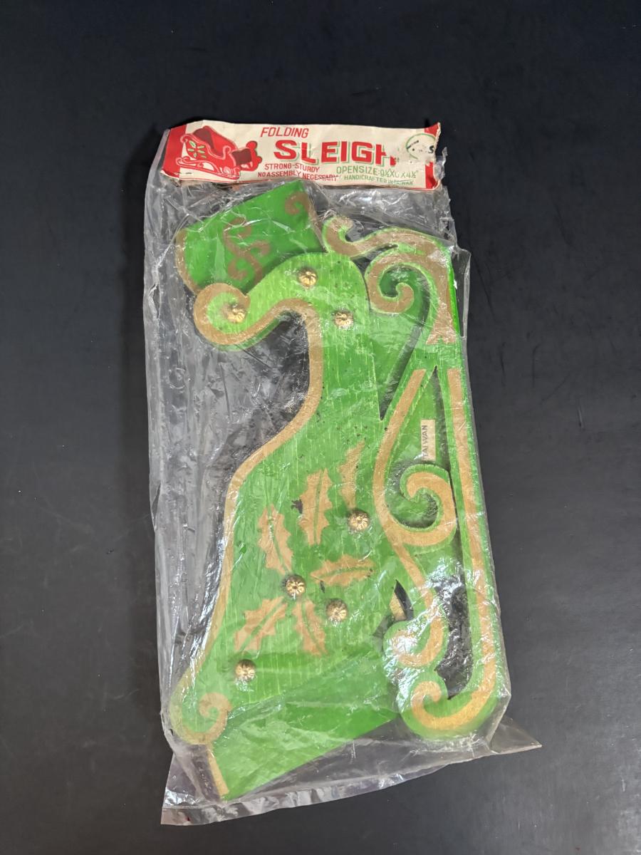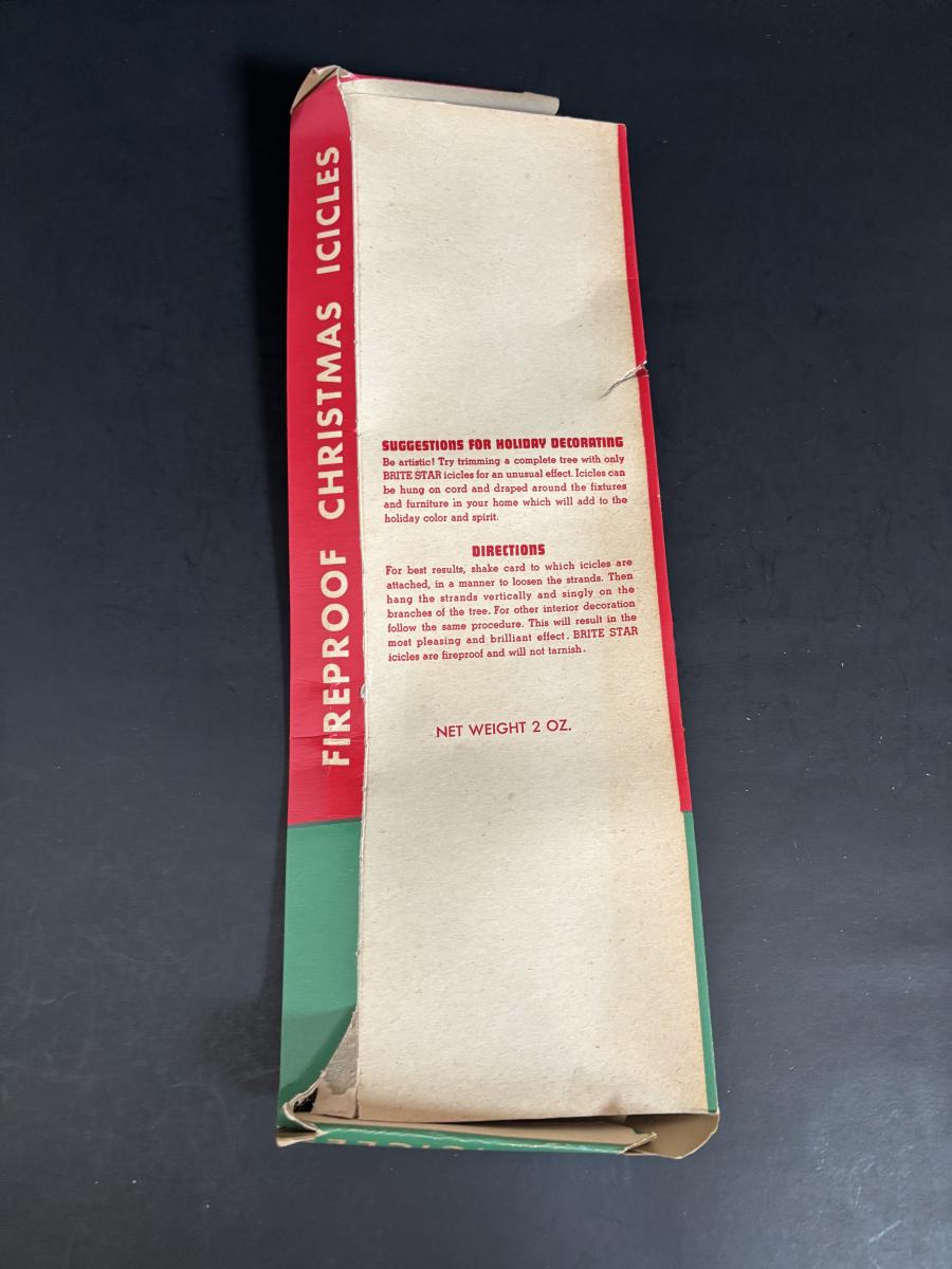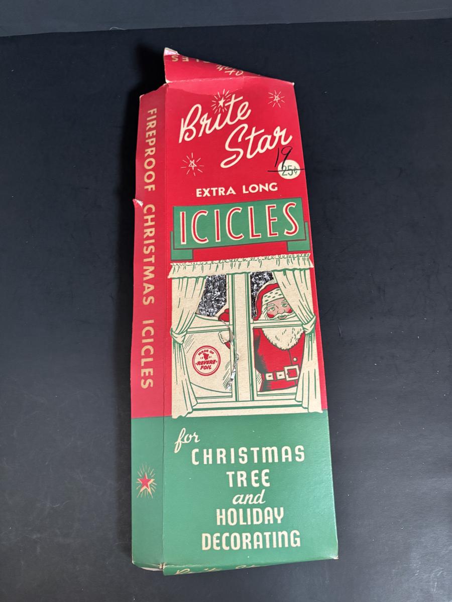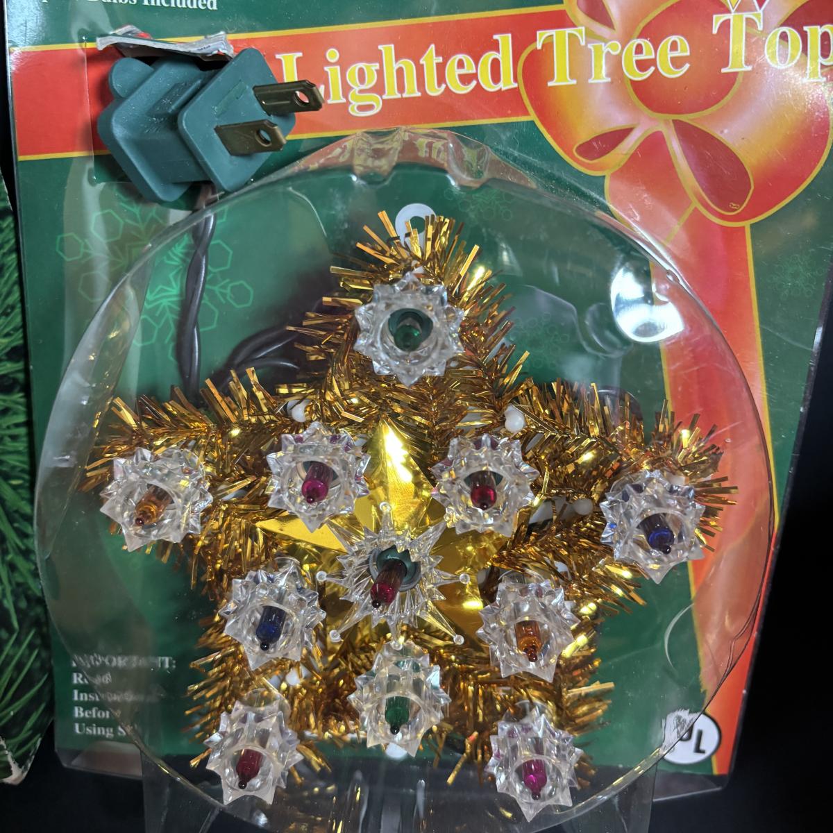 LOT 117: Vintage Christmas: Clamp-on Metal Ice Skates, REAL Tinsel, Red Cellophane Christmas Wreaths w/Electric Candles, Foil/Tinsel Multi Color Light Tree Toppers