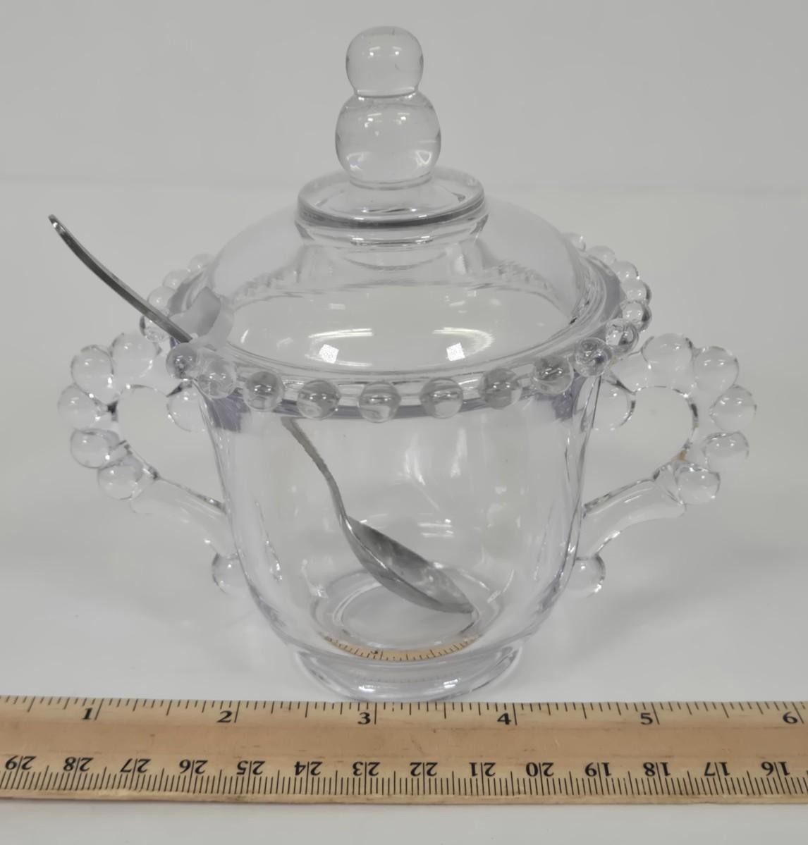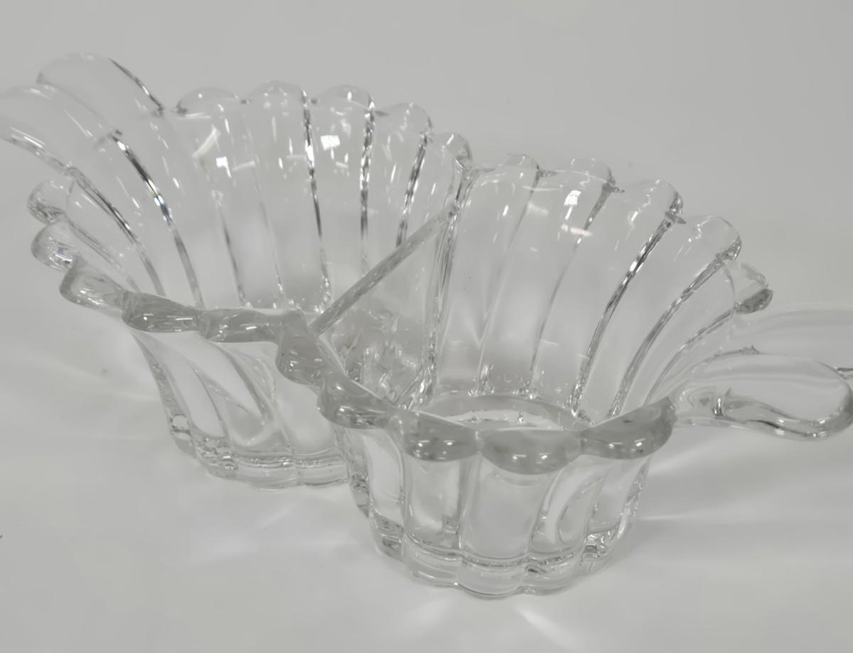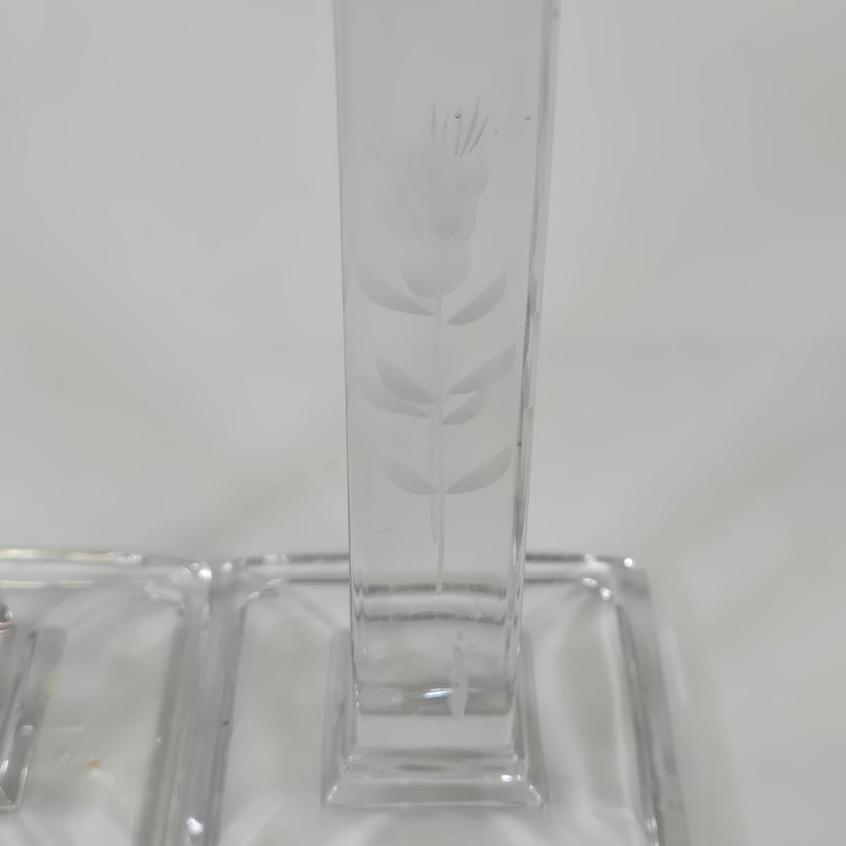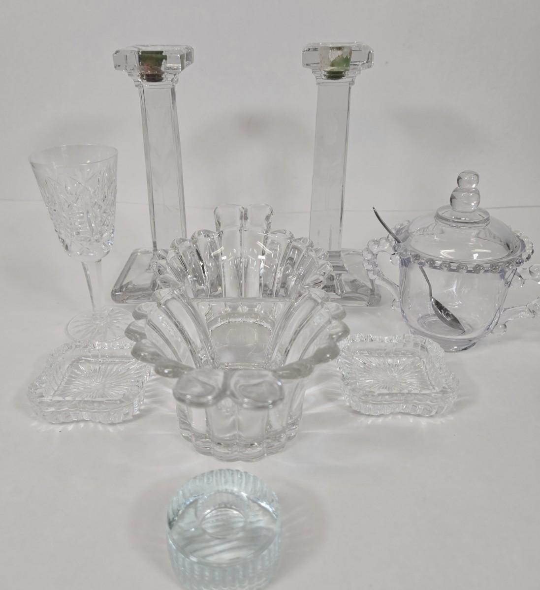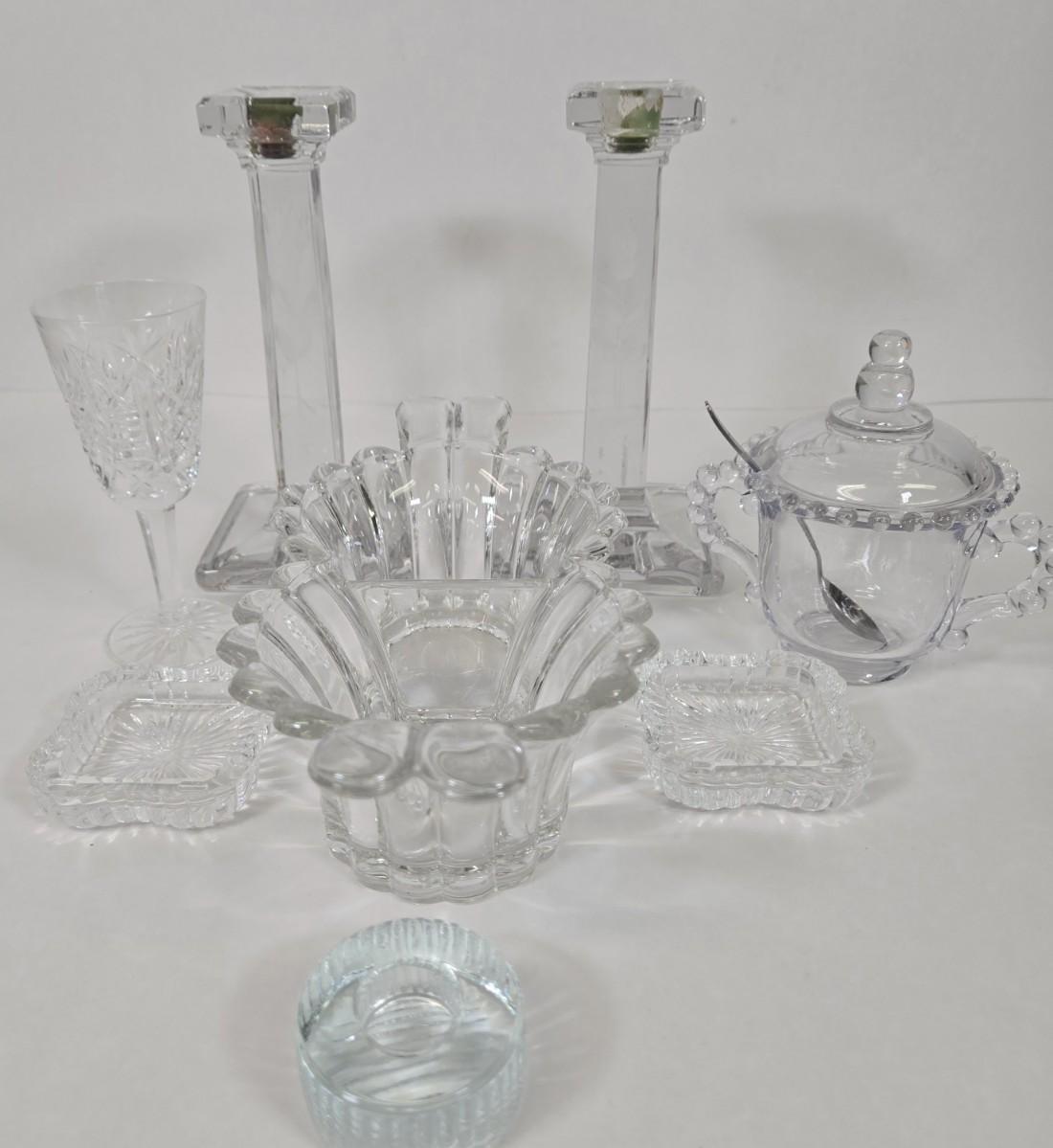 LOT 5: Etched Flower Pair Of Modern Glass Candlesticks, Vintage Imperial Glass Candlewick Clear Glass Condiment Jar with Lid. Heisey Glass Co. Crystolite 2 Compaetment Divided Serving Dish, and More