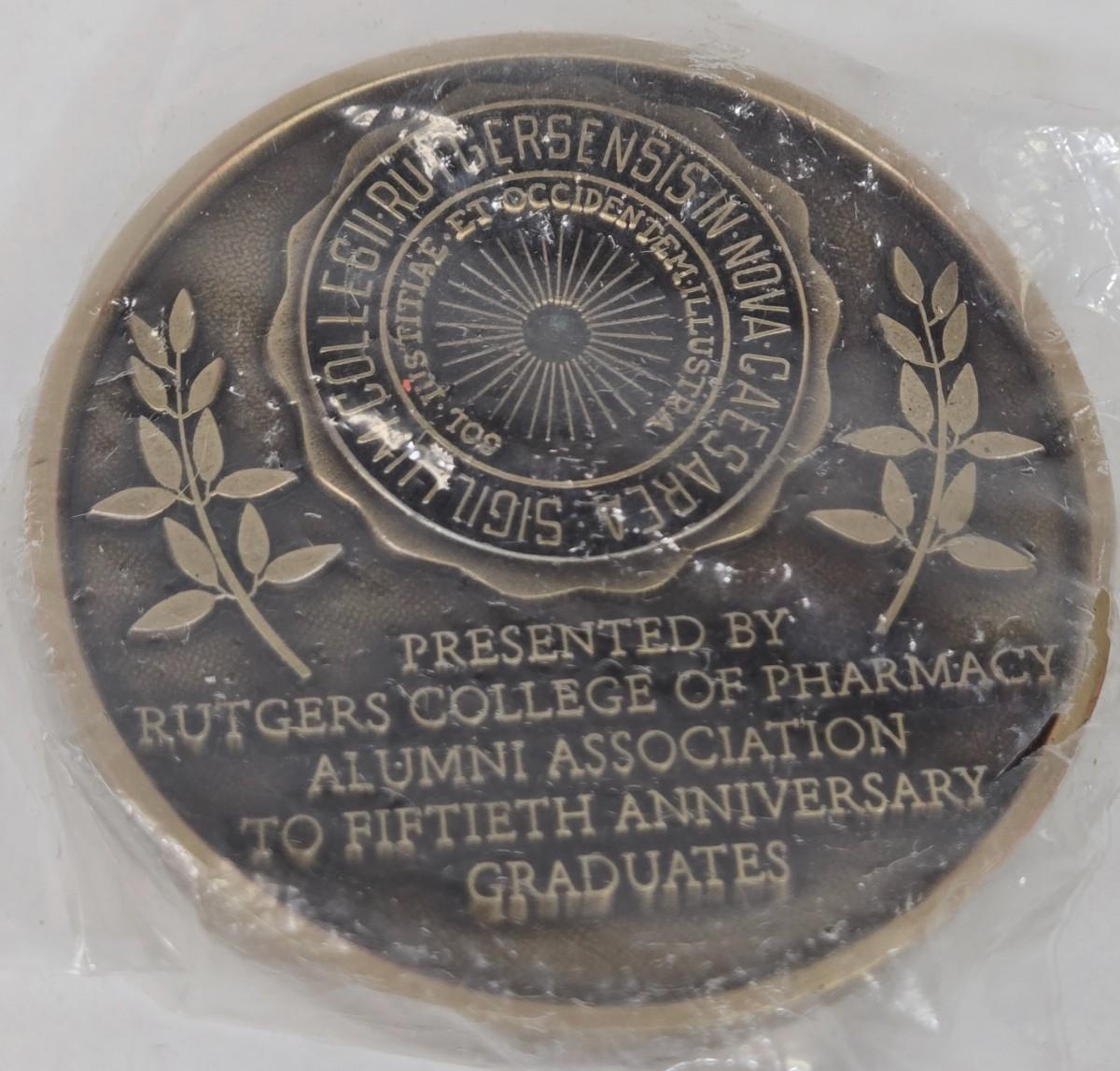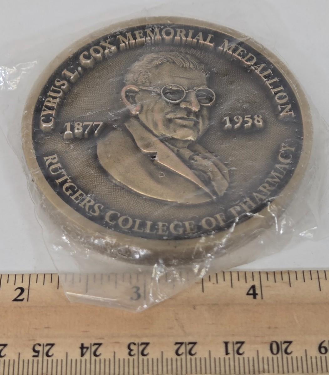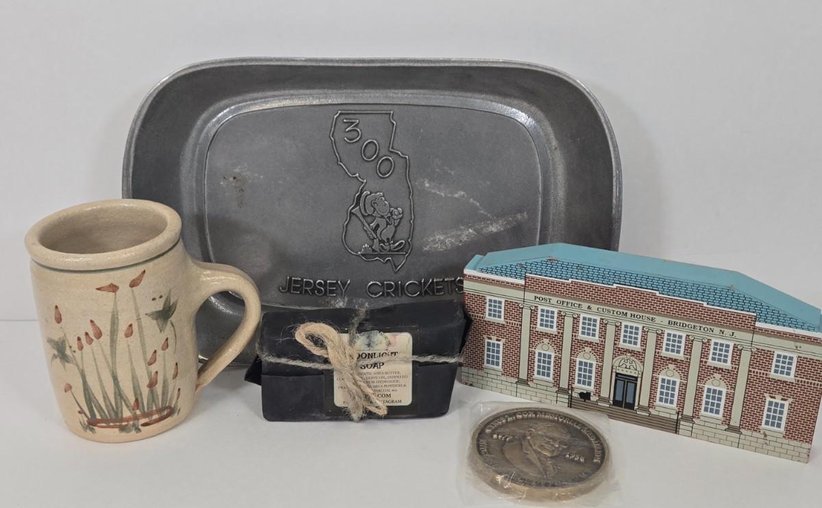 LOT 10: Vintage Wilton Armetale "Jersey Crickets" Commemorative Plate, Cat's Meow Wooden Bridgeton Post Office, Commemorative Medal from Rutgers College of Pharmacy Alumni Association, and More