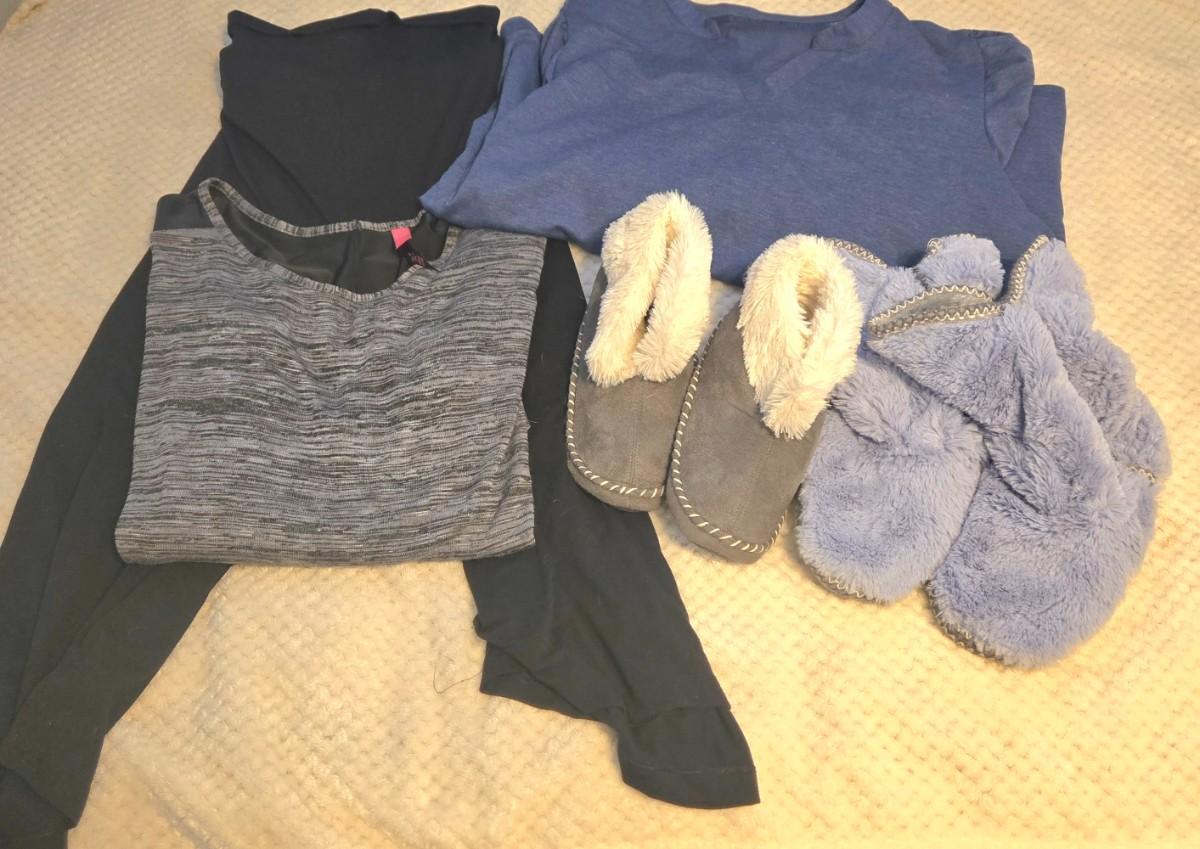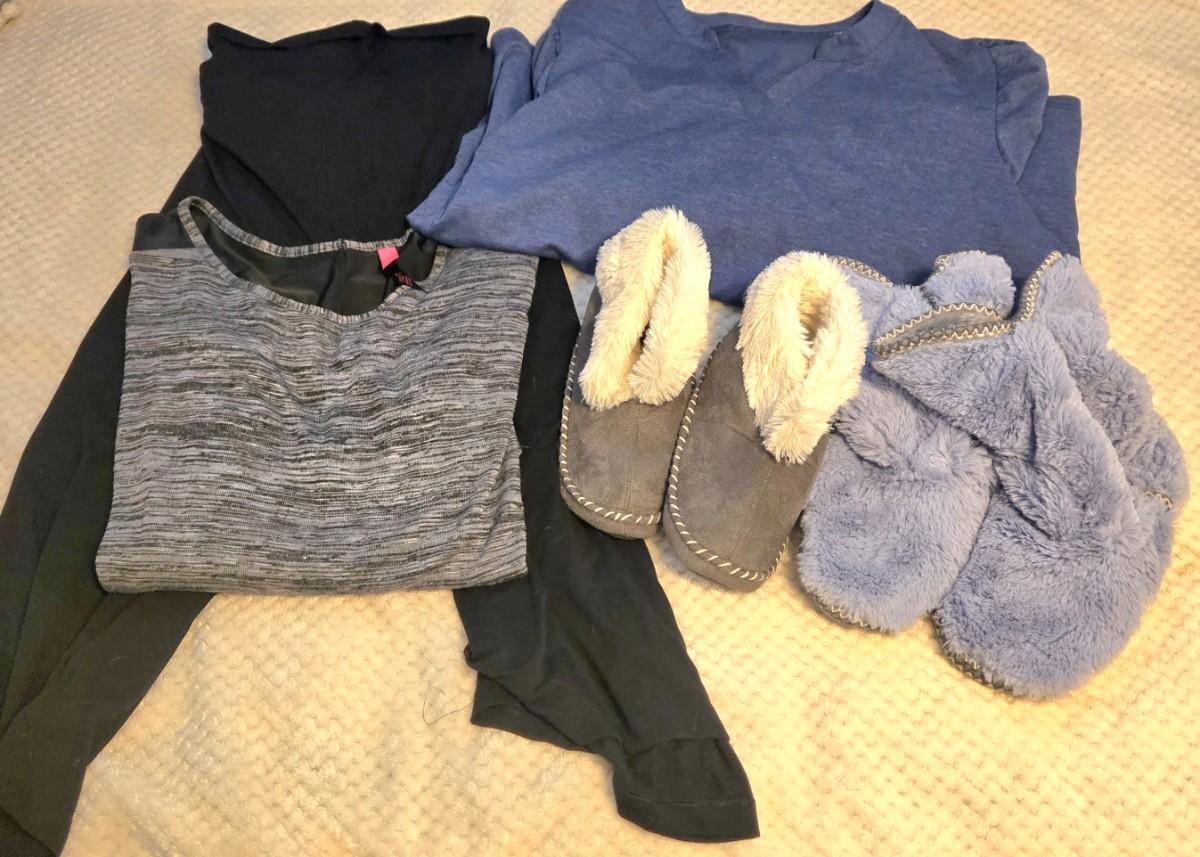 LOT 28: Women's Lounge Pants. 2 Long Sleeve Shirts, and 2 Pairs of Slippers