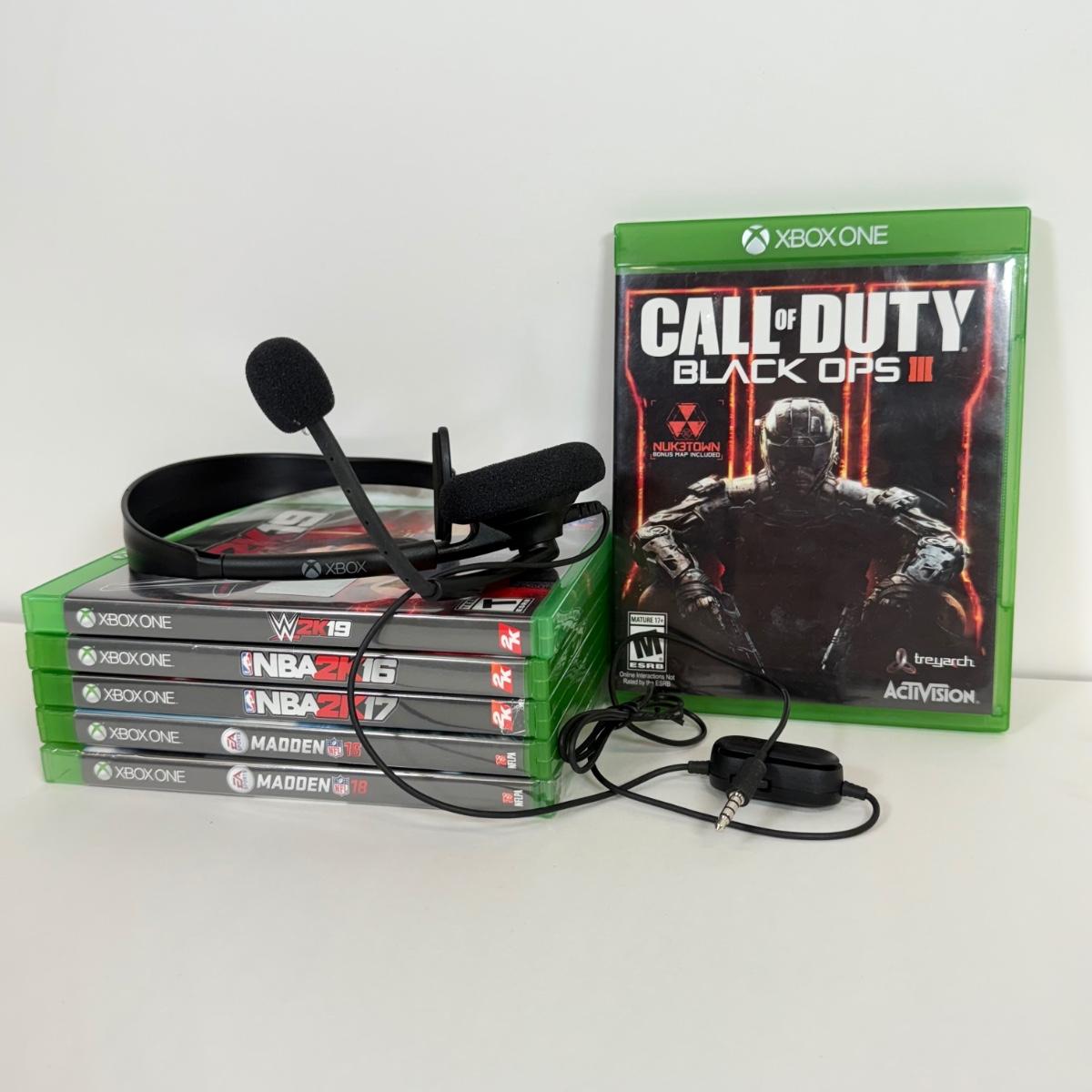 LOT 41: XBOX Headset w/ XBOX One Games: Call of Duty Black Ops III, WW 2k19, NBA 2k16 & 2k17, Madden ‘16 & ‘18