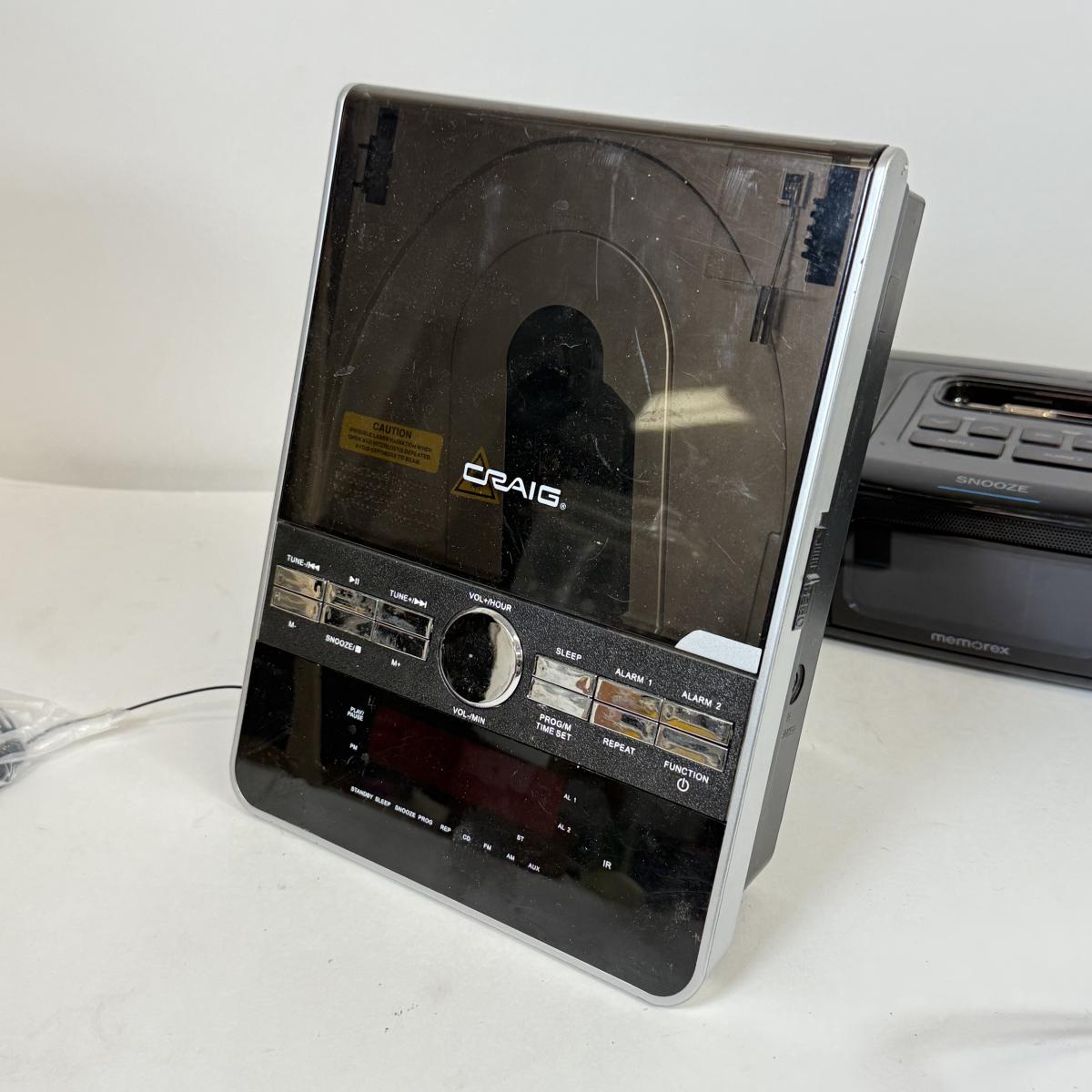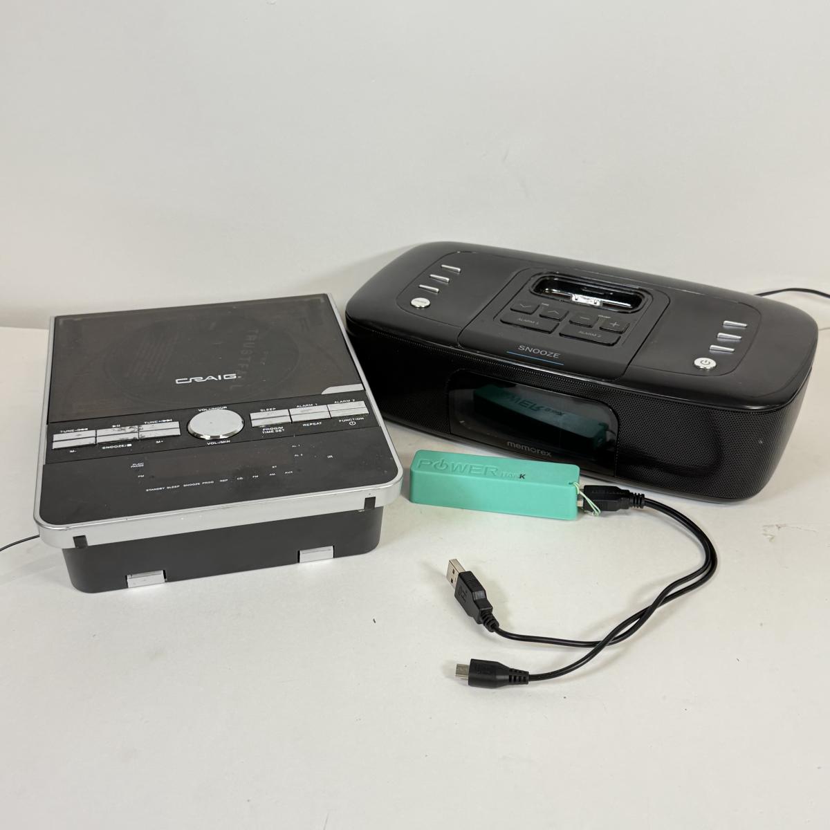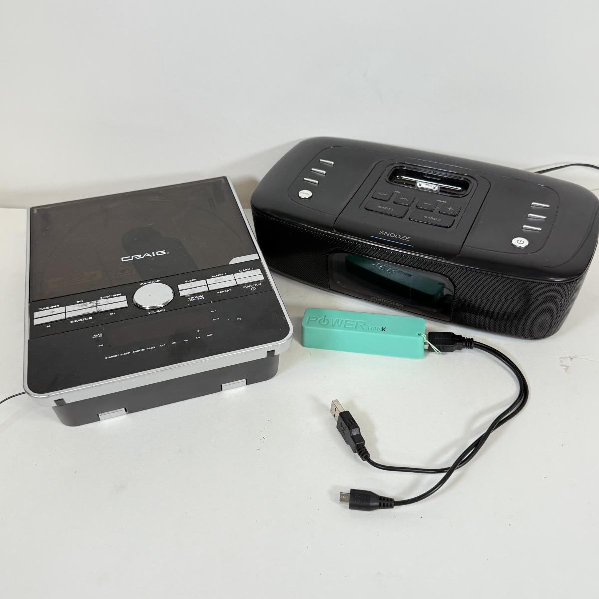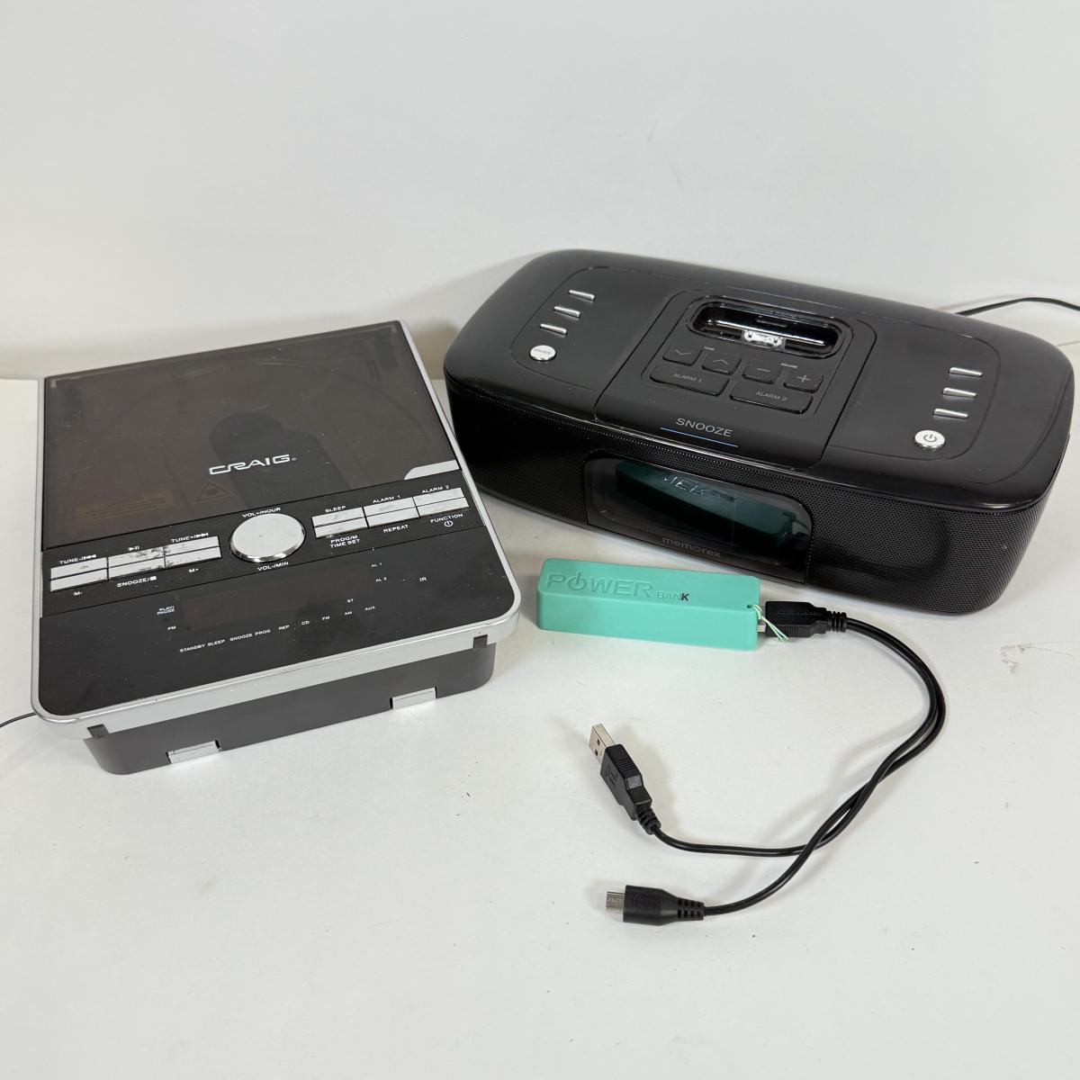 LOT 52: Craig CD Shelf System w/ Dual Alarm Clock AM/FM Stereo Radio Model CM427, Memorex iPhone/iPod Clock Radio Model Mi4290PBLK & Power Brick Portable Charger
