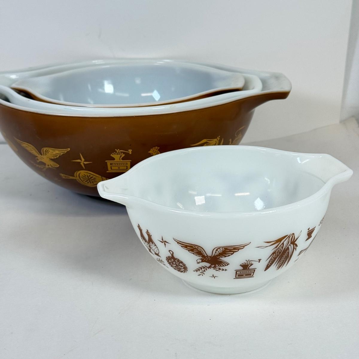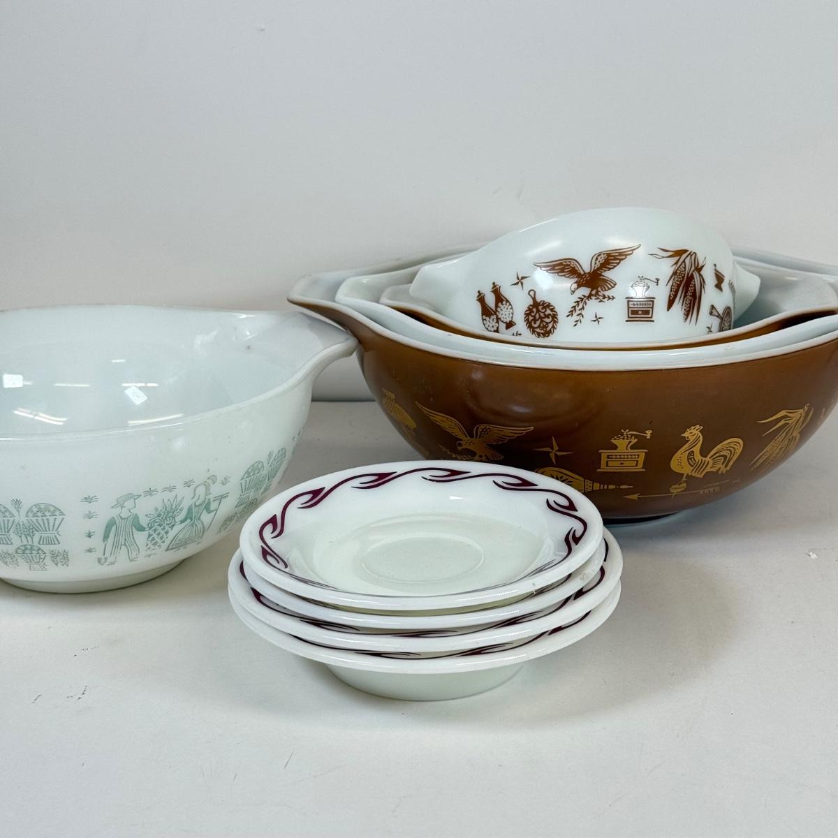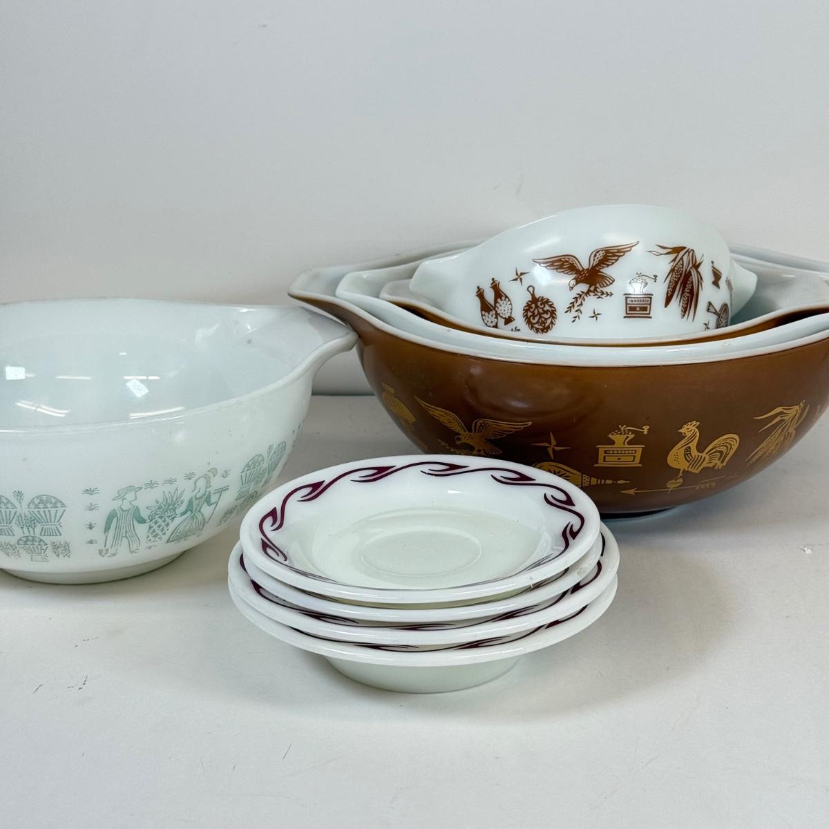 LOT 54: Pyrex Collection: Early American Cinderella Mixing Bowl Set, Amish Butterprint Bowl & (Corning) Ruby Scroll Saucers/Plates