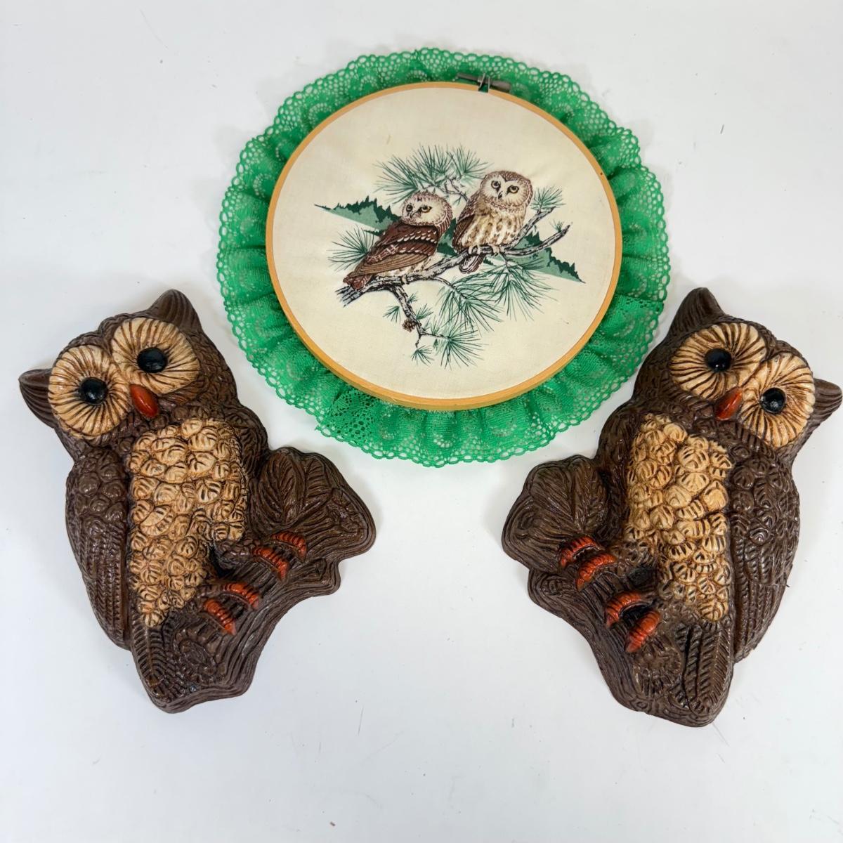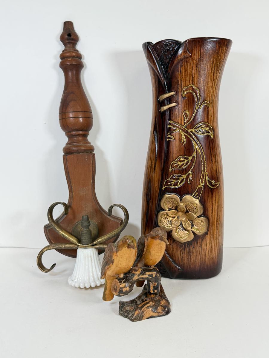 LOT 65: Vintage Paperboard Owl Wall Hangings, Large Plastic Leaf Wall Decor, Wood Floral Vase & More