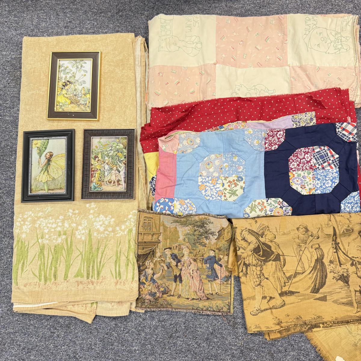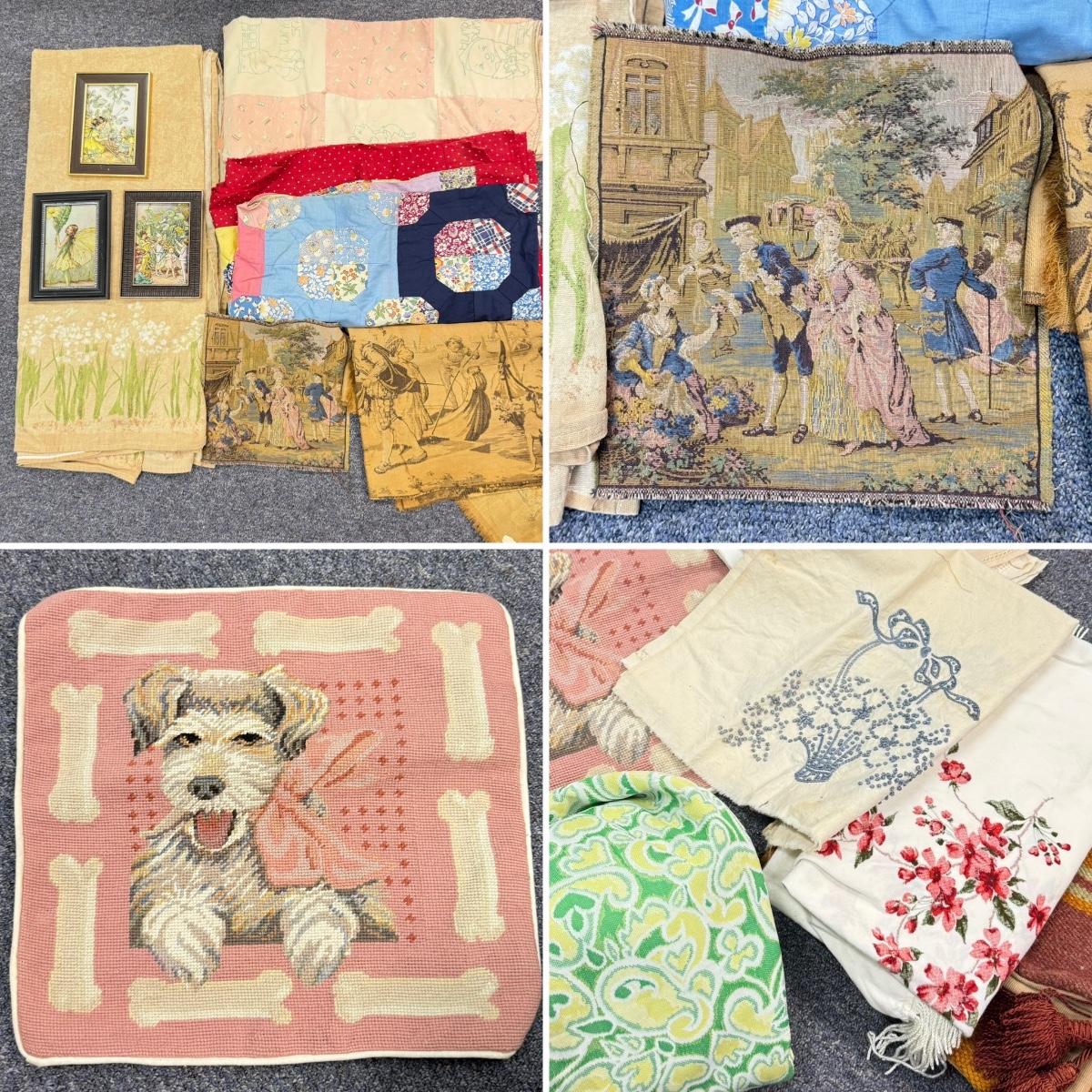 LOT 102: Finished & Unifinished Quilts, Pink Dog Pillow Cover, Embroidered Fabrics & More