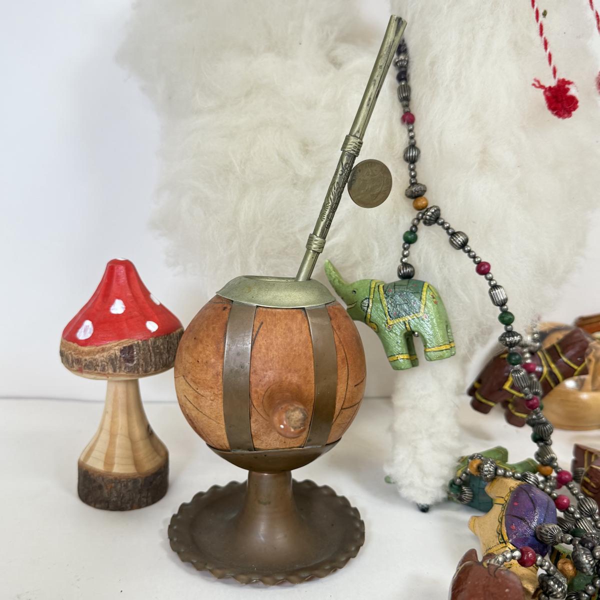 LOT 109: Wool Alpaca, Chilean Gourd Tea Cup w/ Filtered Straw, Corno Gobbo Ornament & More