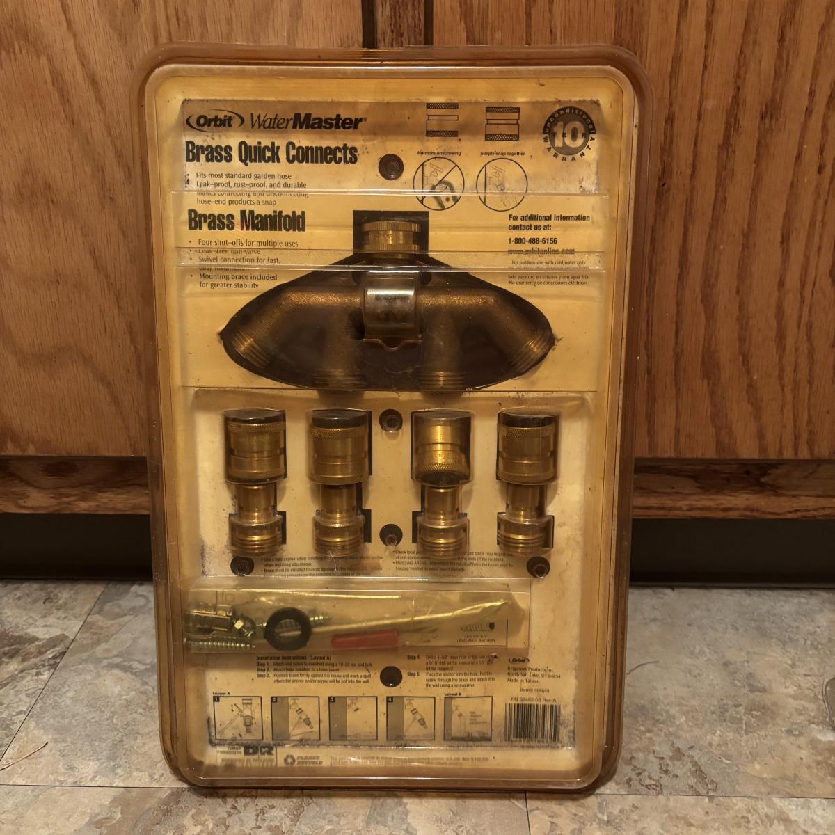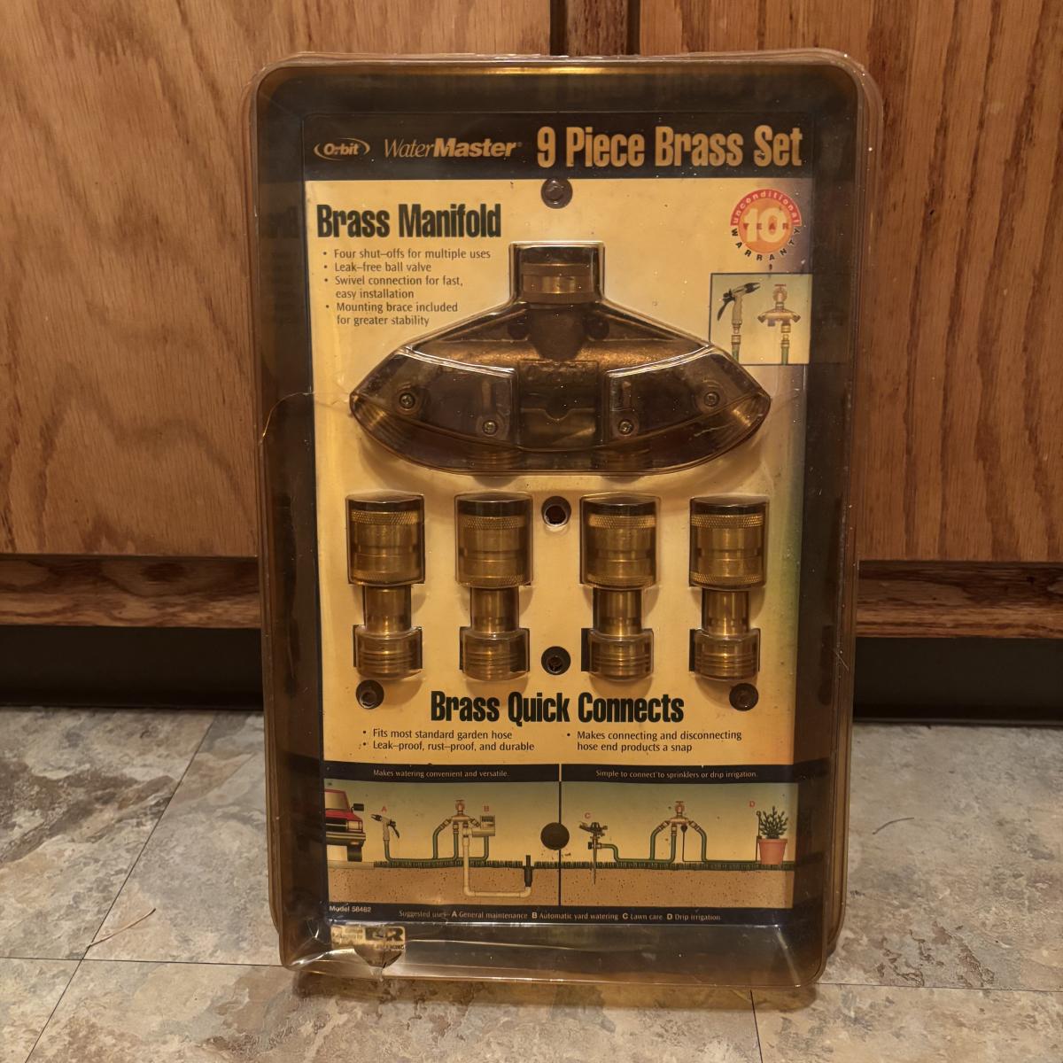 LOT 126: Orbit Brass Manifold Set Multi Hose Connector, Craftsman Precision Drill Guide, Brass Door Lock & a Drill Mount