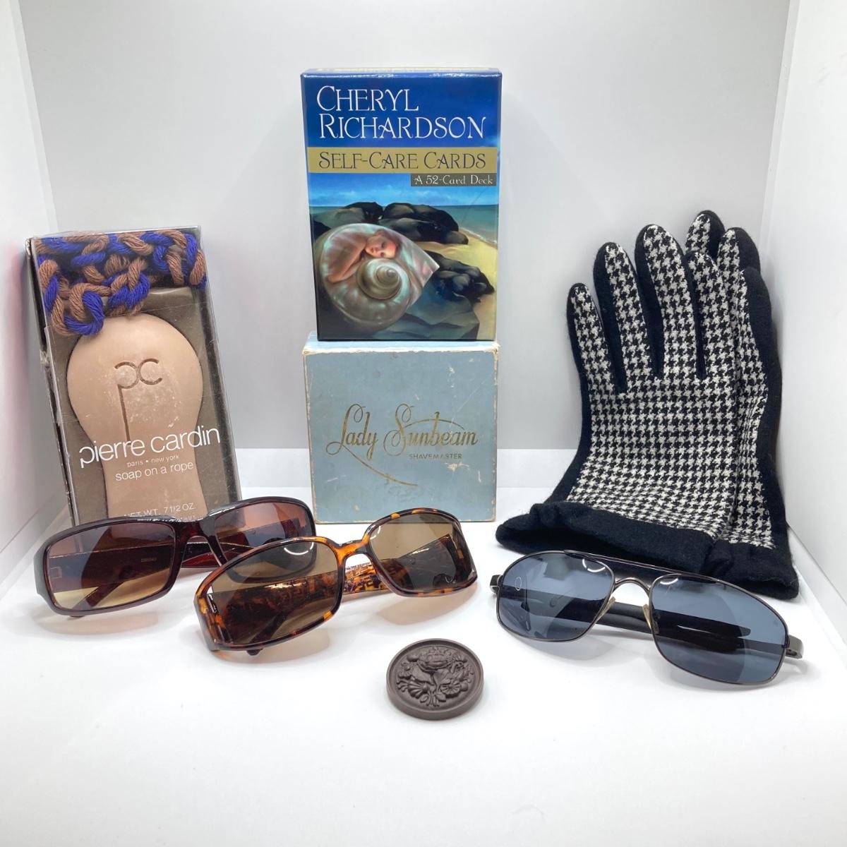 LOT 136: Ladie's Collection - Hounds Tooth Print Gloves, Cheryl Richardson Self-Care Cards, Designer Style Sun Glasses (Coach / DG ), Sunbeam Shavemaster Razor, Ceramico Pin (England) & More