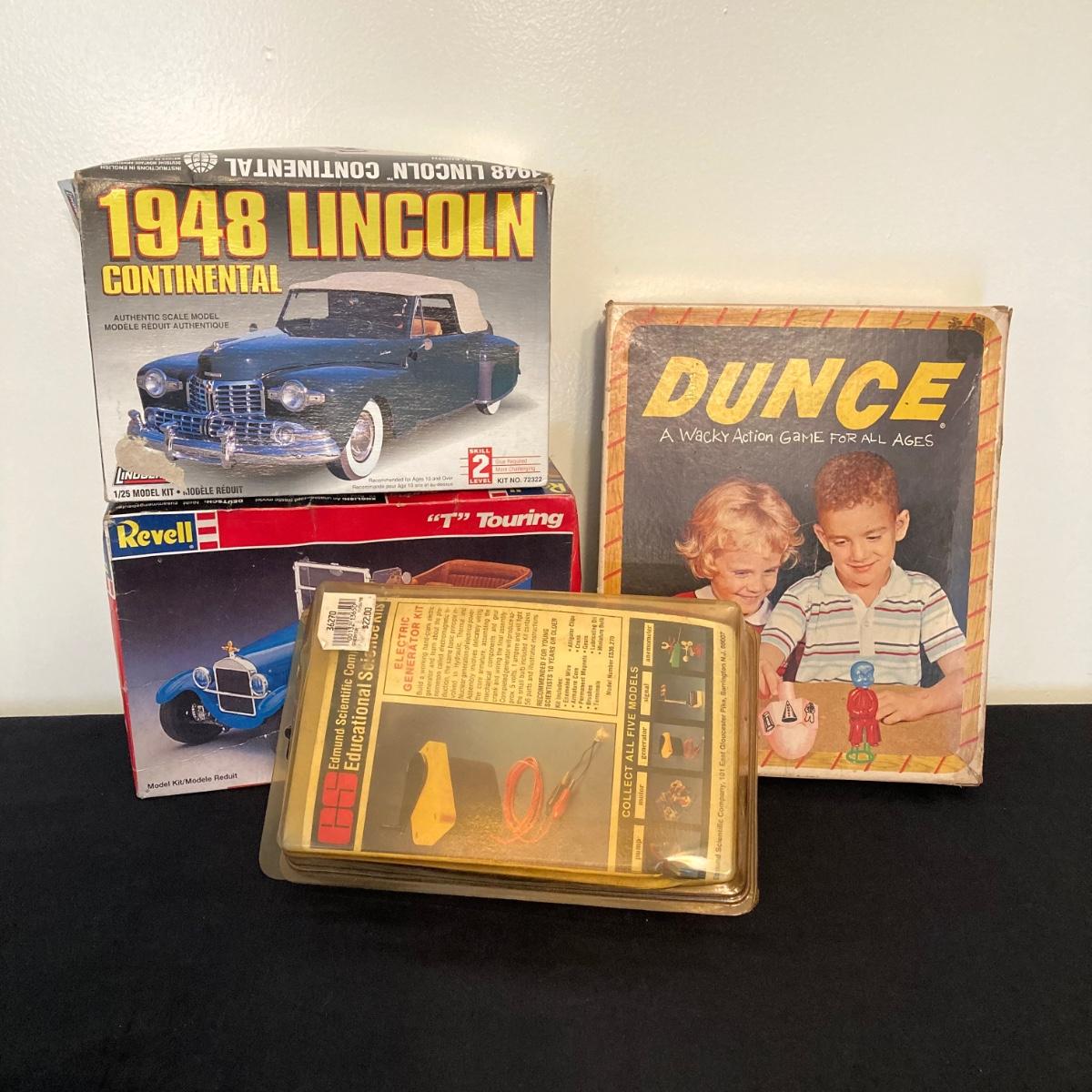 LOT 141: Vintage Models, Games and More - Lindberg 1948 Lincoln Continental No. 72322, Revell "T" Touring, Dunce and Generator Kit