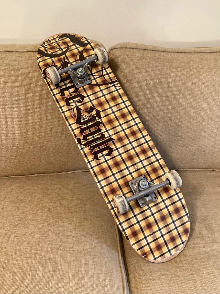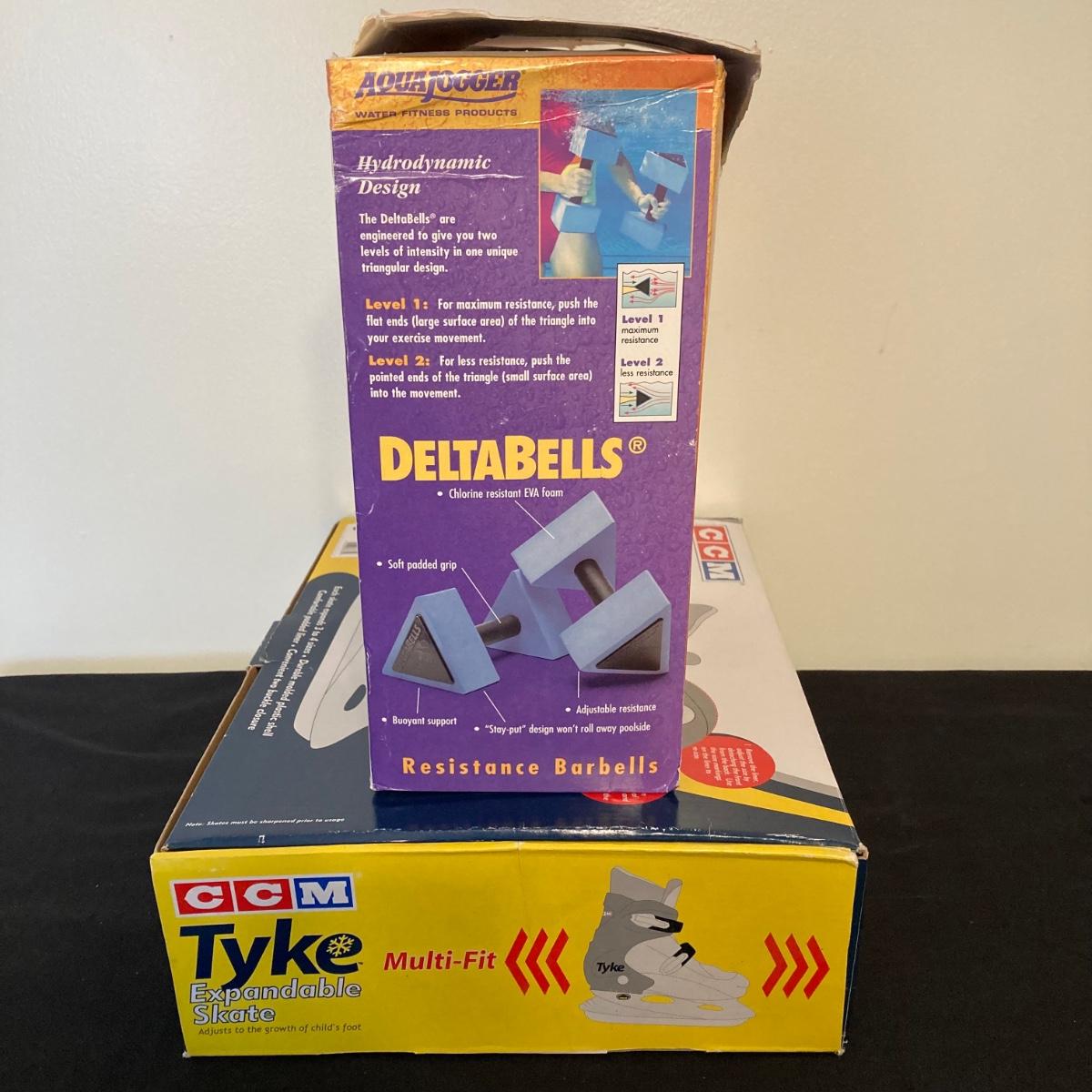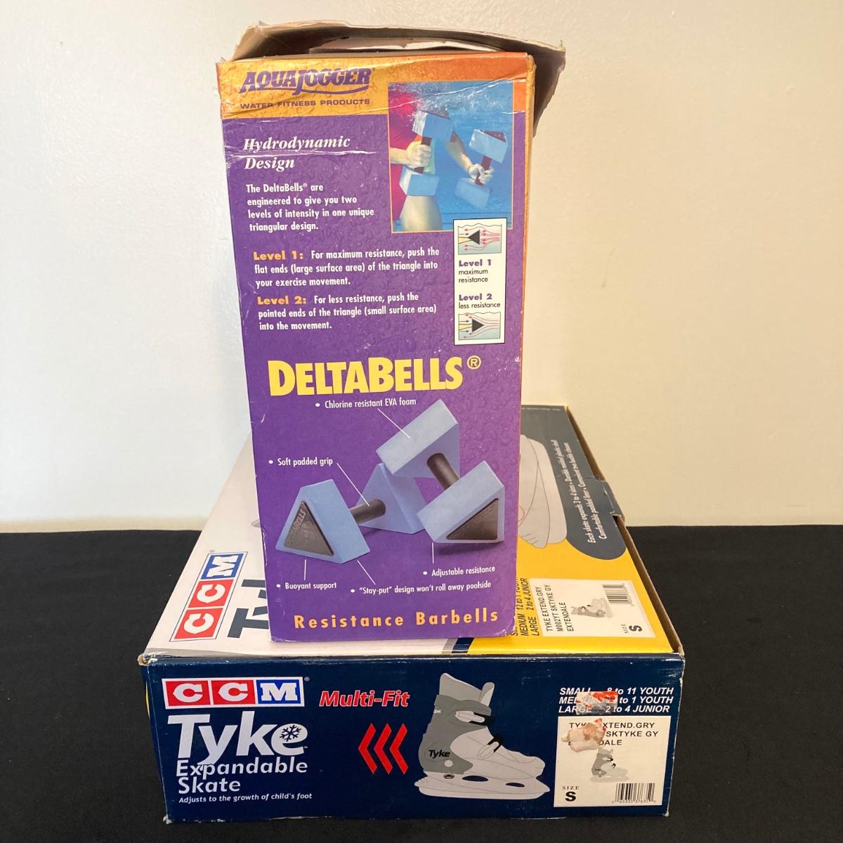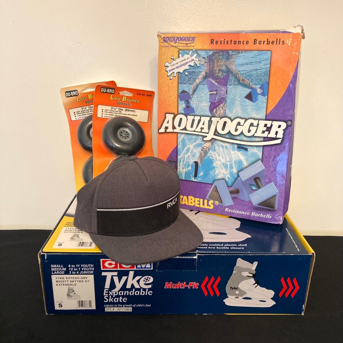 LOT 143: Fitness Collection - CCM Tyke Expandable Ice Skates, Aqua Jogger Deltabells, Replacement Wheels, Free Spirit Skateboard and RVCA Cap