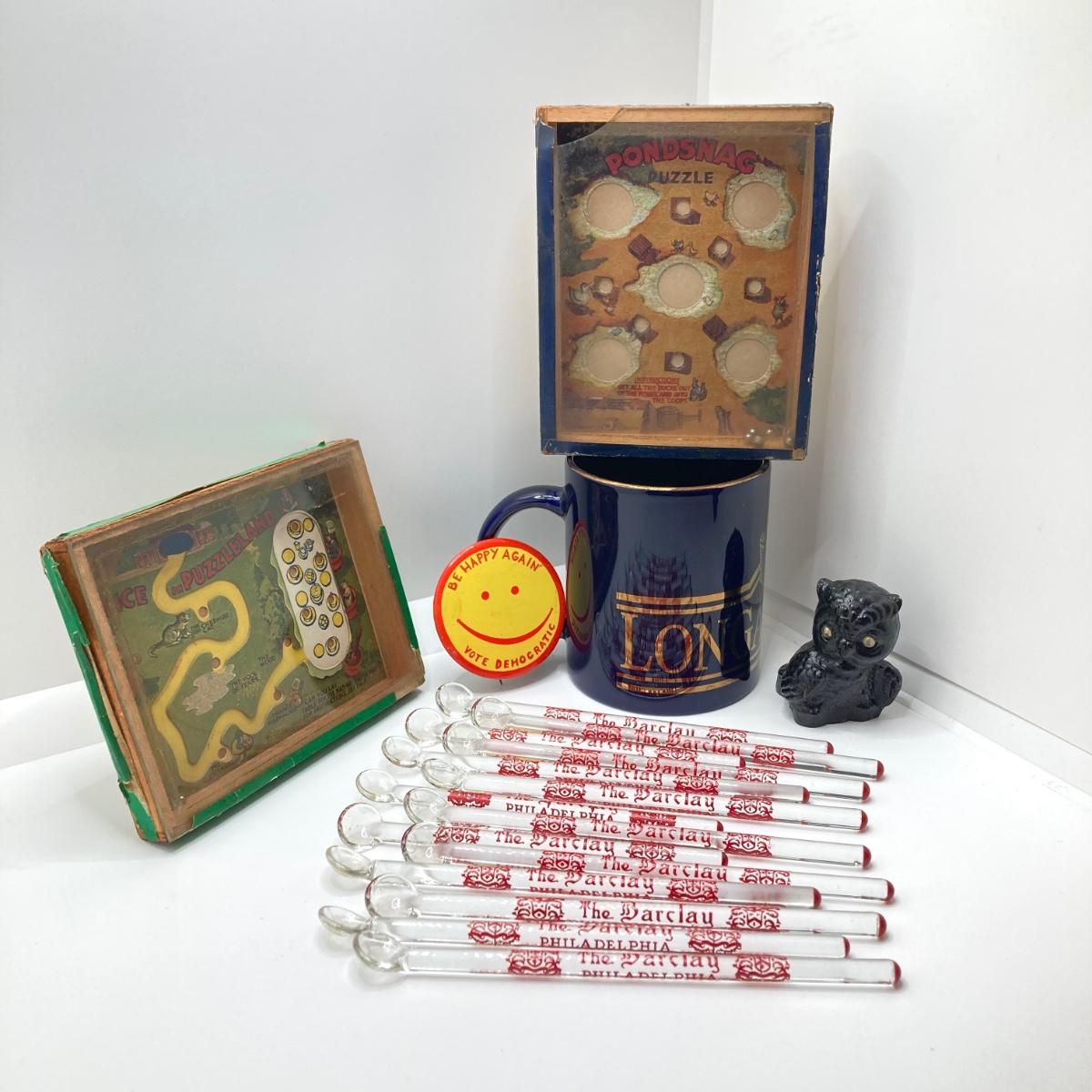 LOT 147: Vintage This and That Collection - Longaberger Mug, Alice in Puzzleland / Pondsnag Puzzles, The Barclay Philadelpha Glass Stirrers and More