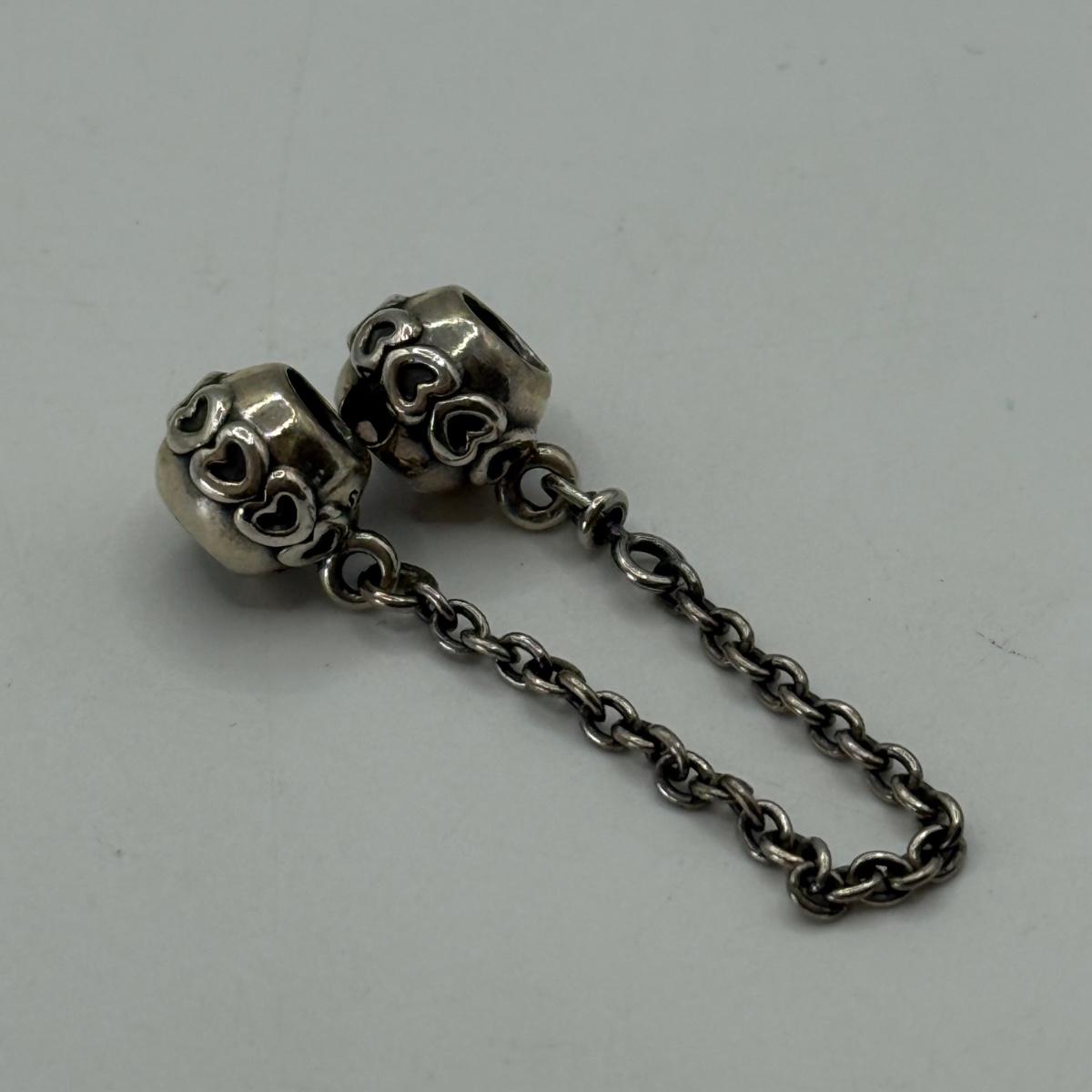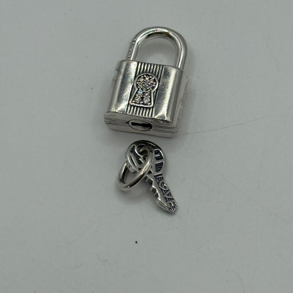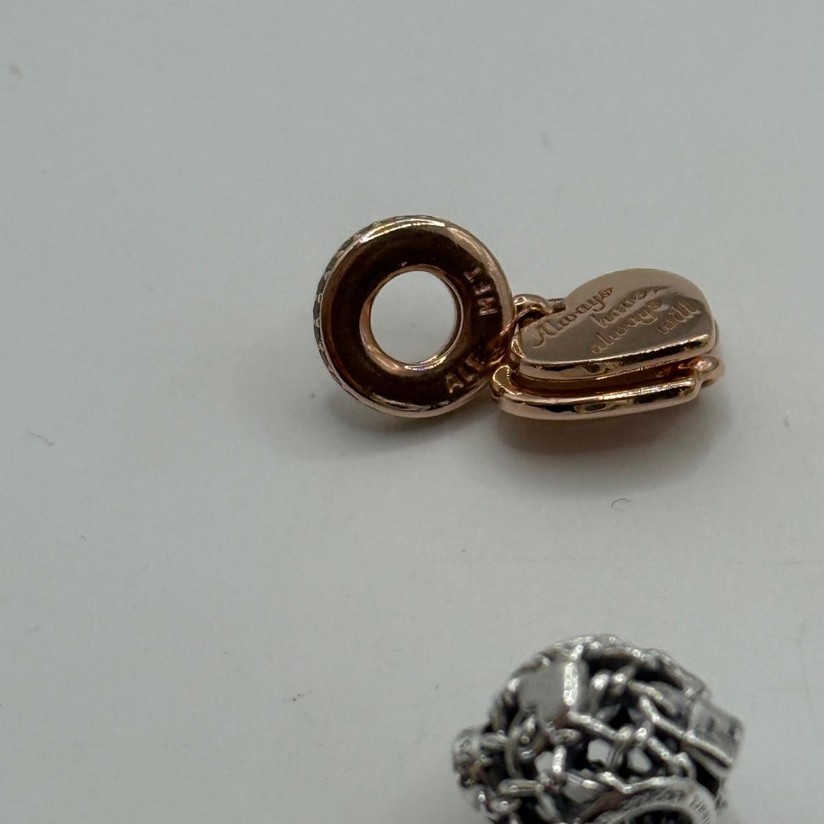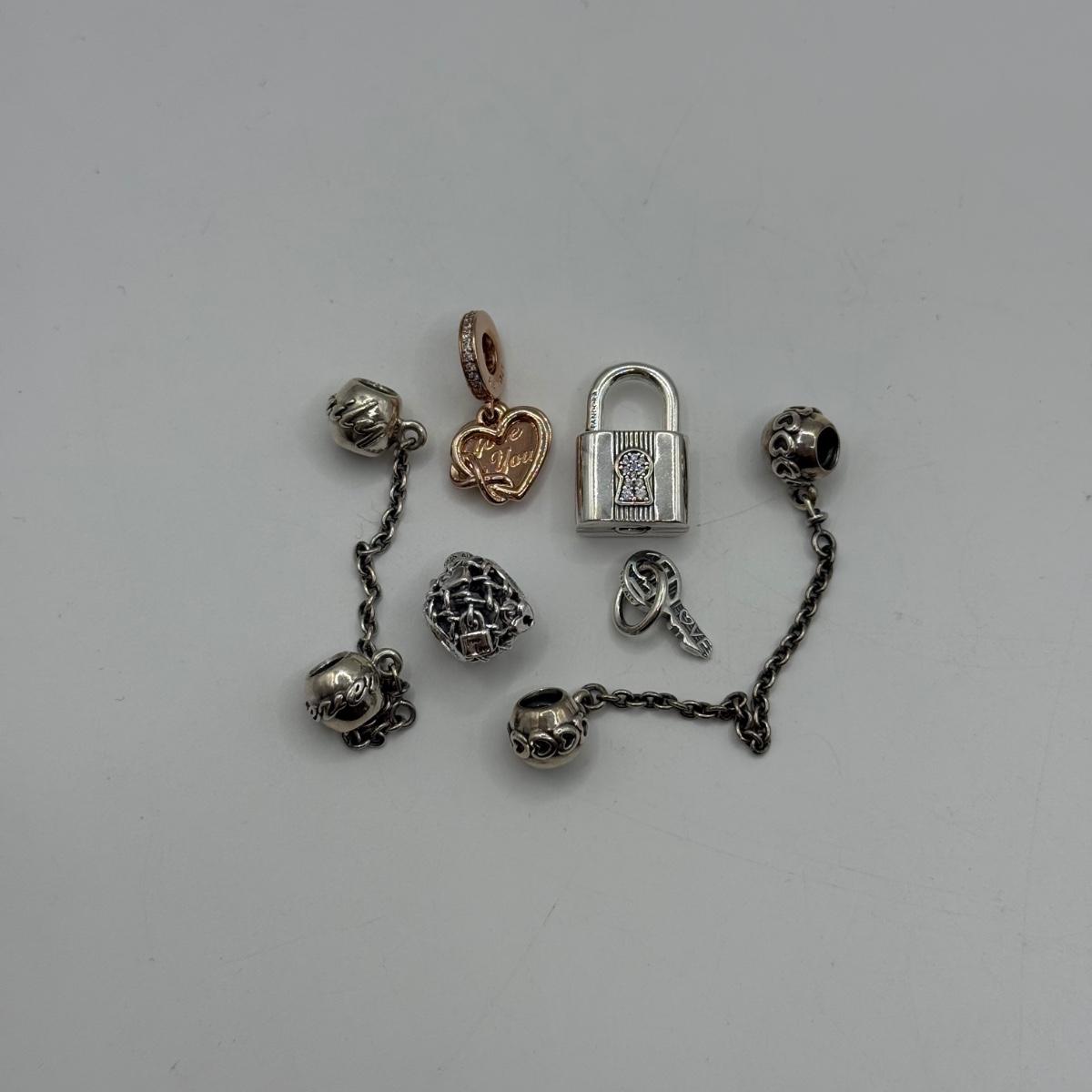 LOT 32J: 925 ALE Sterling Silver Pandora Bracelet Charms: Lock & Key, Rose Gold "Love You," Heart and Family Forever Safety Chains (22.76g)