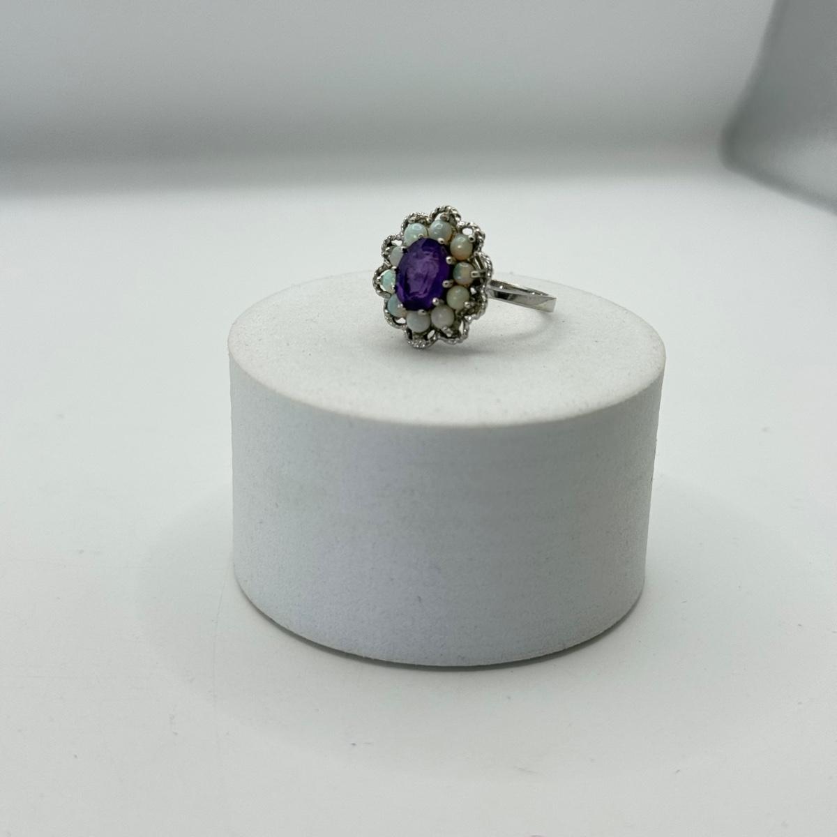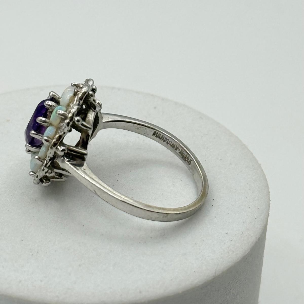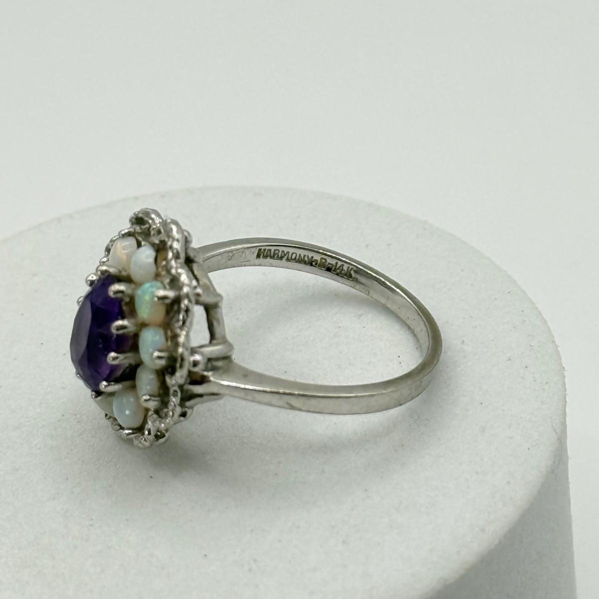 LOT 40J: Gorgeous 14kt White Gold Amethyst & Opal Size 6 Ring (3.34g)