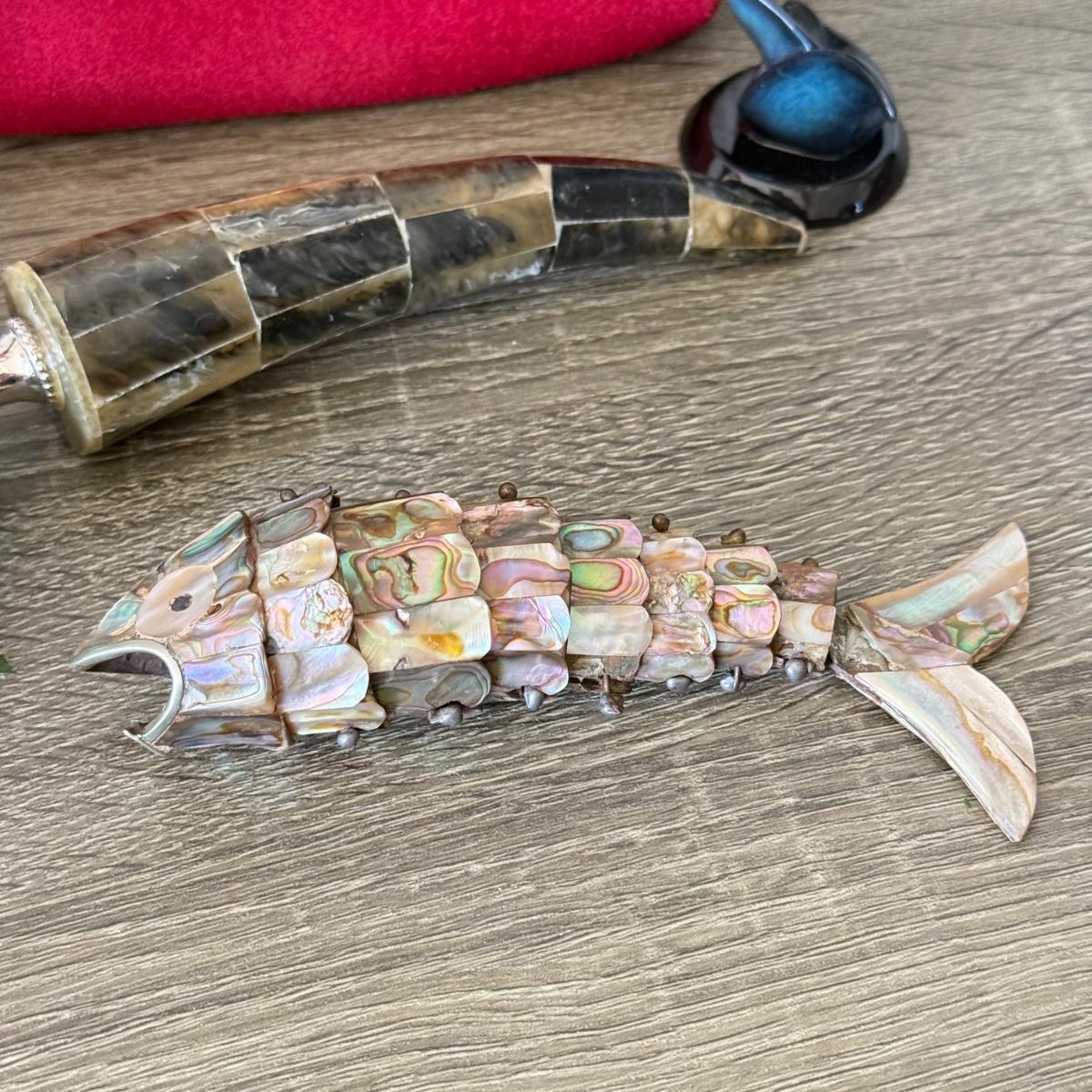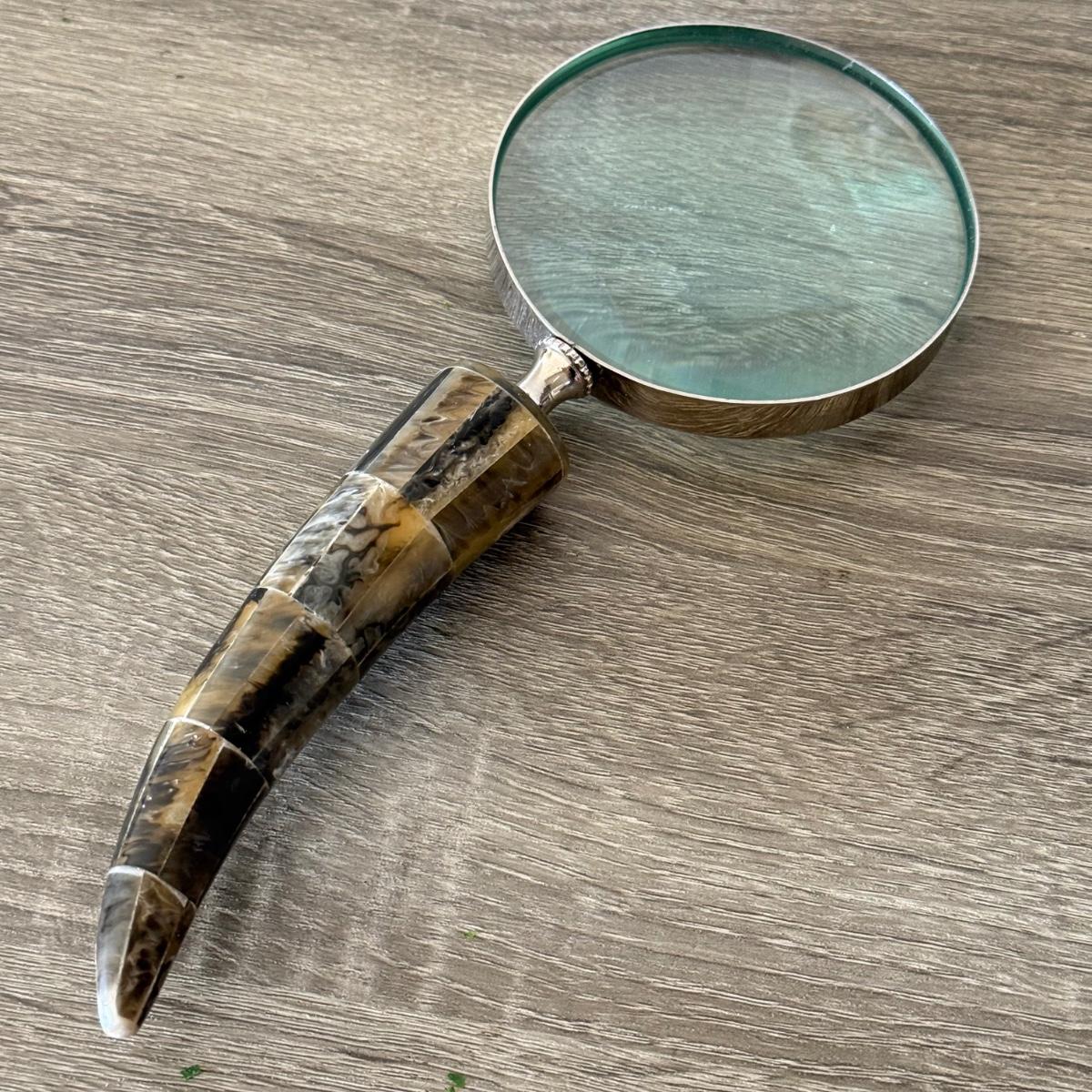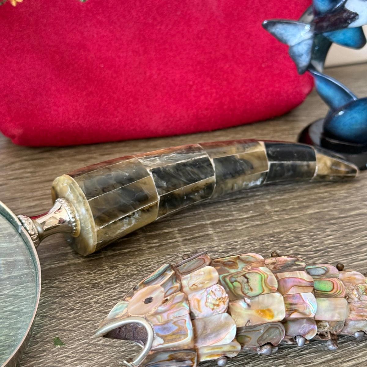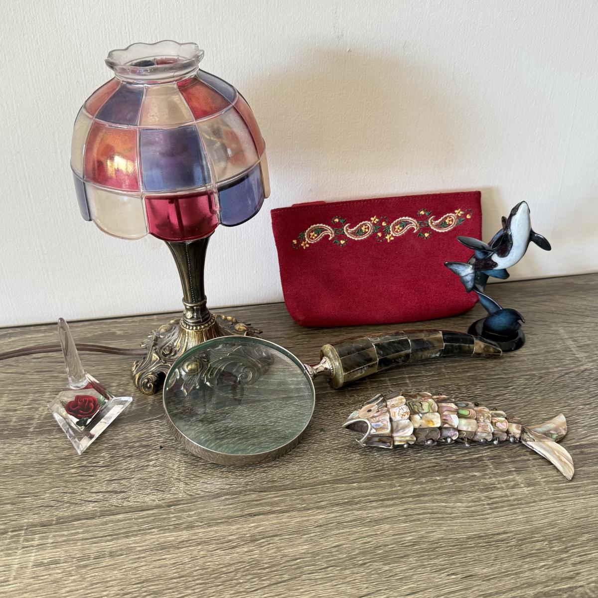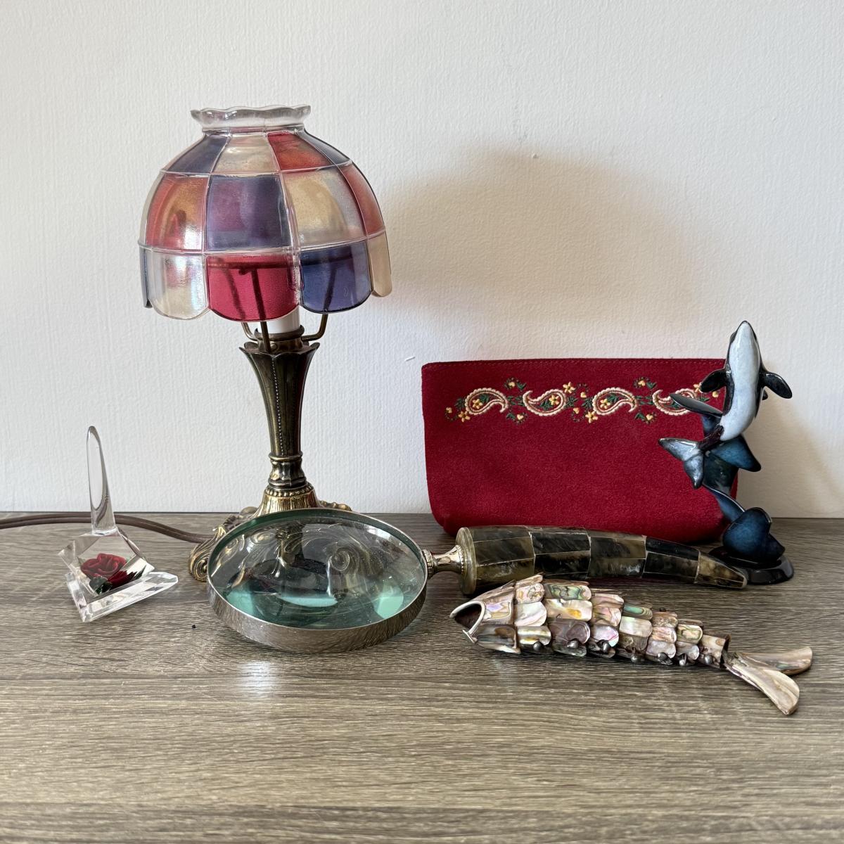 LOT 92F: Vintage Glass Shade Lamp, Abalone Fish, Magnifying Glass & More