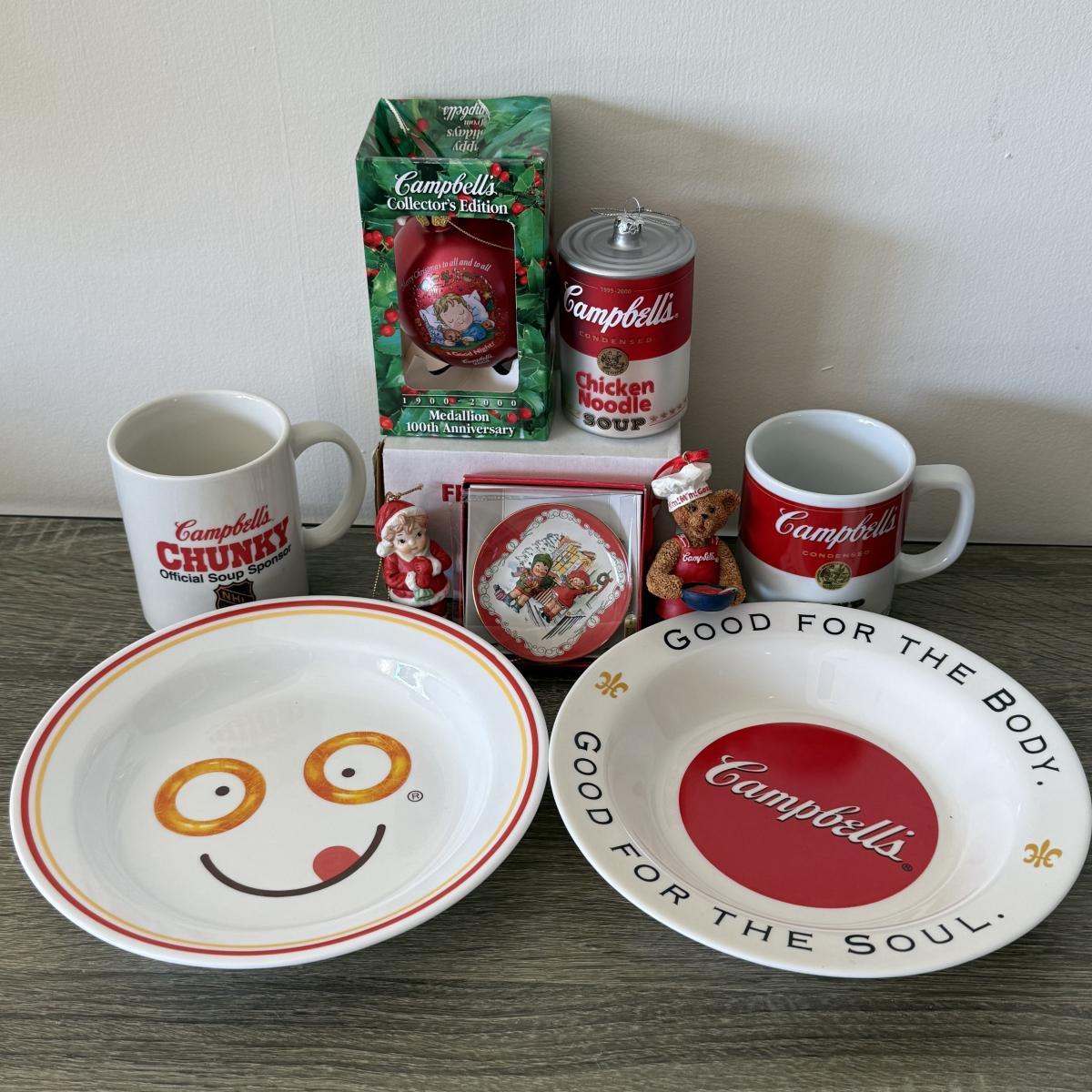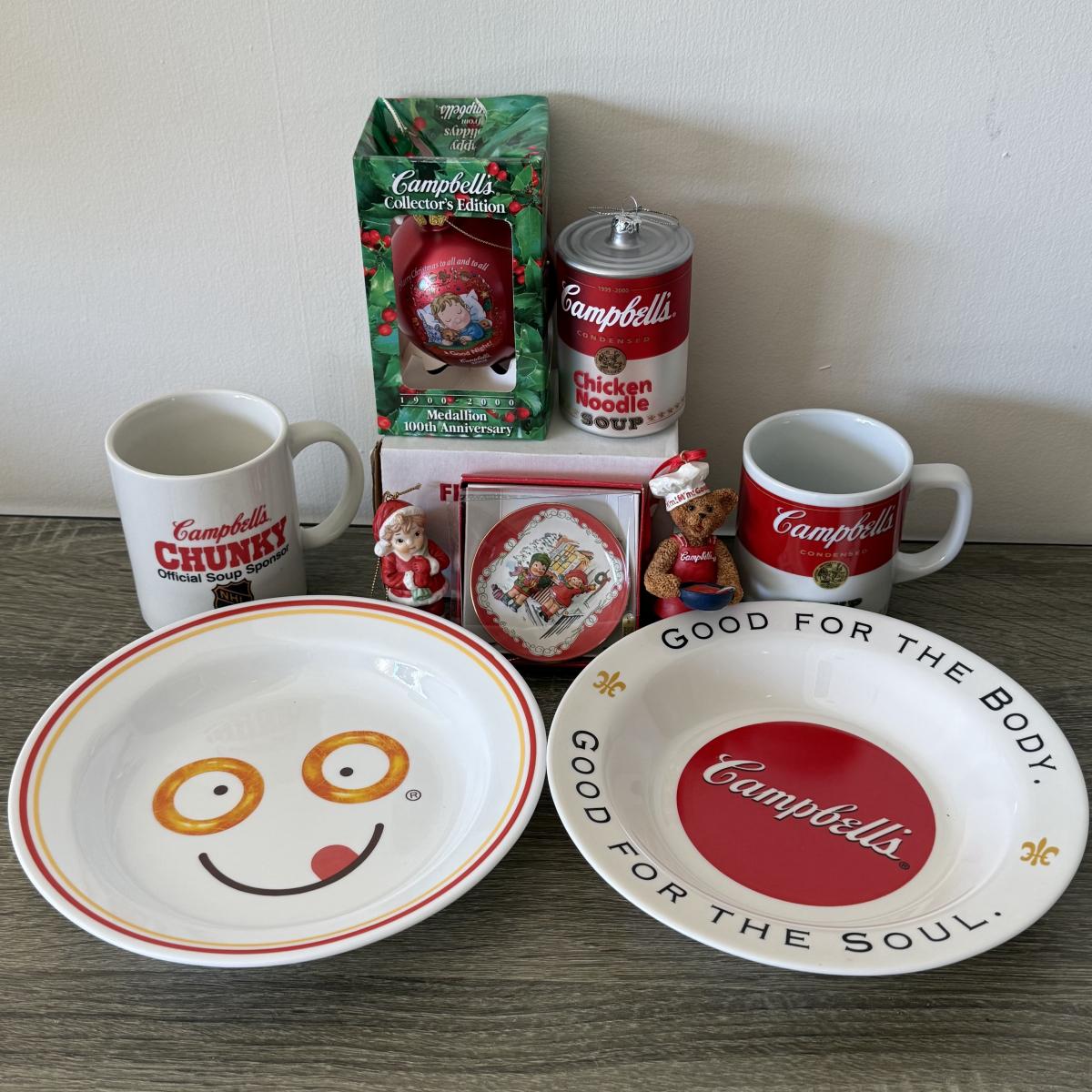 LOT 98K: Spaghettio's & Campbell's Soup Bowls w/ Collection of Campbell's Mugs & Christmas Tree Ornaments