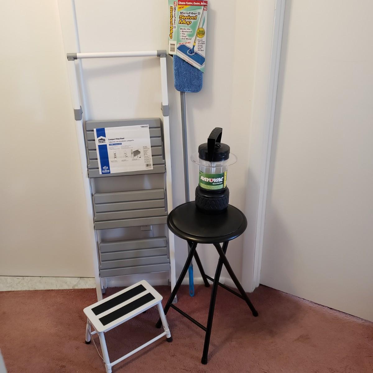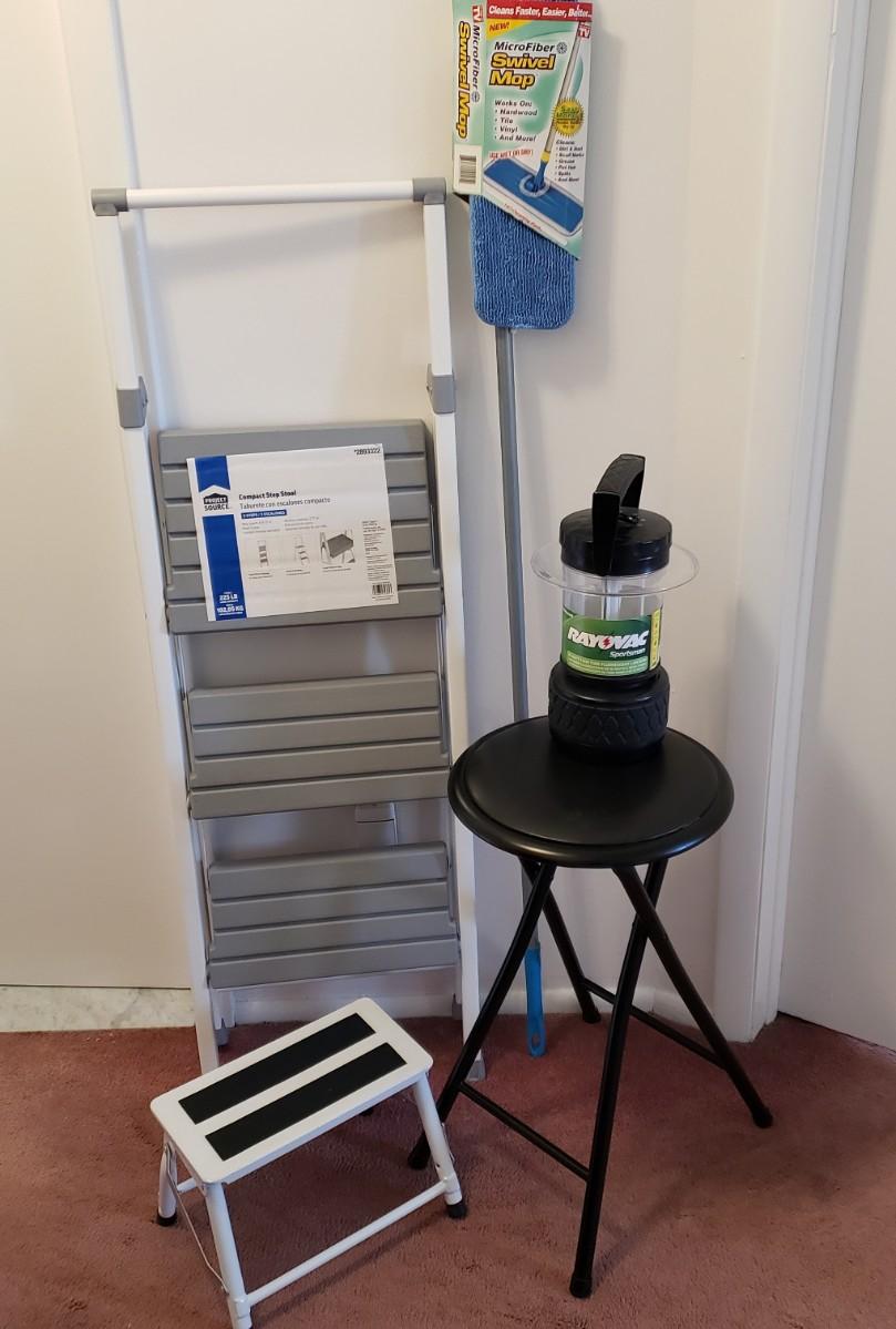 LOT 175X: Step Stools, Folding Seat, Rayovac Lantern & Swivel Mop