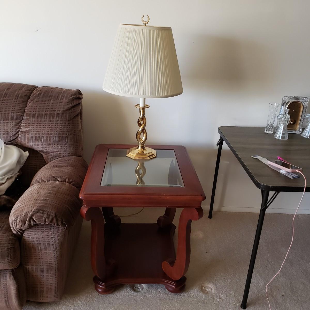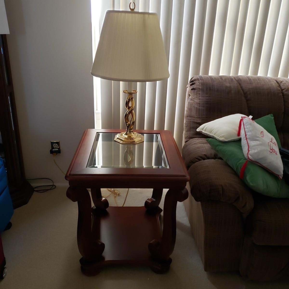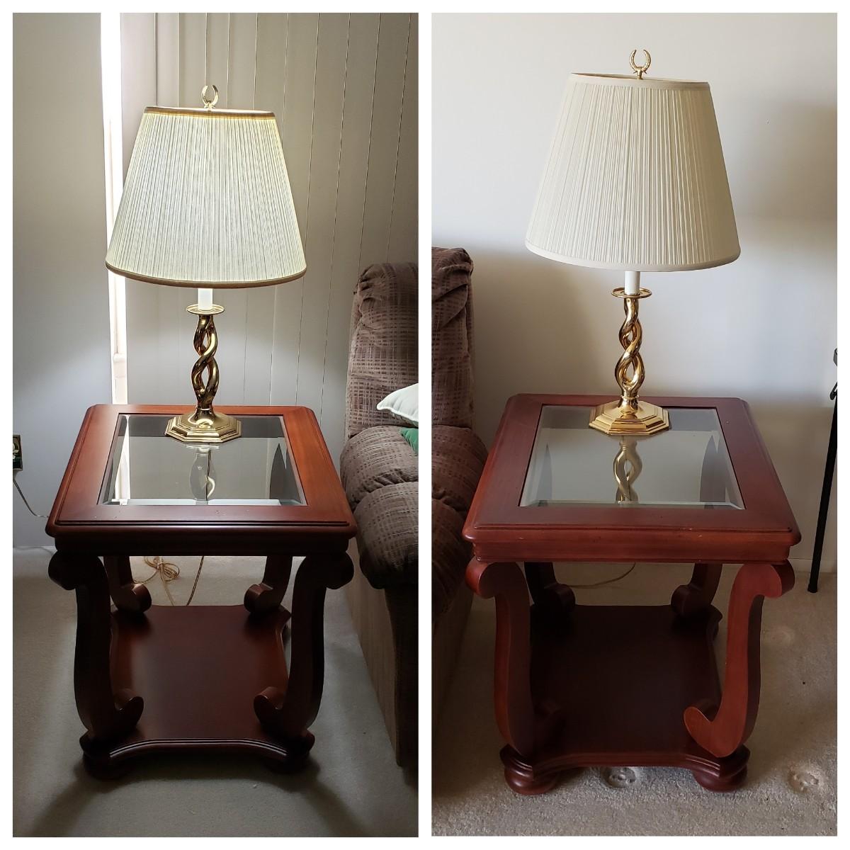 LOT 211L: Pair of Matching End Tables & Brass Lamps