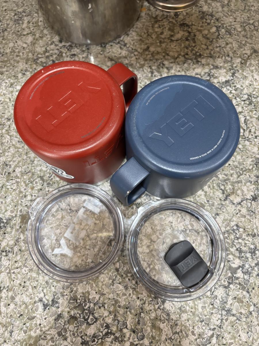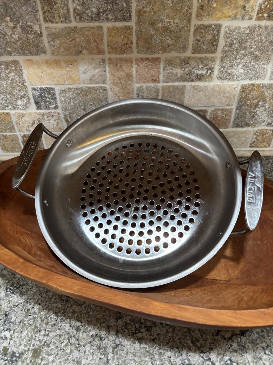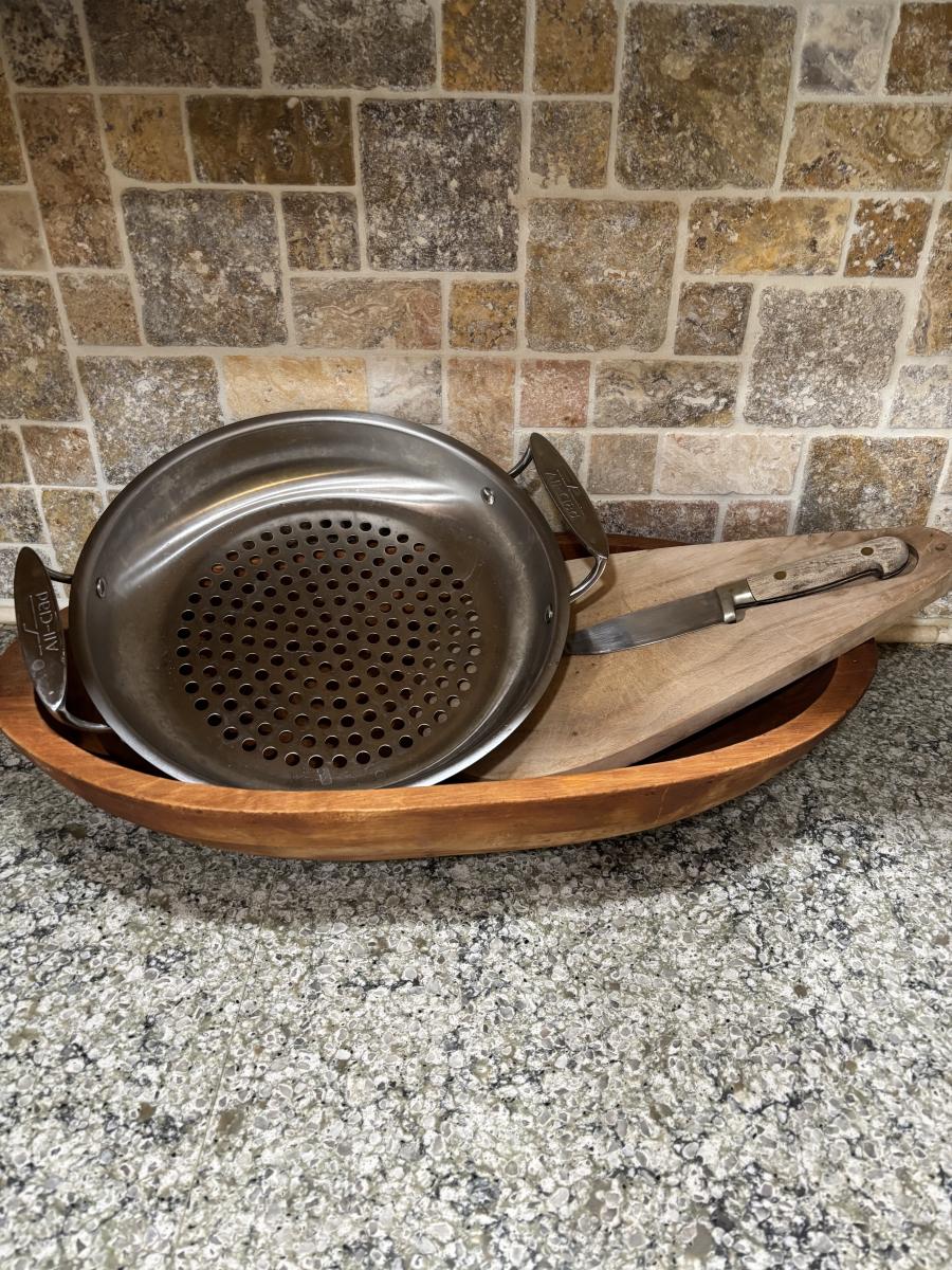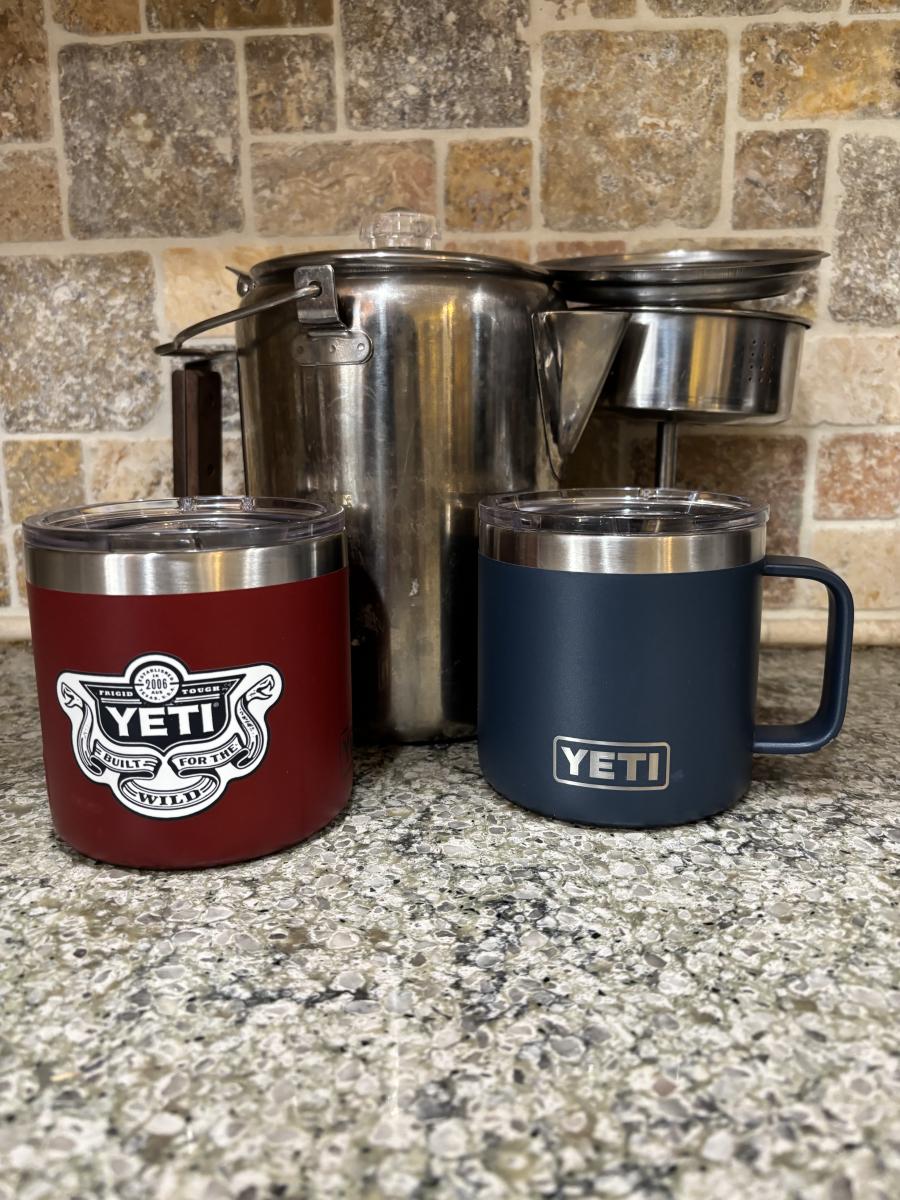 LOT 101: Large Wooden Bowl (21" x 11"), Yeti Mugs & Can Holders, All-Clad, Grill Basket, Cheese Board, Peculator Coffee Pot