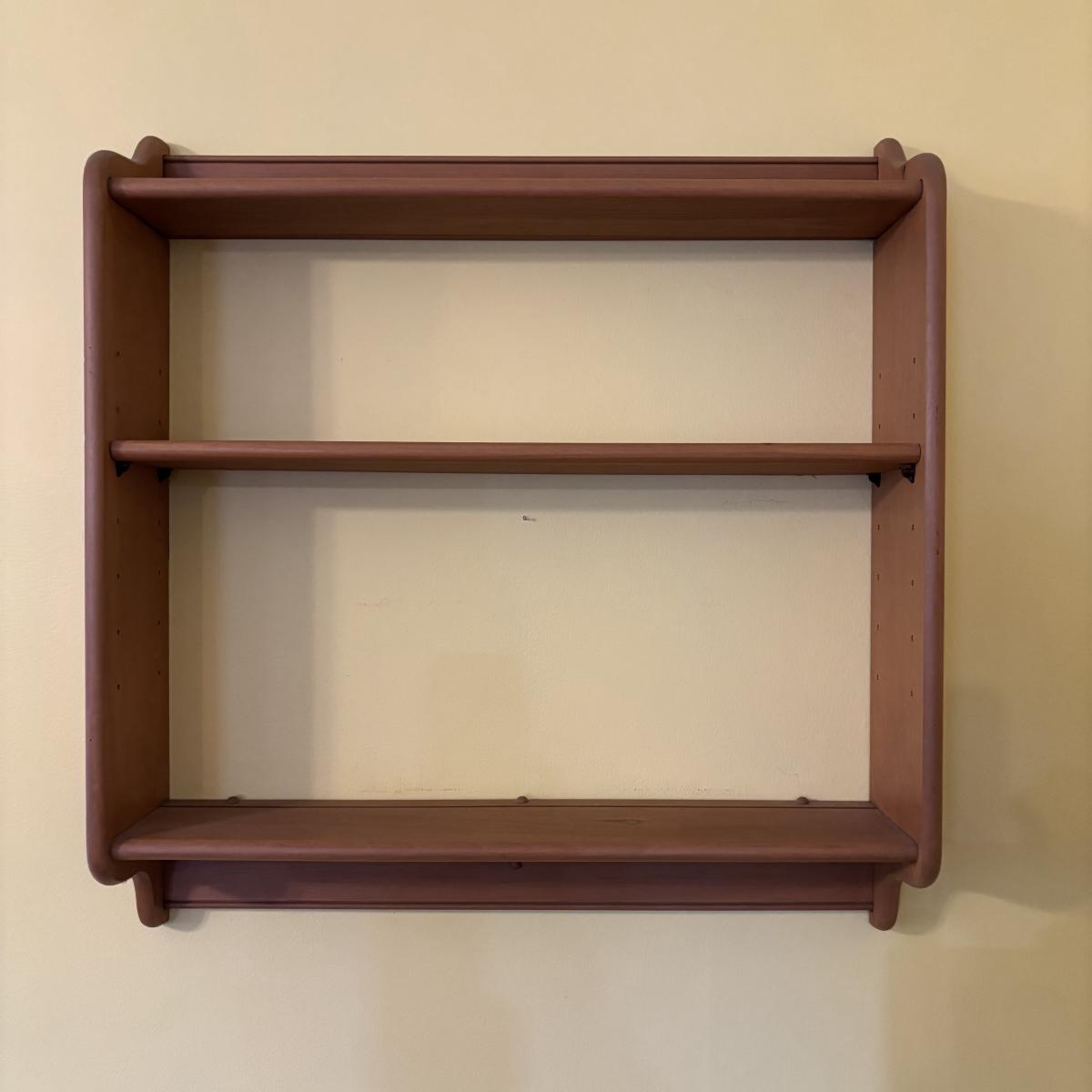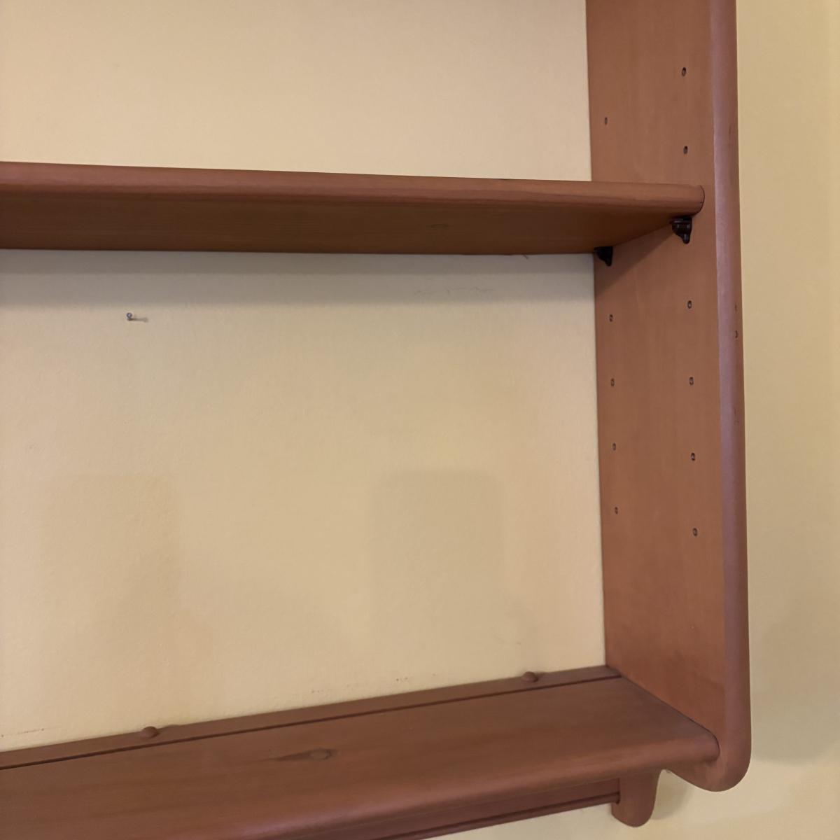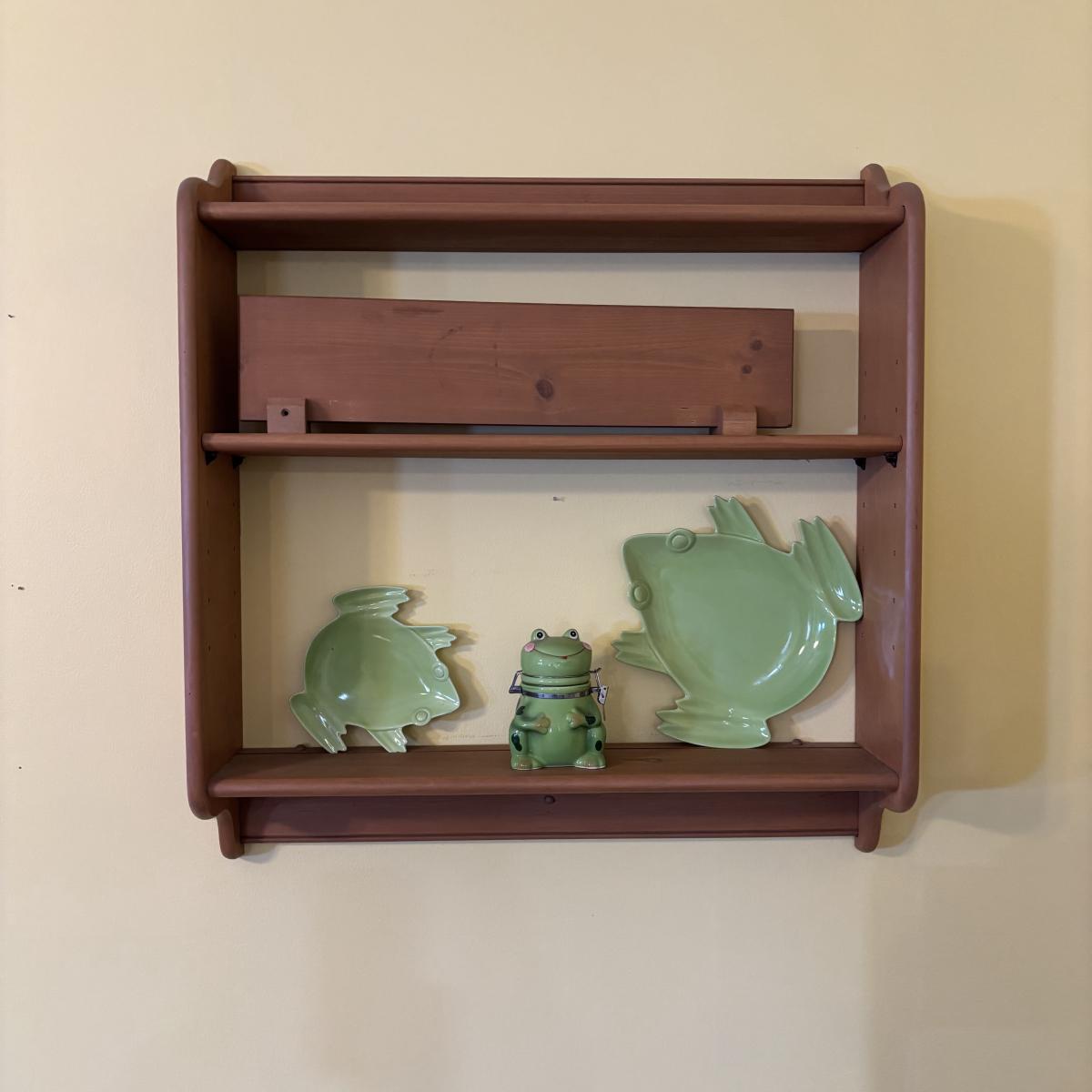 LOT 166: Wooden Adjustable Shelf & Floating Shelf along with Frog Ceramic Platers & Jar