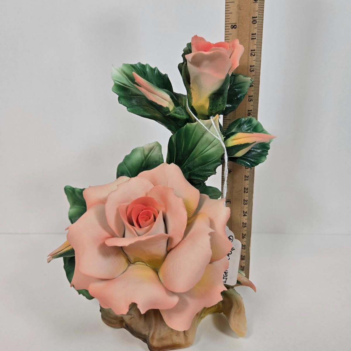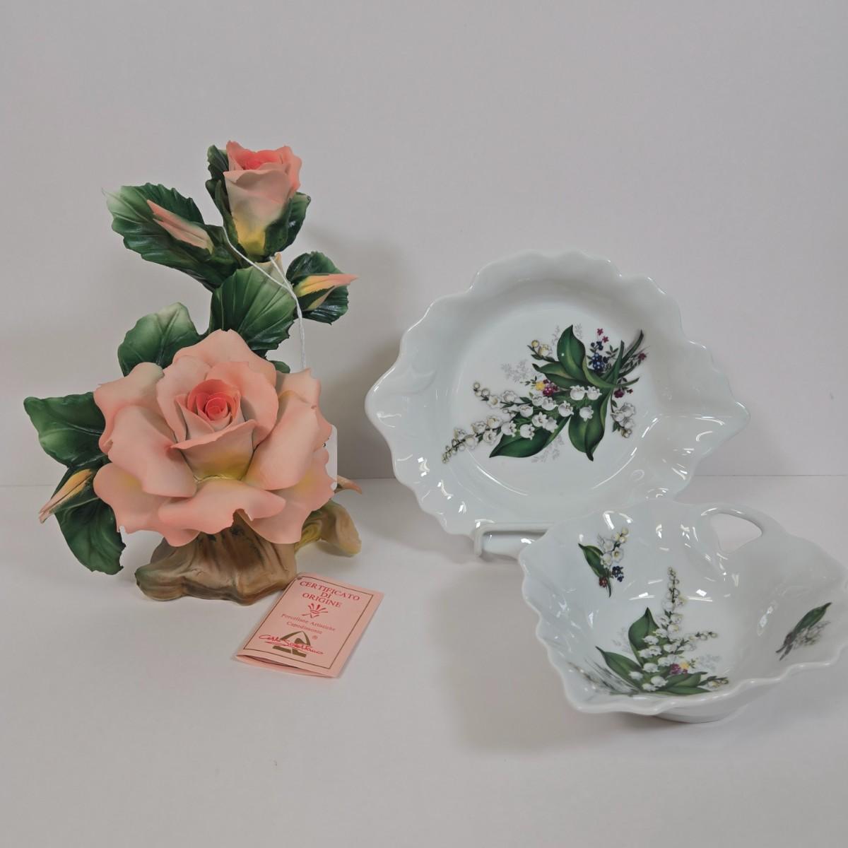 LOT 8: Capodimonte Rose Figurine and Limoges France Set of Small Plate and Bowl with Handle and Spout