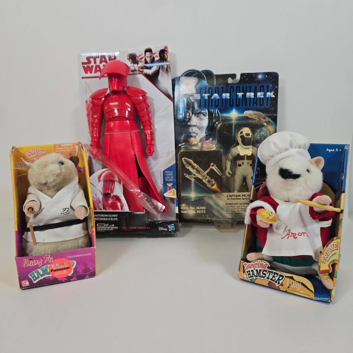 LOT 9: Star Wars Elite Praetorian Guard Action Figure, Playmates Star Trek: First Contact Captain Picard Action Figure, and Two Gemmy Dancing Hamster Toys