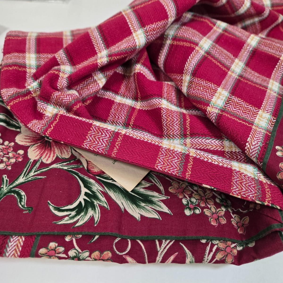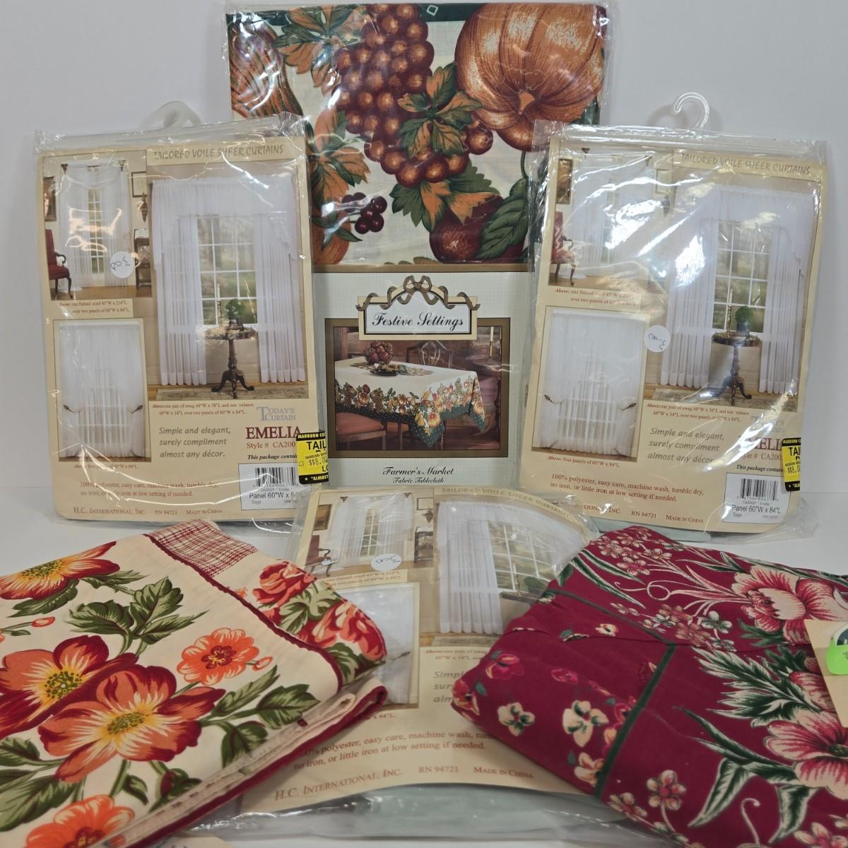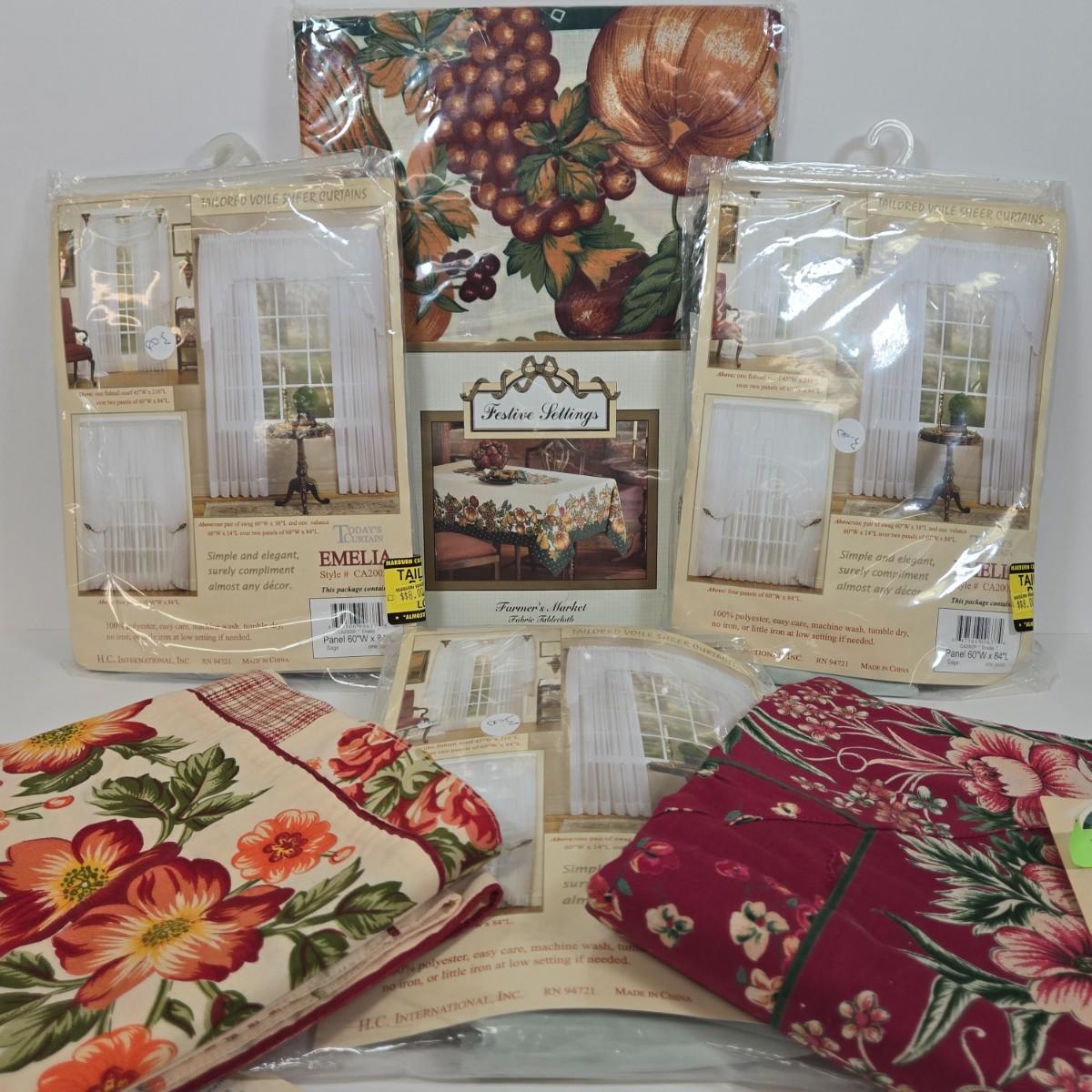 LOT 10: Two Small Square April Cornell Reversible Table Clothes, Three Sheer Curtain Panels, and Avon Home Fashions Tablecloth