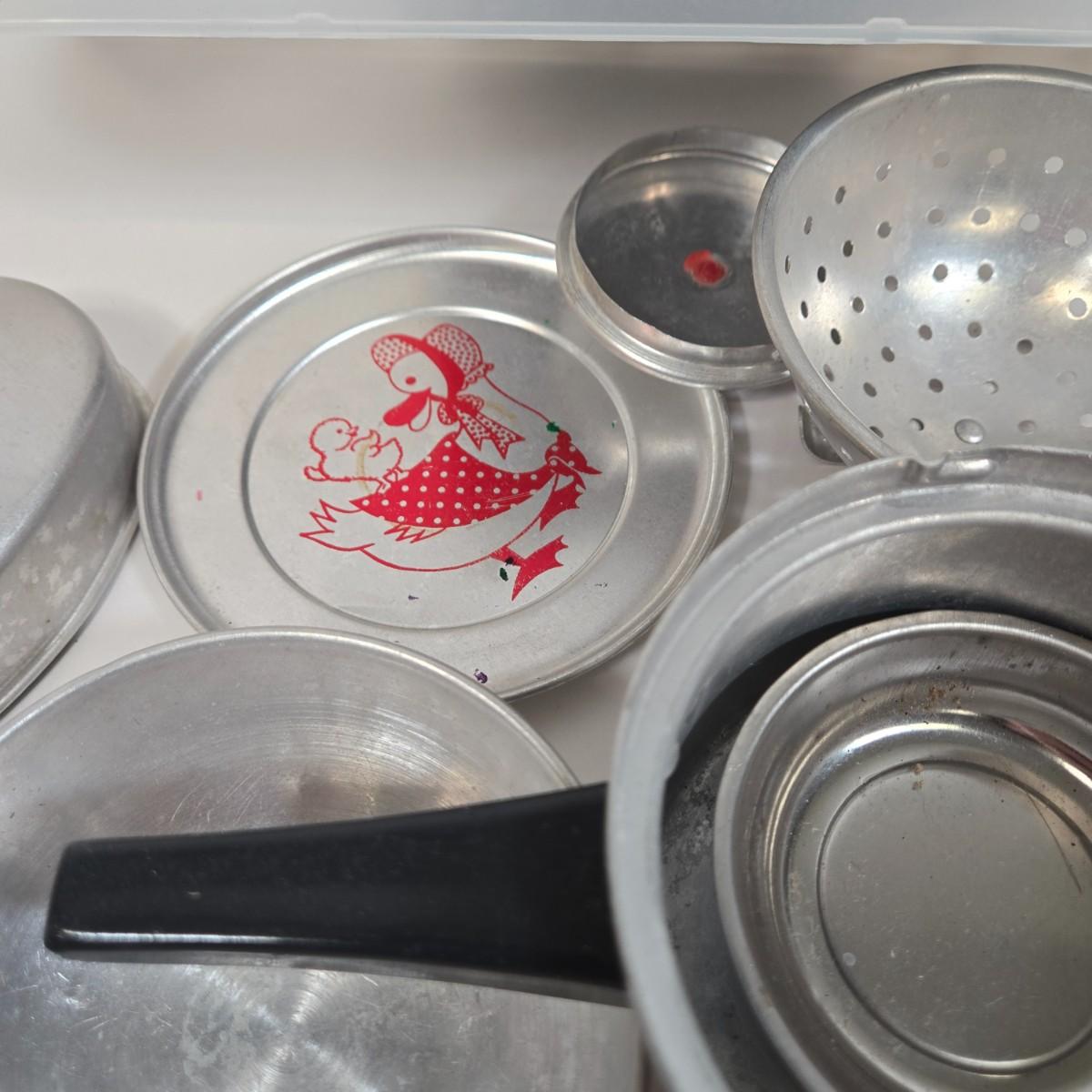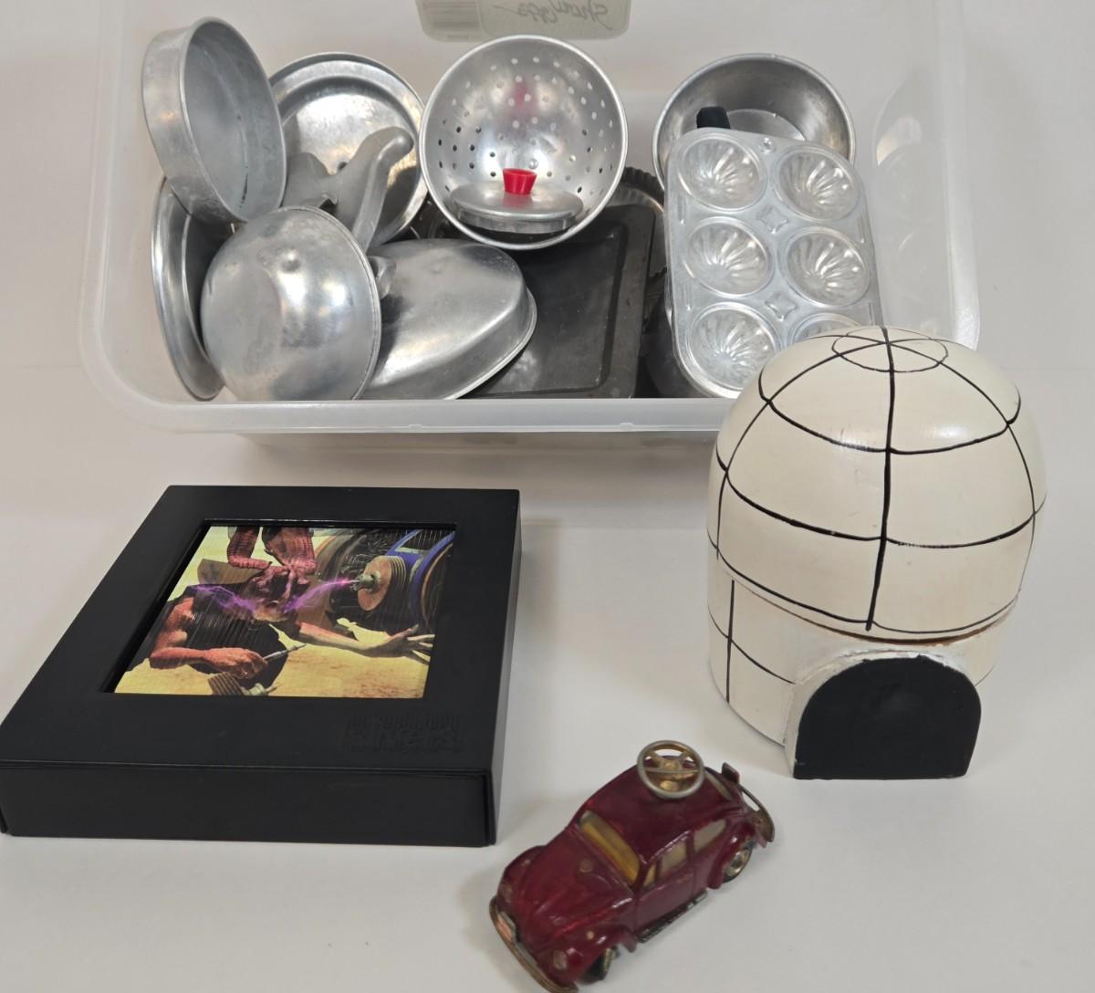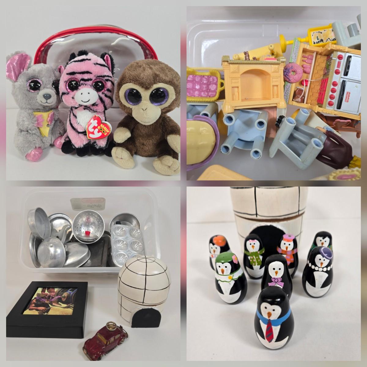LOT 13: Collection of Vintage Children's Aluminum Toy Kitchenware, Vintage Corgi Toys Volkswagen 1300 Saloon, Wooden Igloo Filled with Penguins, Little Tikes Doll House Furniture, and More