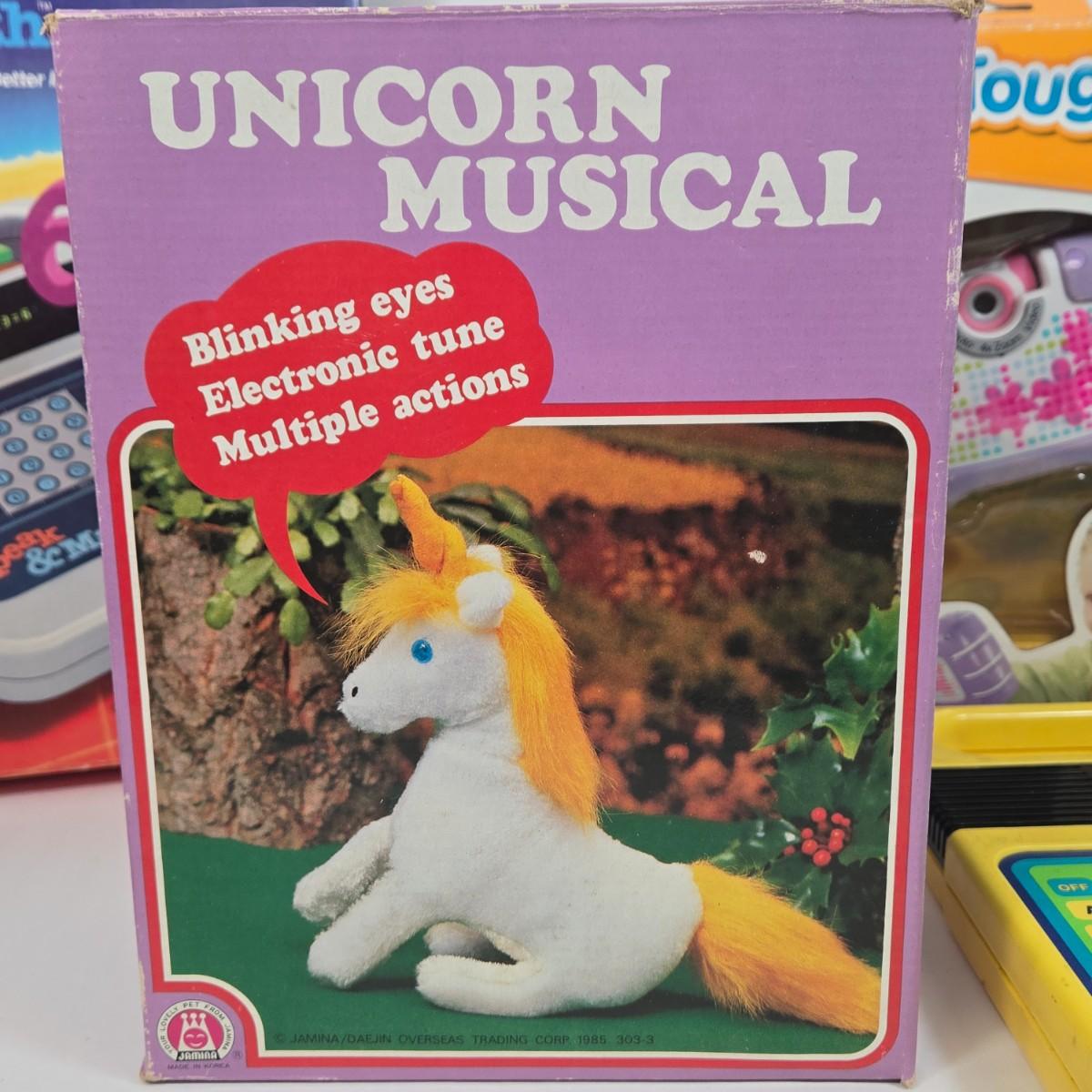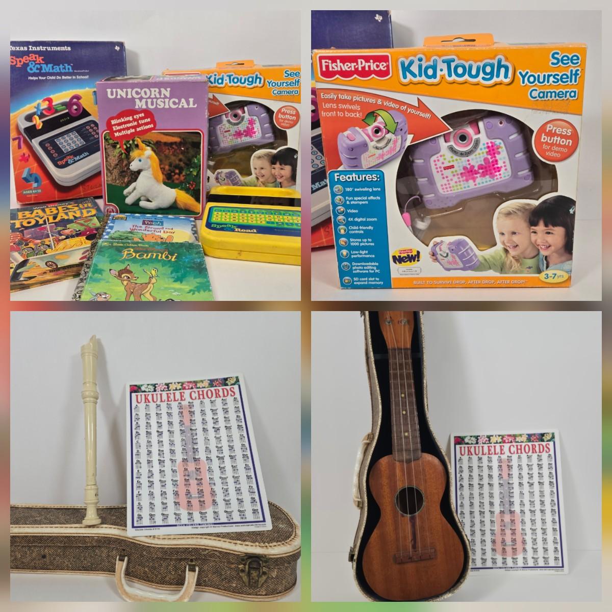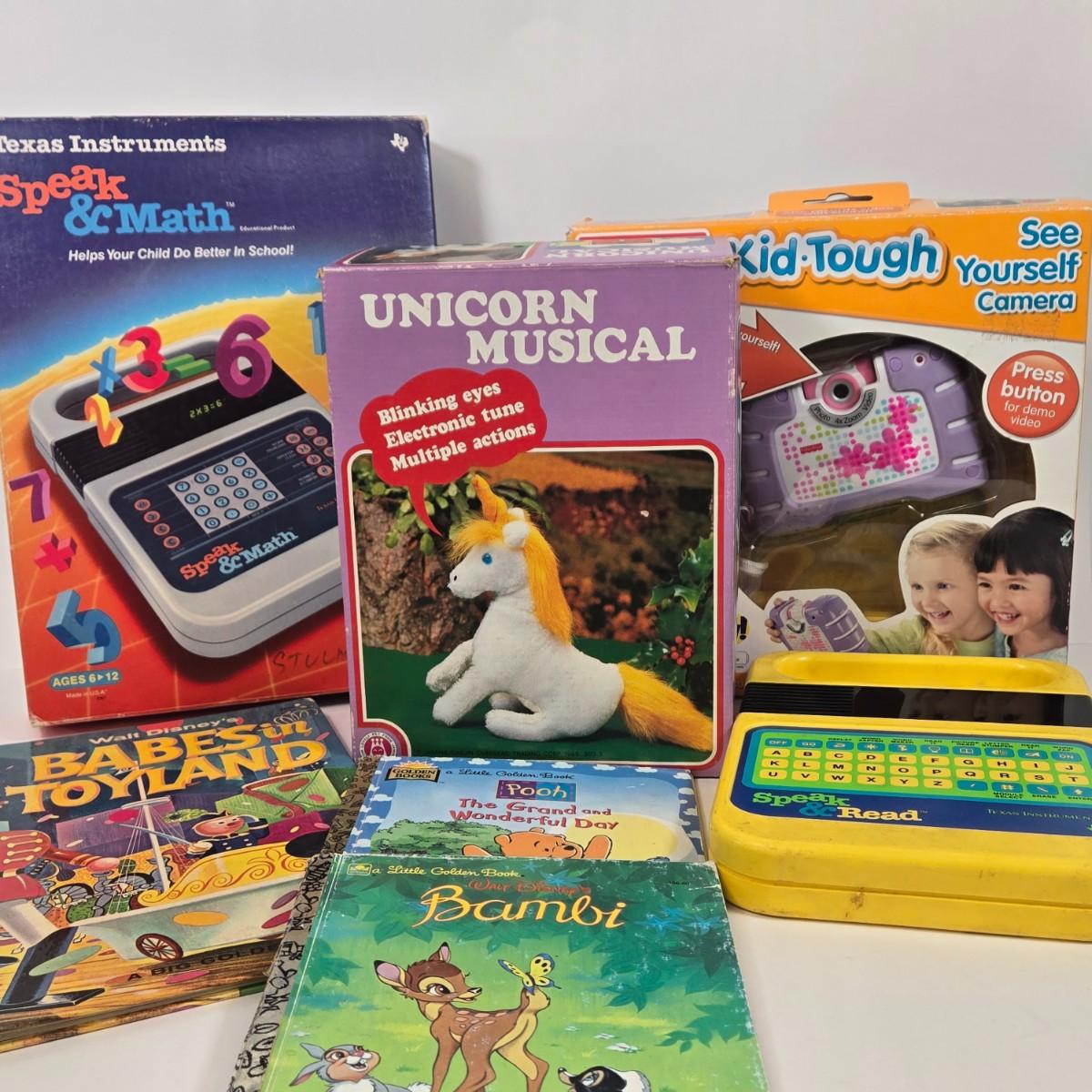 LOT 15: Musical Unicorn Toy, Speak and Math & Speak and Read Electronic Learning Toys, Kid-Tough See Yourself Camera, Walt Disney's Babes In Toyland, 2 Golden Books, Ukulele, and More