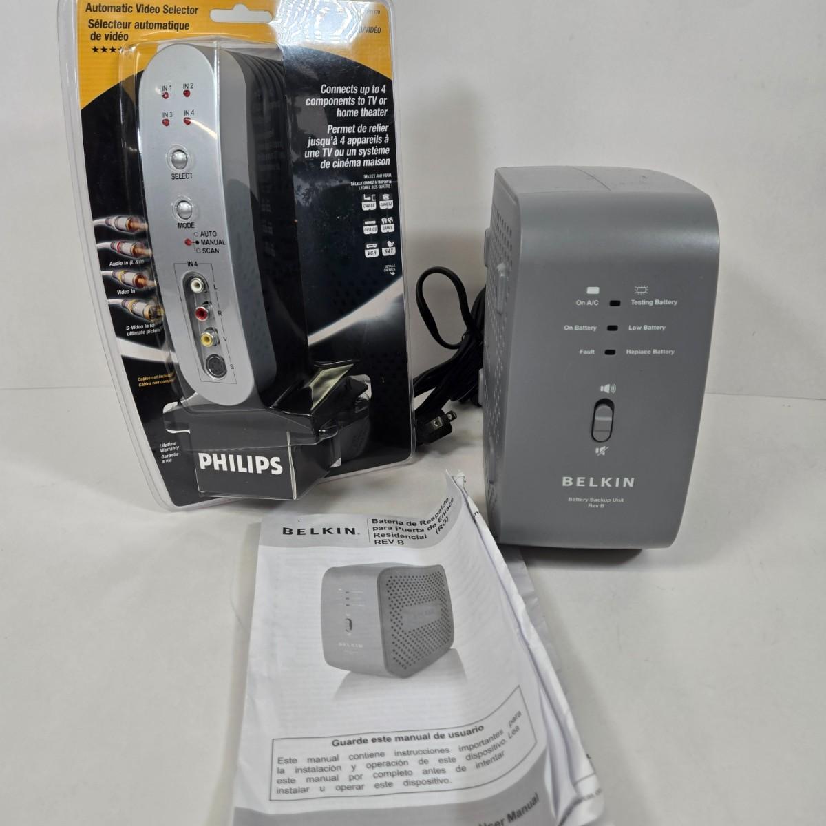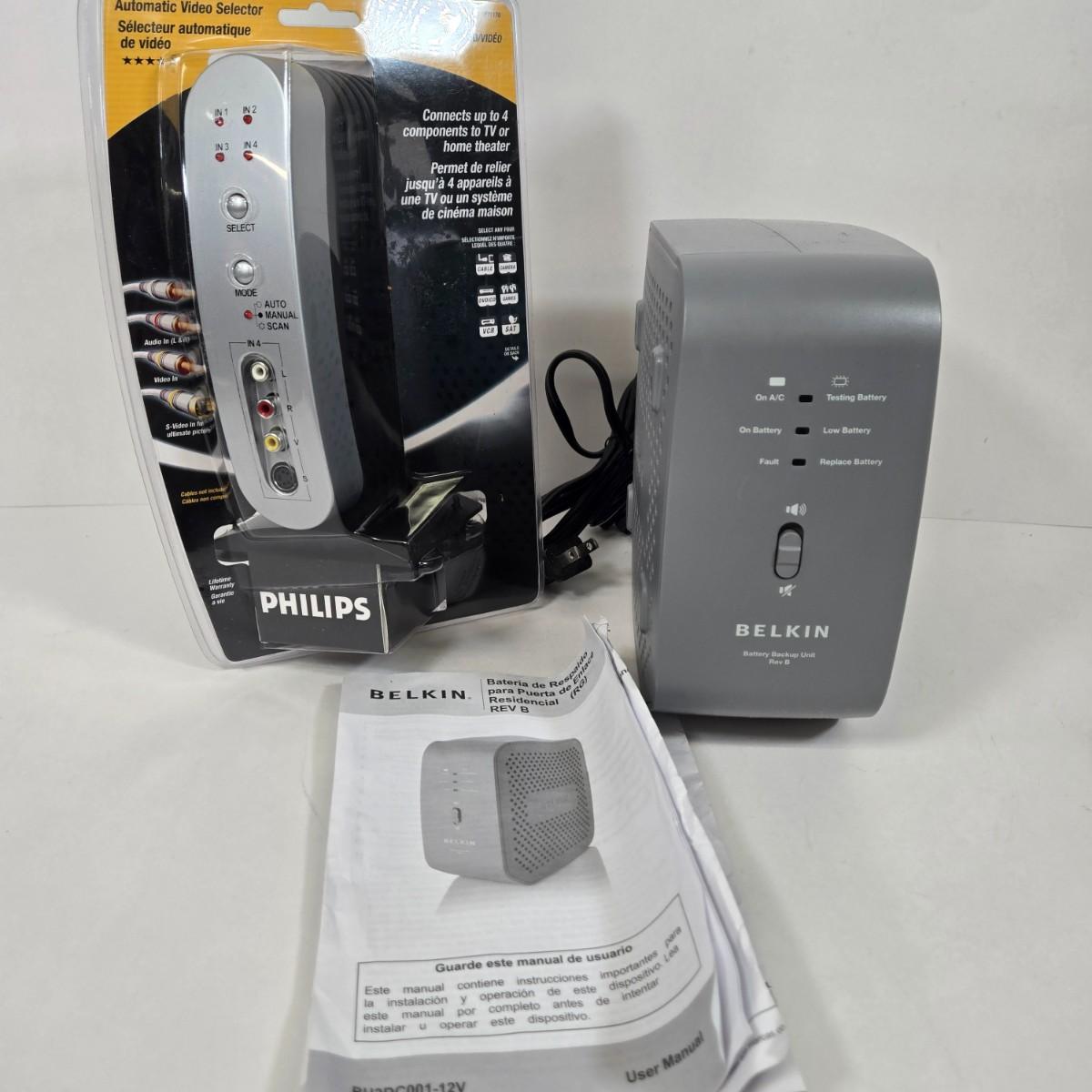 LOT 18: Belkin Residential Gateway RG Battery Backup Battery and Philips AV23293 4-Device Audio/Video Selector Switch.