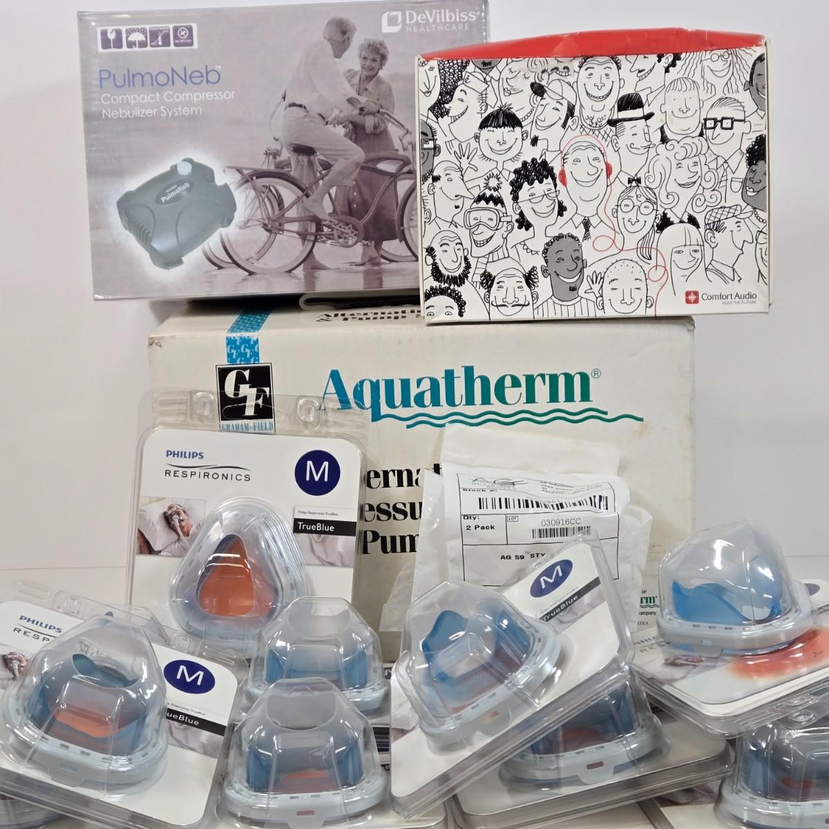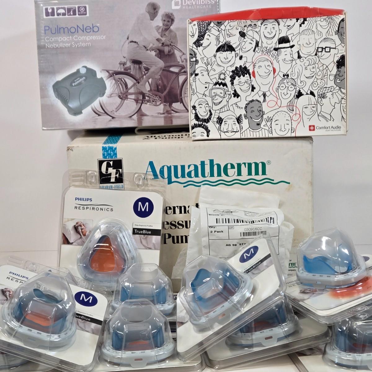 LOT 25: Alternating Pressure Pad & Pump System, DeVilbiss PulmoNeb Compact Compressor Nebulizer System, Comfort Audio Duett Hearing Amplifier Listener, and Multiple Respironics TrueBlue Nasal Cushions