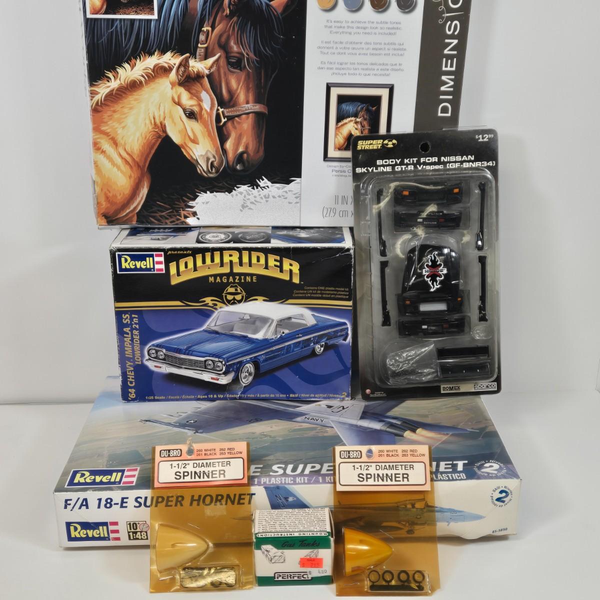 LOT 28: Paint Works by Number, 1964 Chevrolet Impala SS Lowrider 2'n1 1:25 Scale Plastic Model Kit, Revell F/A-18E Super Hornet 1:48 Scale Plastic Model Kit, and More