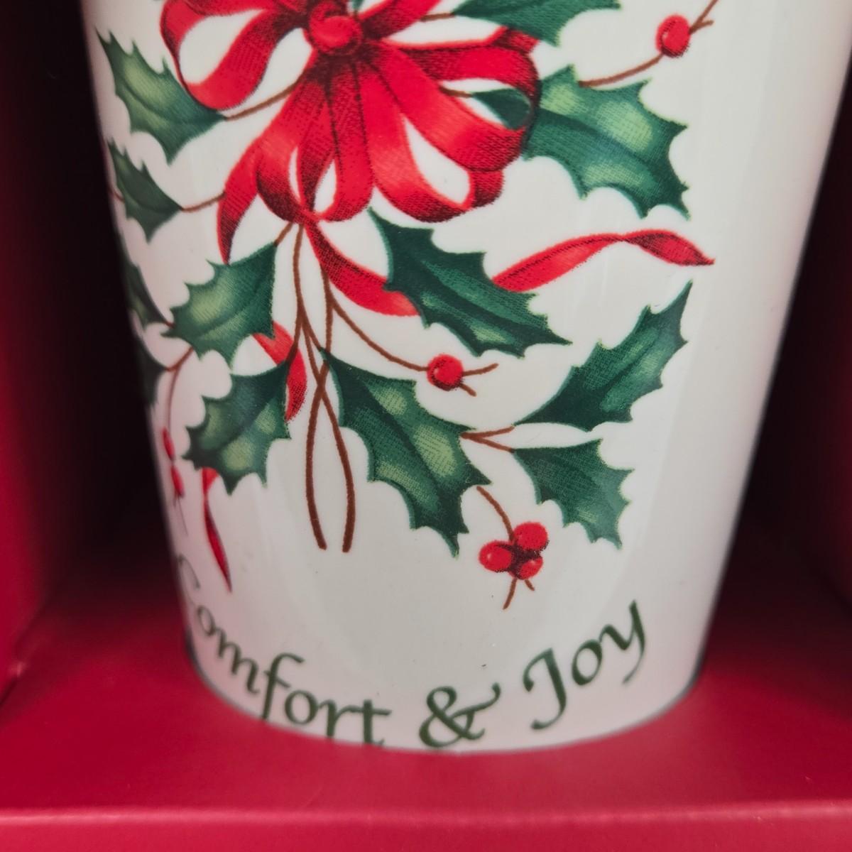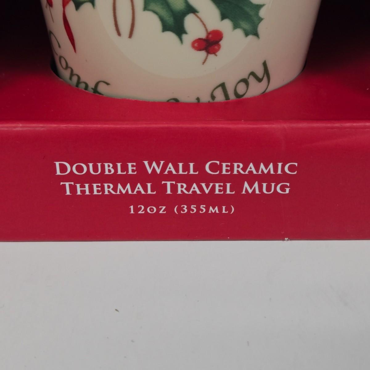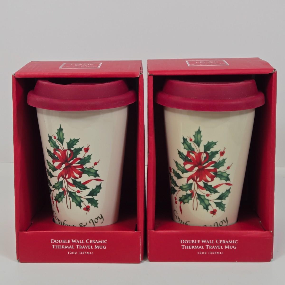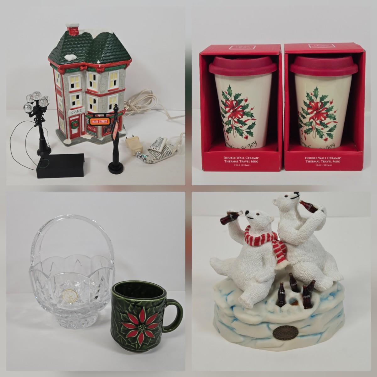LOT 31: House Of Lloyd’s Christmas Around The World Coca-Cola Cafe, Two Holiday Comfort & Joy Double Wall Ceramic Thermal Travel Mugs, Vintage Enesco Poinsettia Ceramic Mug, and More